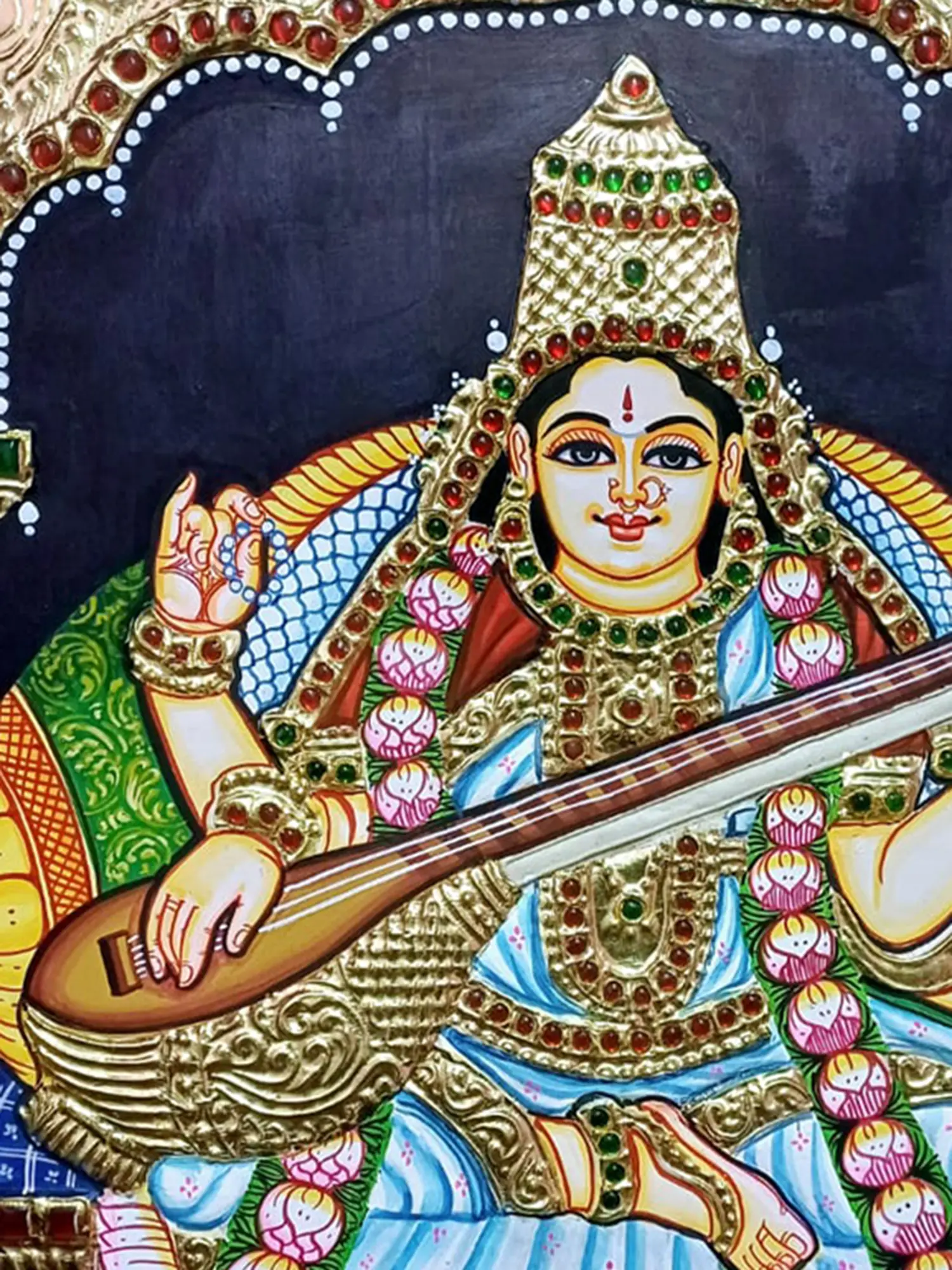 Rich use of gold and vivid colors brings out the aura of Saraswati, seated on a royal throne, wrapped in a white or Shweta saree, with a lotus garland and a smile blossoming on her beautiful face.