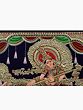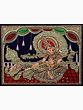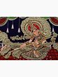 In this horizontally laid Tanjore painting, Goddess Saraswati appears to hover in the limitless expanse, symbolizing the boundless freedom and creative power she bestows upon the world. Her divine form radiates immense grace, adorned with opulent 24 karat gold and meticulously crafted intricate details, embellished with precious gems.