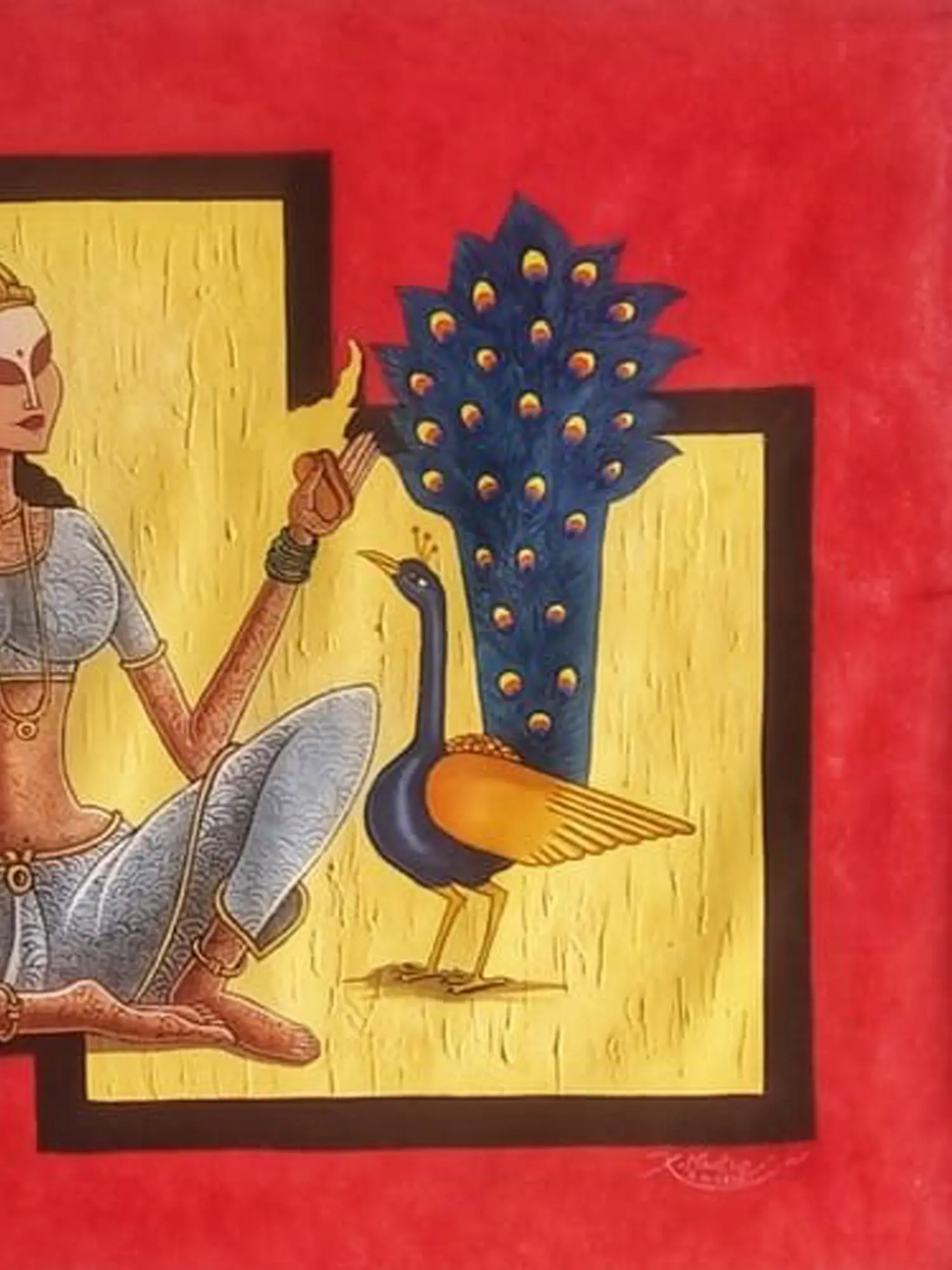 The striking contrast between the deep crimson background and the harmonious interplay of blues, yellows, and earth tones within the central motif creates a captivating visual experience. You'll appreciate the elegant posture of the divine figure, her serene gaze, and the gentle curve of the veena she holds, all designed to evoke a sense of grace. The resplendent peacock, rendered with its characteristic iridescence, stands as a symbol of beauty and royalty, its vibrant plumes a magnificent counterpoint to the musical instrument. The canvas itself, measuring 22 inches in height and 28 inches in width, offers a substantial yet perfectly balanced presence.