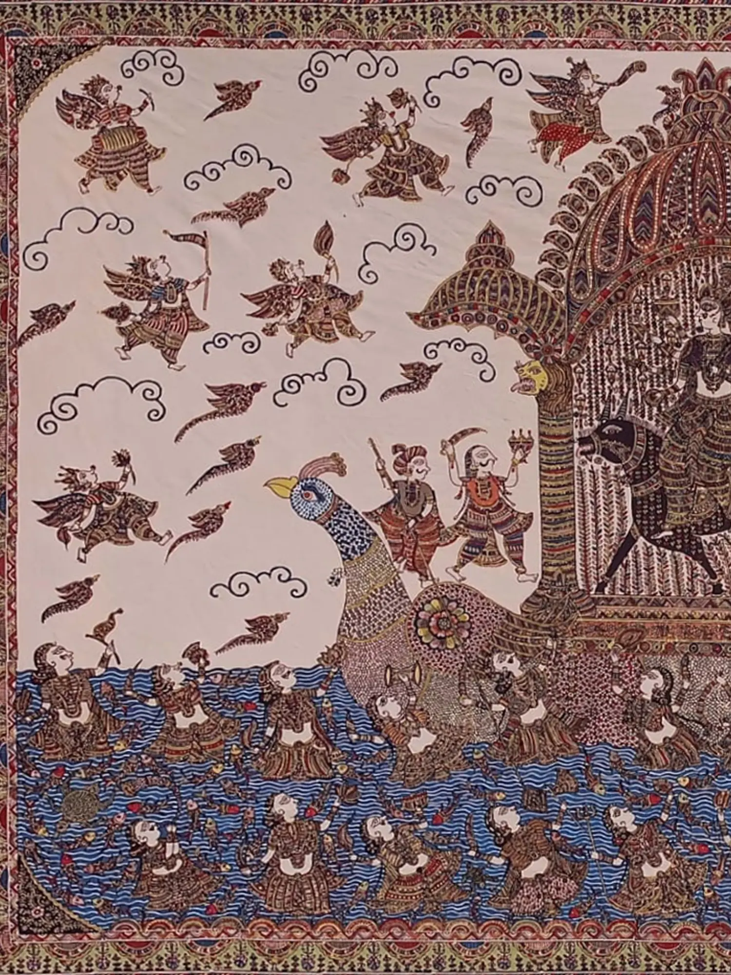 This artwork is a prime example of Mata Ni Pachedi, a revered folk art tradition originating from Gujarat, India. Historically, these cloth paintings served as temple hangings, narrating the stories and glories of goddesses to illiterate devotees. You are acquiring not just a painting, but a piece of living history, a visual chronicle of spiritual devotion passed down through oral traditions and artistic lineage.