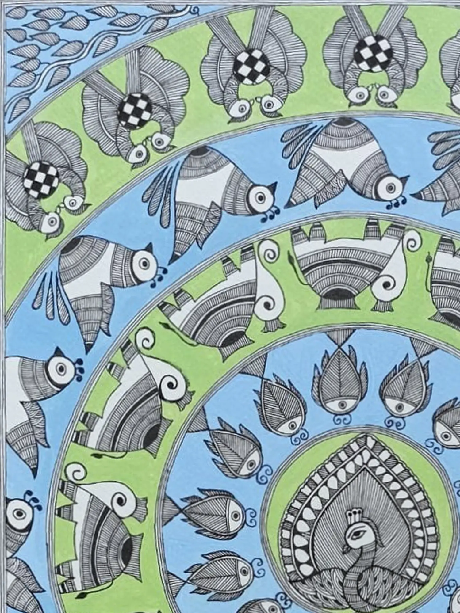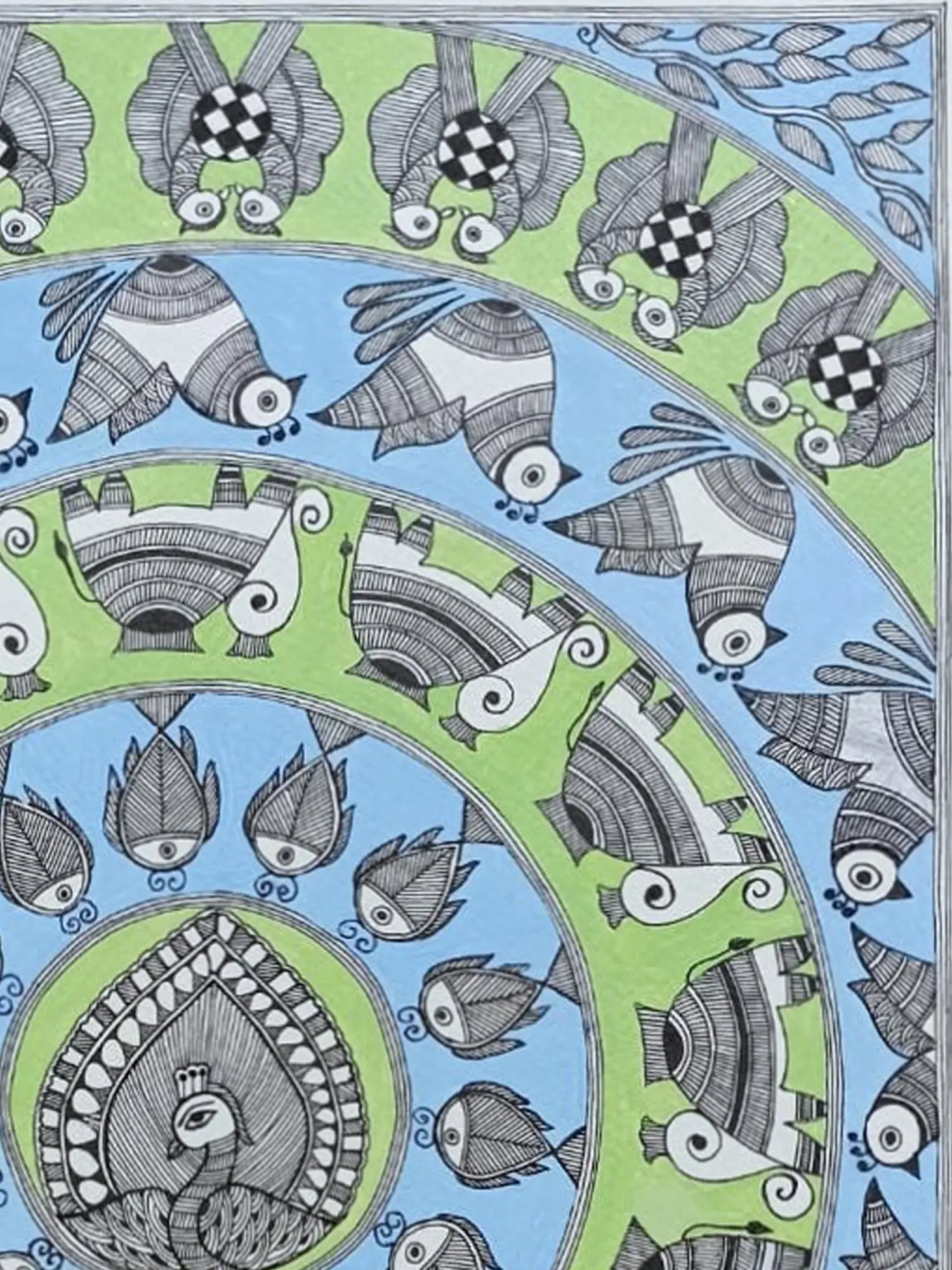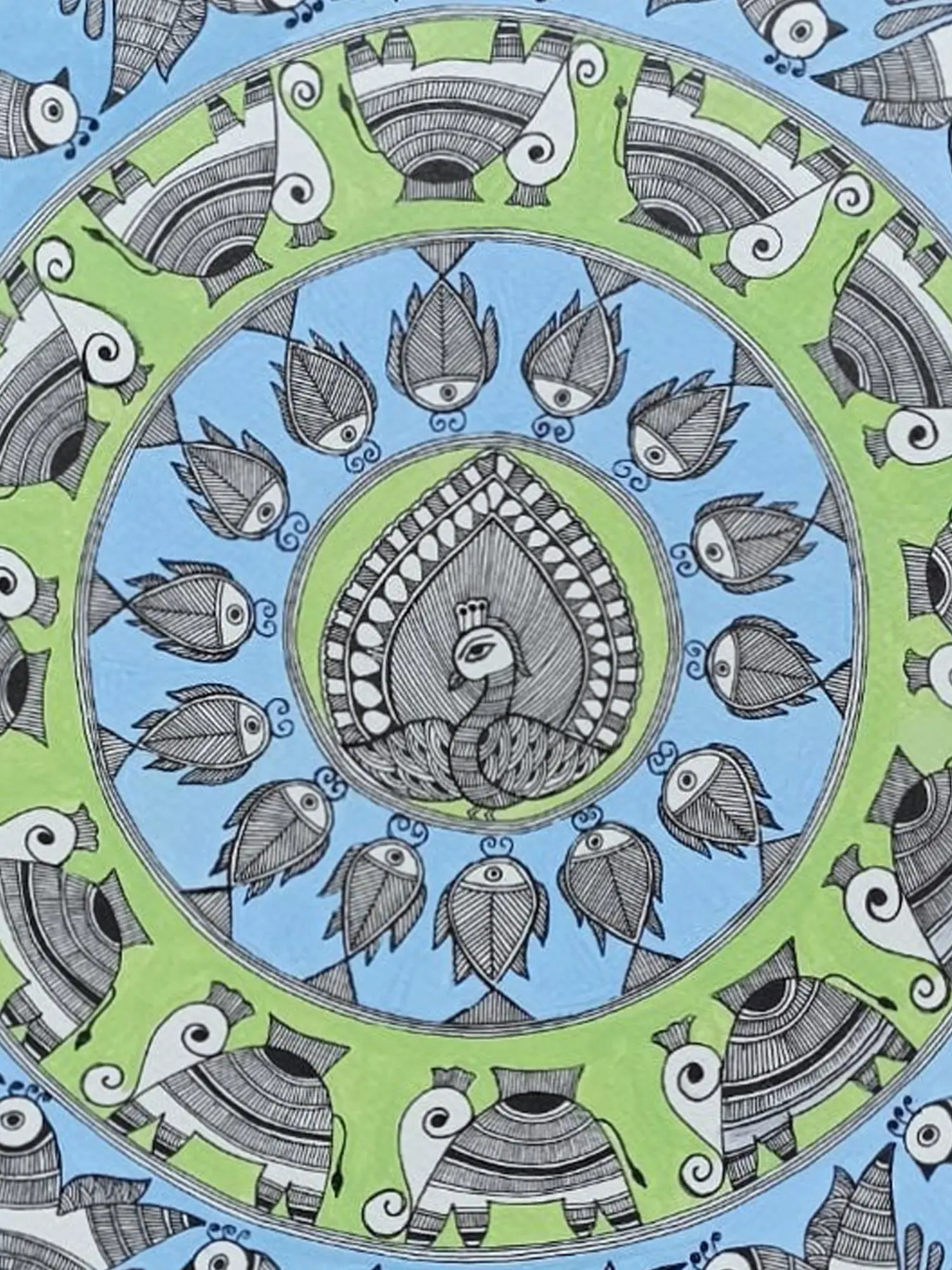 The ancient art of Godna, known for its distinctive tattooing traditions in Jharkhand and central India, has gracefully transcended its original form to breathe life into magnificent artistic expressions. Rooted in tradition, Godna is not merely a fleeting embellishment but an enduring form of body art, persisting even beyond the realms of mortality. The Godna-Bird Fishes and Elephant masterpiece stands as a testament to the timeless craft of tattooing, seamlessly preserving the essence of this unique body adornment while transmuting sacred images of Fishes, Birds, and Elephants into captivating wall decor or paintings. The canvas unfolds a symphony of pastel shades meticulously crafted into circular shapes, housing intricate black-lined depictions of fauna. Reflecting a harmonious blend of Godna and Madhubani traditions, the circular arrangement pays homage to the rich heritage of this art form.