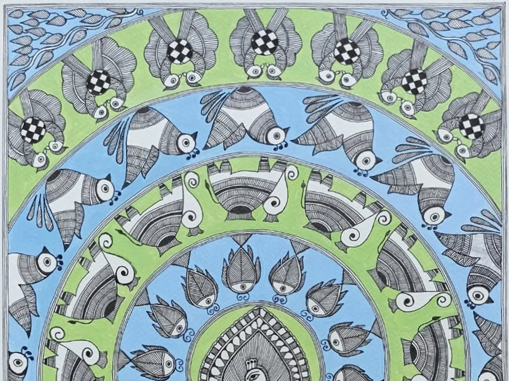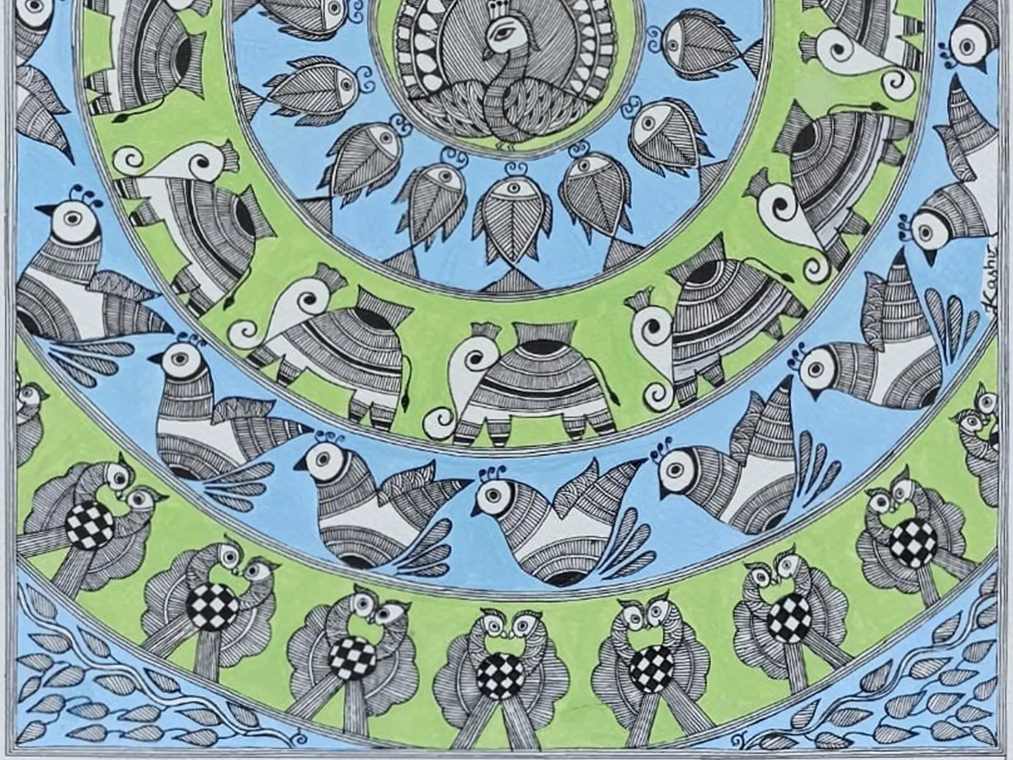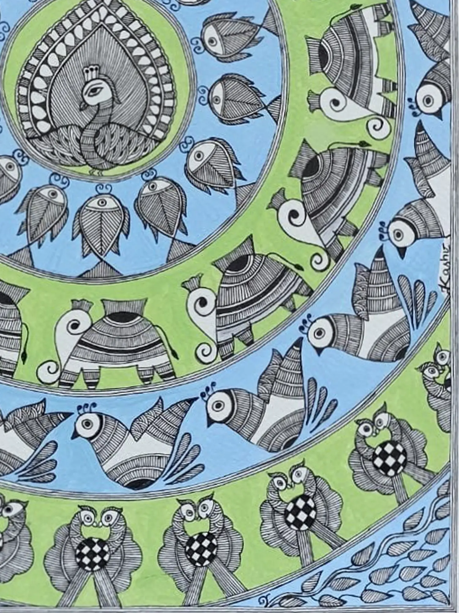 The ancient art of Godna, known for its distinctive tattooing traditions in Jharkhand and central India, has gracefully transcended its original form to breathe life into magnificent artistic expressions. Rooted in tradition, Godna is not merely a fleeting embellishment but an enduring form of body art, persisting even beyond the realms of mortality. The Godna-Bird Fishes and Elephant masterpiece stands as a testament to the timeless craft of tattooing, seamlessly preserving the essence of this unique body adornment while transmuting sacred images of Fishes, Birds, and Elephants into captivating wall decor or paintings. The canvas unfolds a symphony of pastel shades meticulously crafted into circular shapes, housing intricate black-lined depictions of fauna. Reflecting a harmonious blend of Godna and Madhubani traditions, the circular arrangement pays homage to the rich heritage of this art form.