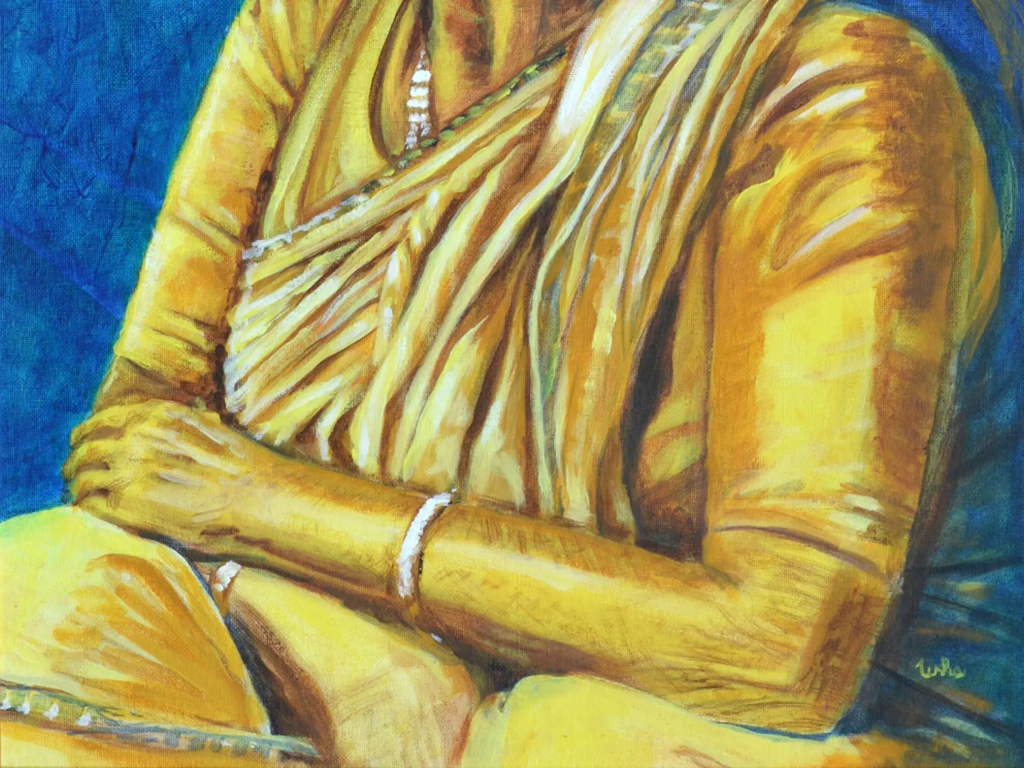 The artist expertly employs light and shadow to sculpt the subject's features, revealing the depth of character etched by time. The luxurious yellow of the traditional garment drapes fluidly, its folds catching the light with an almost palpable warmth. Observe the subtle details, from the delicate pearl earring to the gleam of a bracelet, each adding a layer of refined elegance to the composition, a canvas measuring 20 inches in height by 16 inches in width.