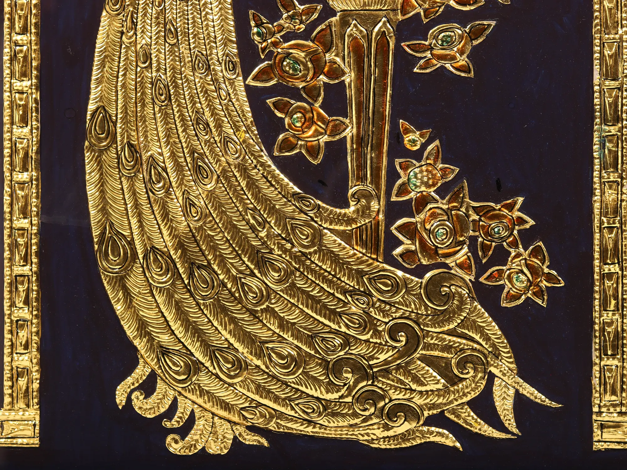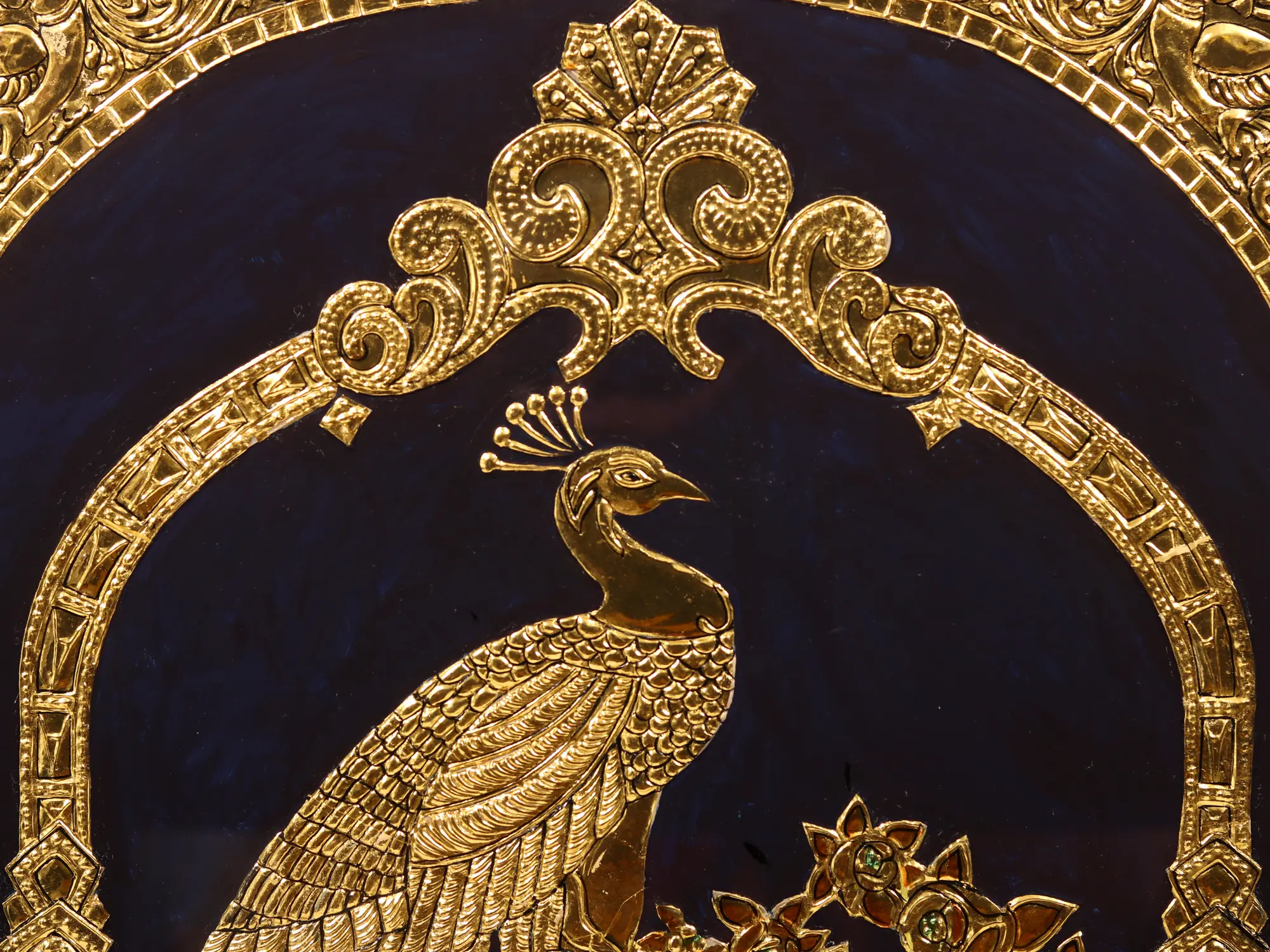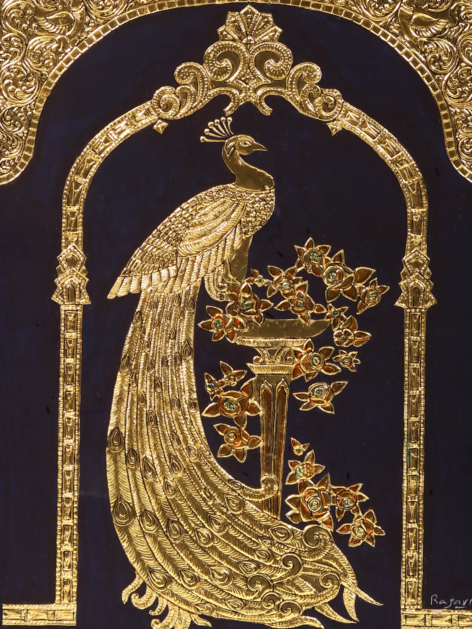 Behold the majestic Golden Peacock, an embodiment of grace and opulence in this stunning Tanjore artwork. Its intricate long tail, adorned with shimmering goldwork, captures the essence of beauty and magnificence. This piece is not merely ordinary; it's a testament to human craftsmanship's ability to transform nature into divine art.