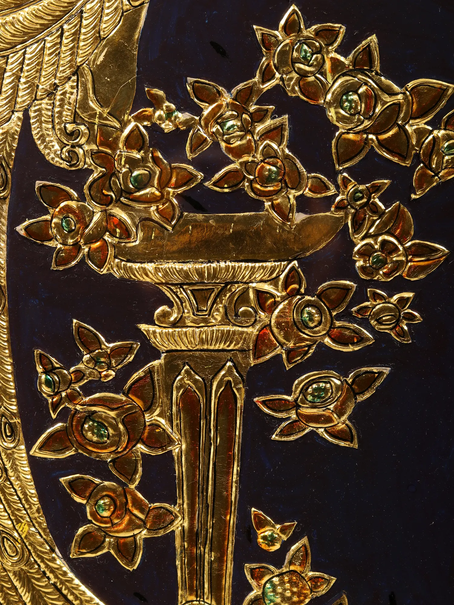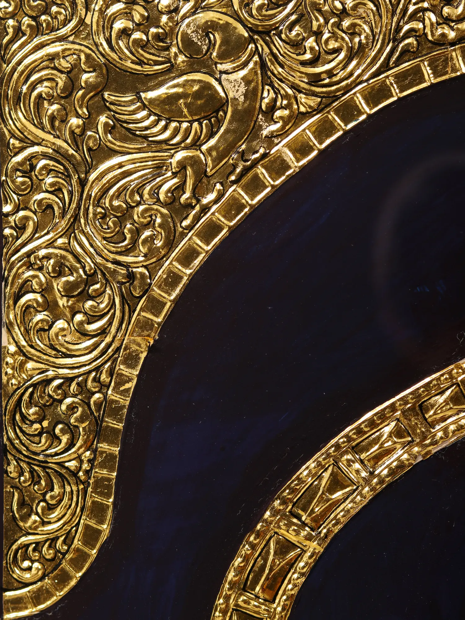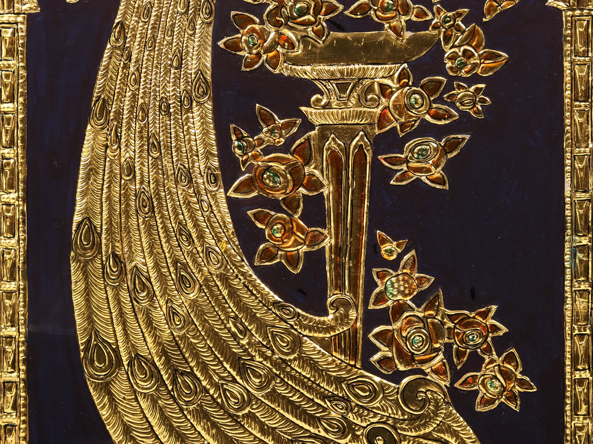 Behold the majestic Golden Peacock, an embodiment of grace and opulence in this stunning Tanjore artwork. Its intricate long tail, adorned with shimmering goldwork, captures the essence of beauty and magnificence. This piece is not merely ordinary; it's a testament to human craftsmanship's ability to transform nature into divine art.