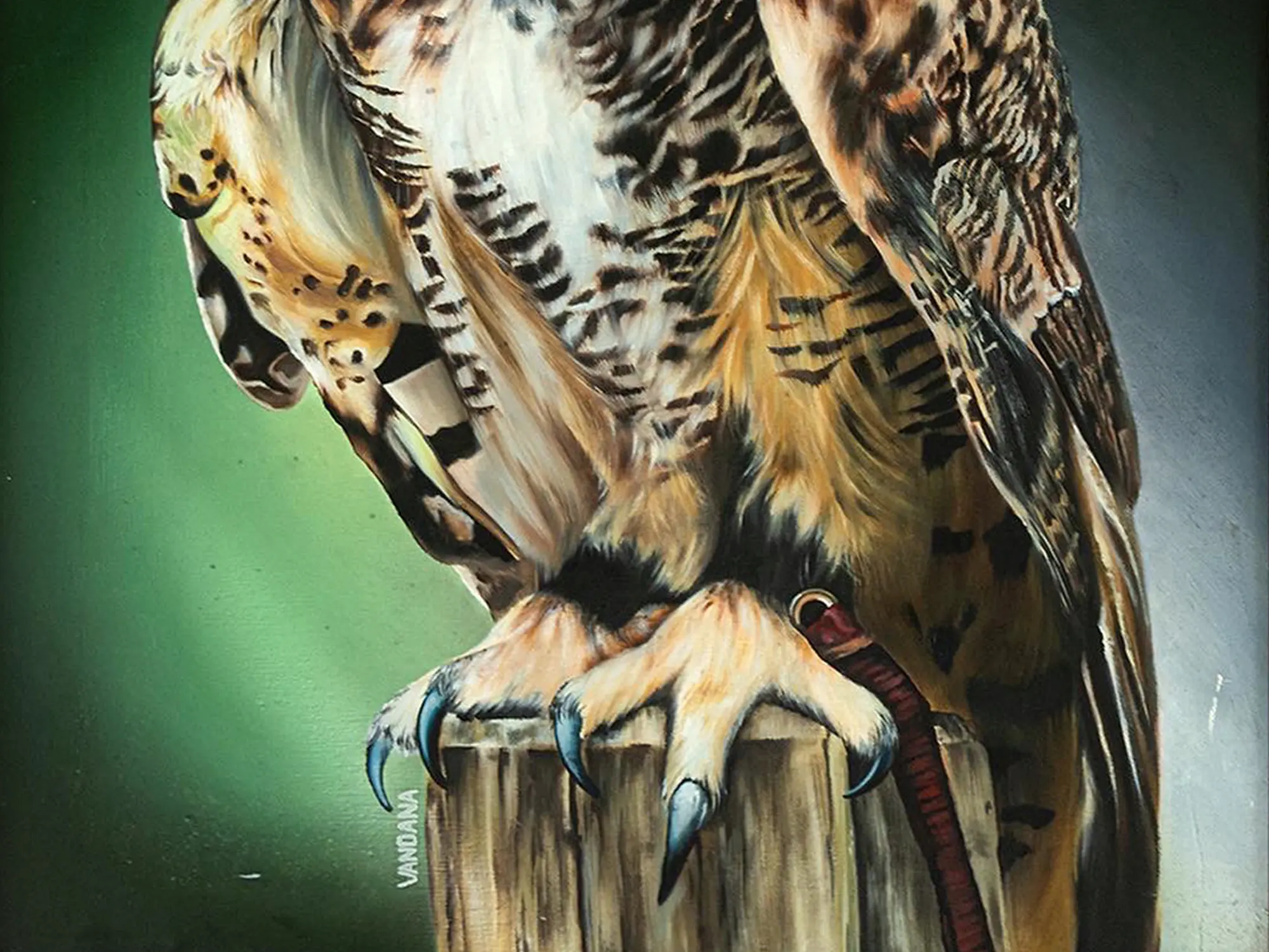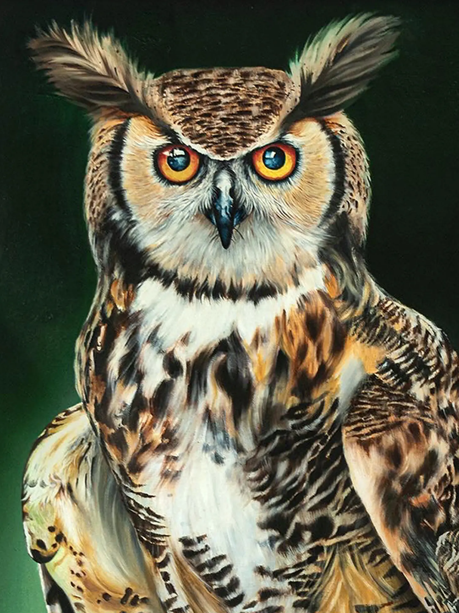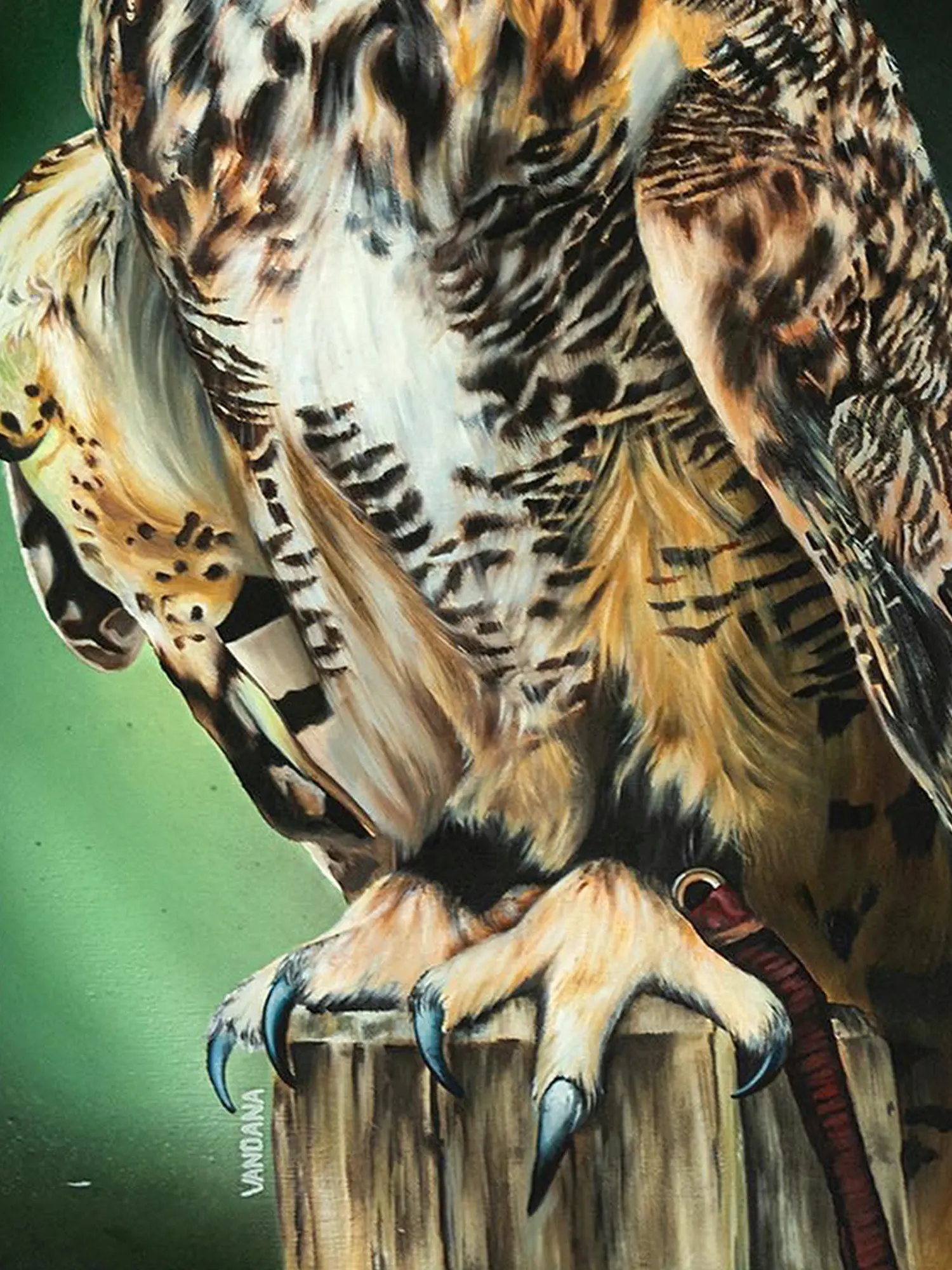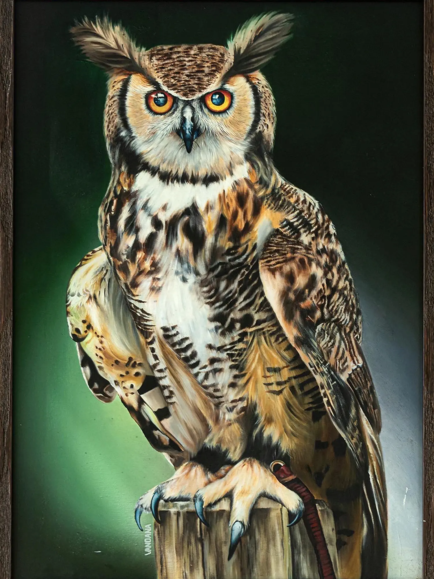 Owls are considered important in many cultures. Owls represent inner wisdom, change, metamorphosis, intuitive growth, good fortune, and self-actualization. Vandana Verma having her expertise in Oil on Linen Cotton Canvas tries to bring out the virtues of the Owl through her painting title- "Goodluck Owl". Here Vandana tries to create the image of the Great Horned Owl, a native of North America. Great Horned Owls have incredibly soft feathers that protect them from the cold winter weather and allow them to fly very quietly in pursuit of prey. Their small, broad wings let them move freely through the jungle.