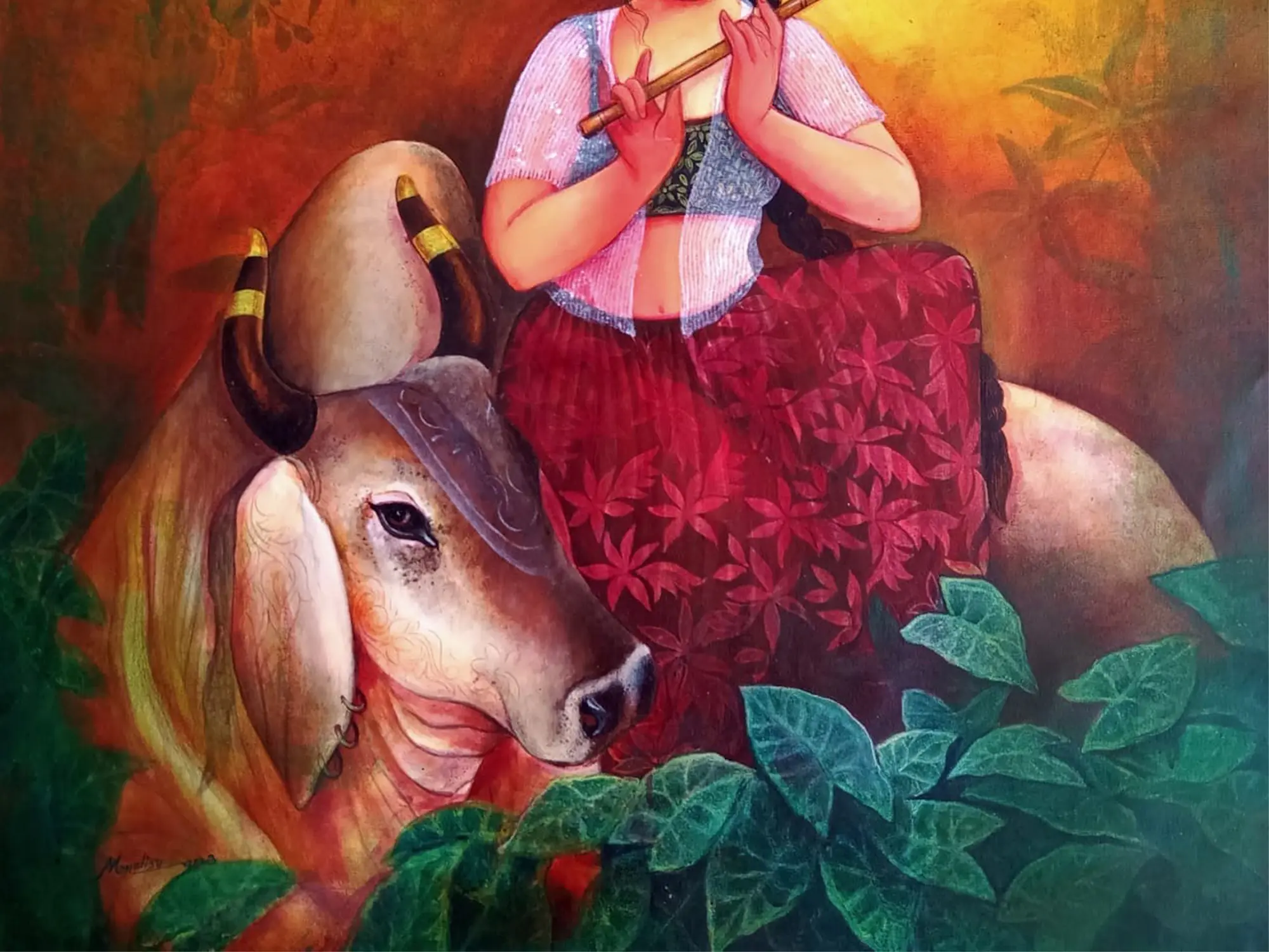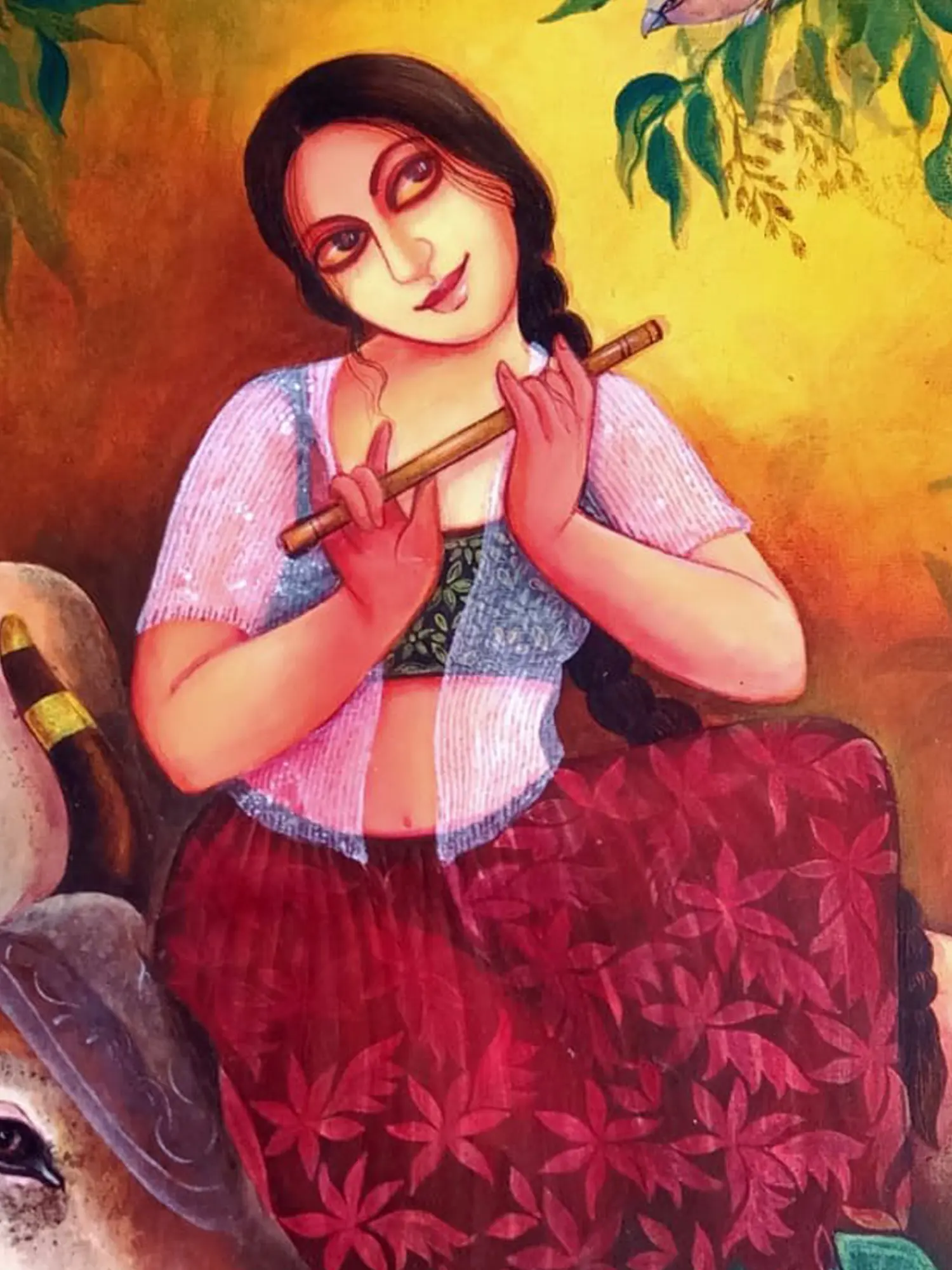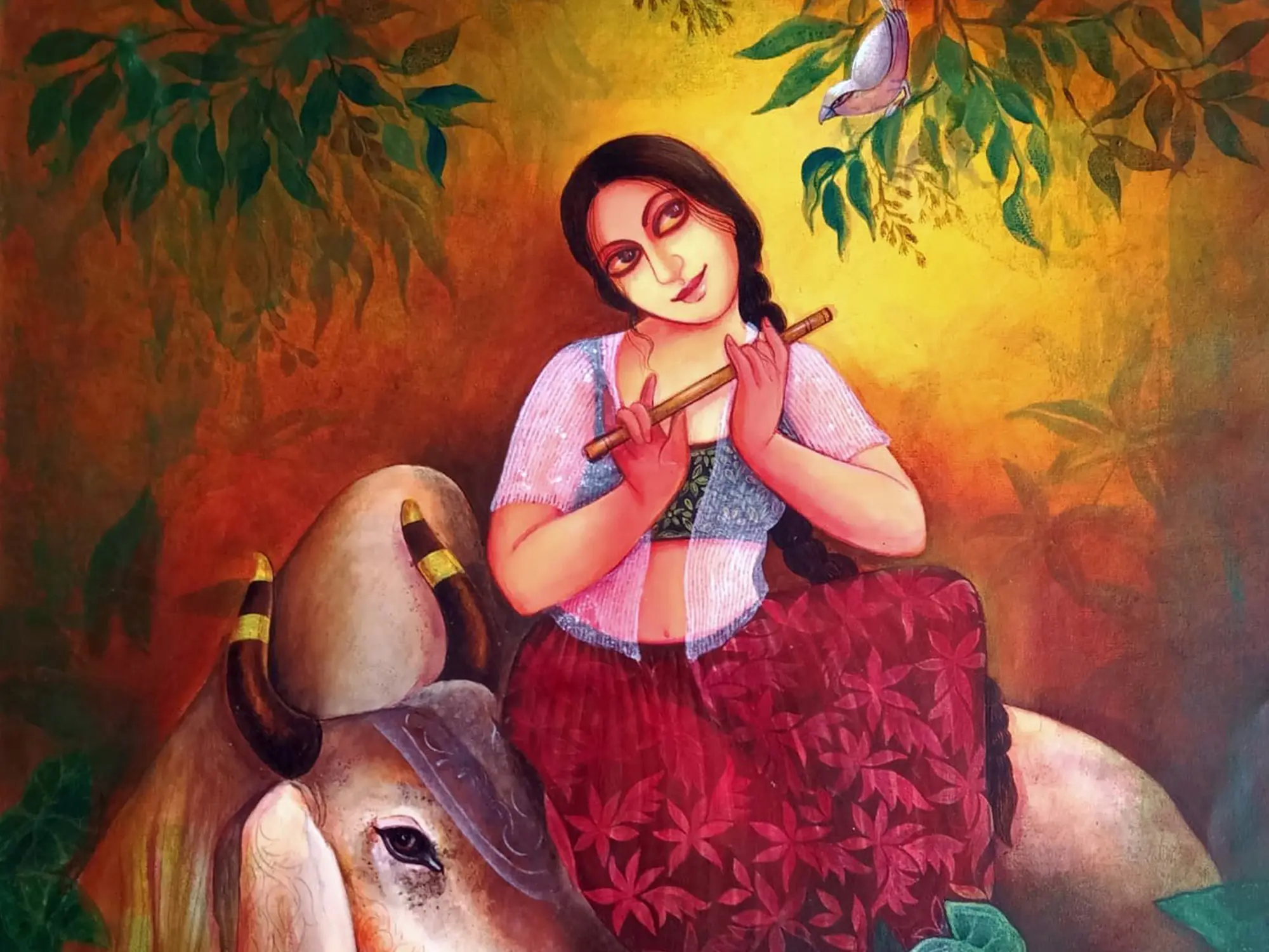 With Holy Cow-Friendship" - Acrylic hues portray a Gopi engrossed in