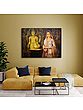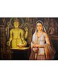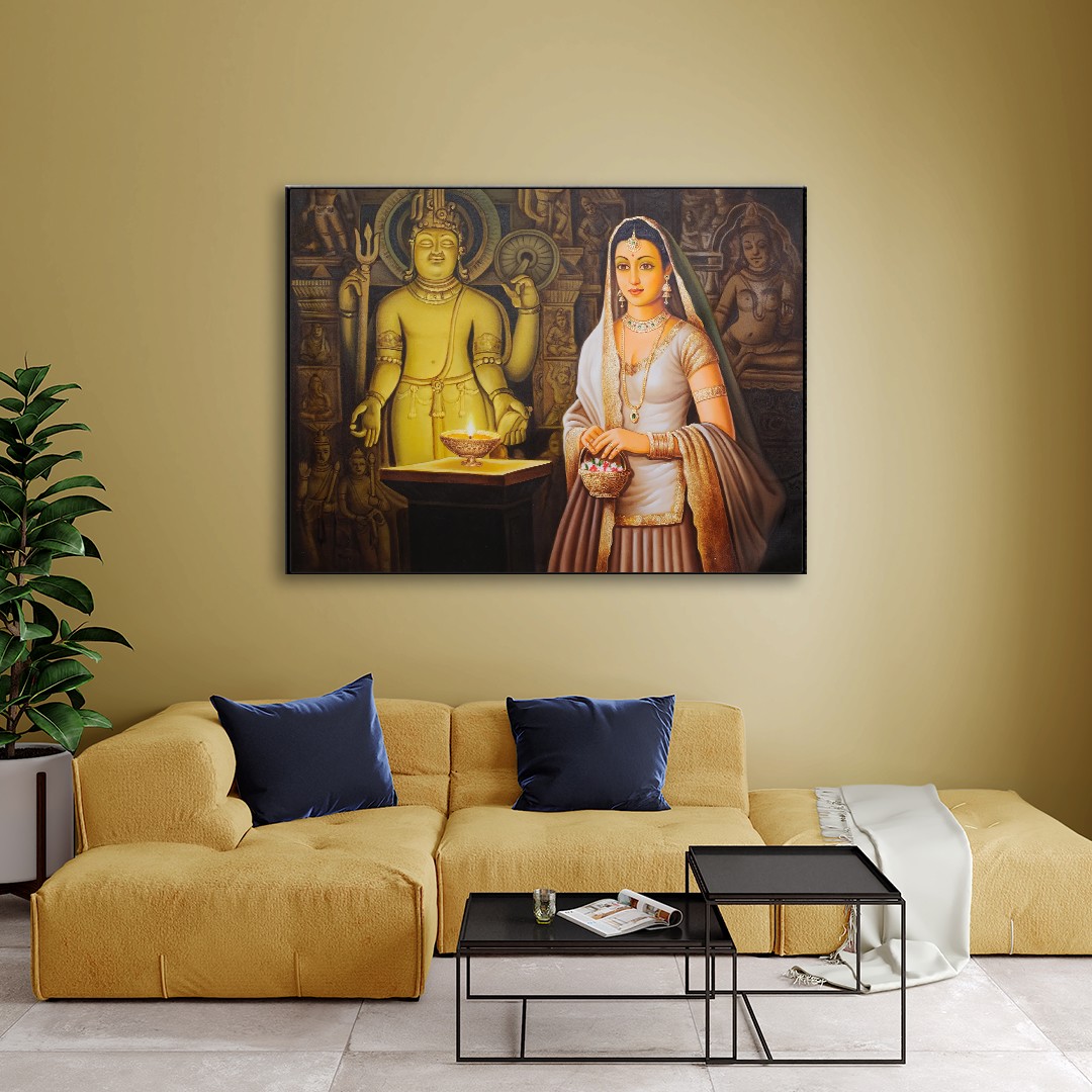 She is in a spacious poojana-kaksha, which is probably the family altar of her new sasuraala. Where the artist has captured her is her favourite corner because therein resides her Lord Shiva in the larger-than-life murti in the background. A number of minor deities grace His aureole, and Devi Parvati is seated in lalitasana nearby (to the right of the background). The rock-cut sculptures are as gorgeous as the lady who has lit the lamp before them.