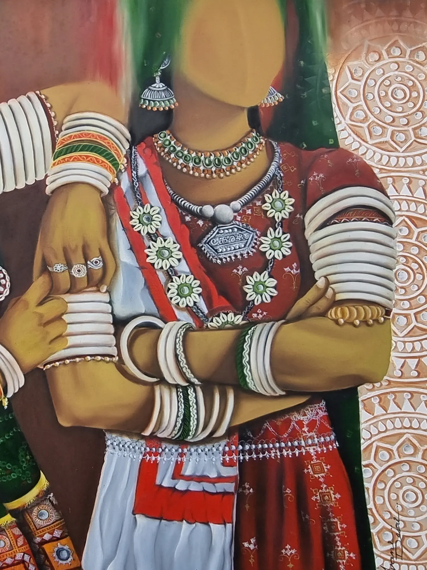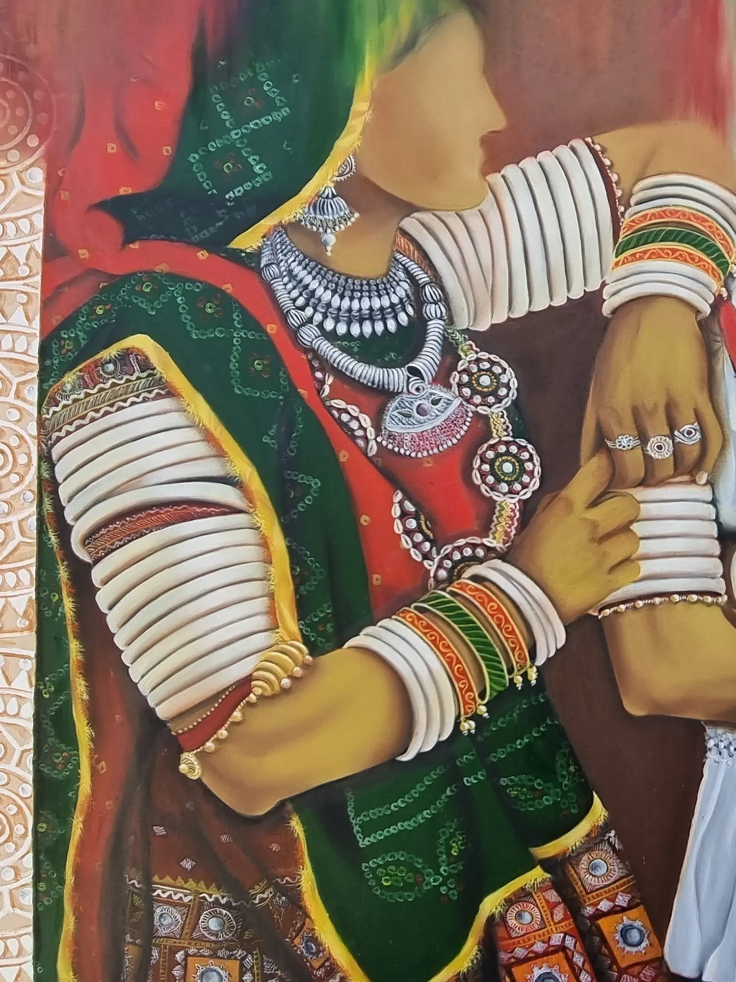 The composition, measuring 30.00 inches in height and 40.00 inches in width, showcases the artist's keen eye for detail. You'll appreciate the intricate depiction of traditional adornments, from the gleaming silver necklaces and statement earrings to the abundance of bangles encircling the wrists. The rich textiles, adorned with subtle patterns and vibrant colors, are rendered with a textural quality that almost allows you to feel their weave. The flanking decorative borders add a layer of cultural richness and frame the central figures with an elegant border.