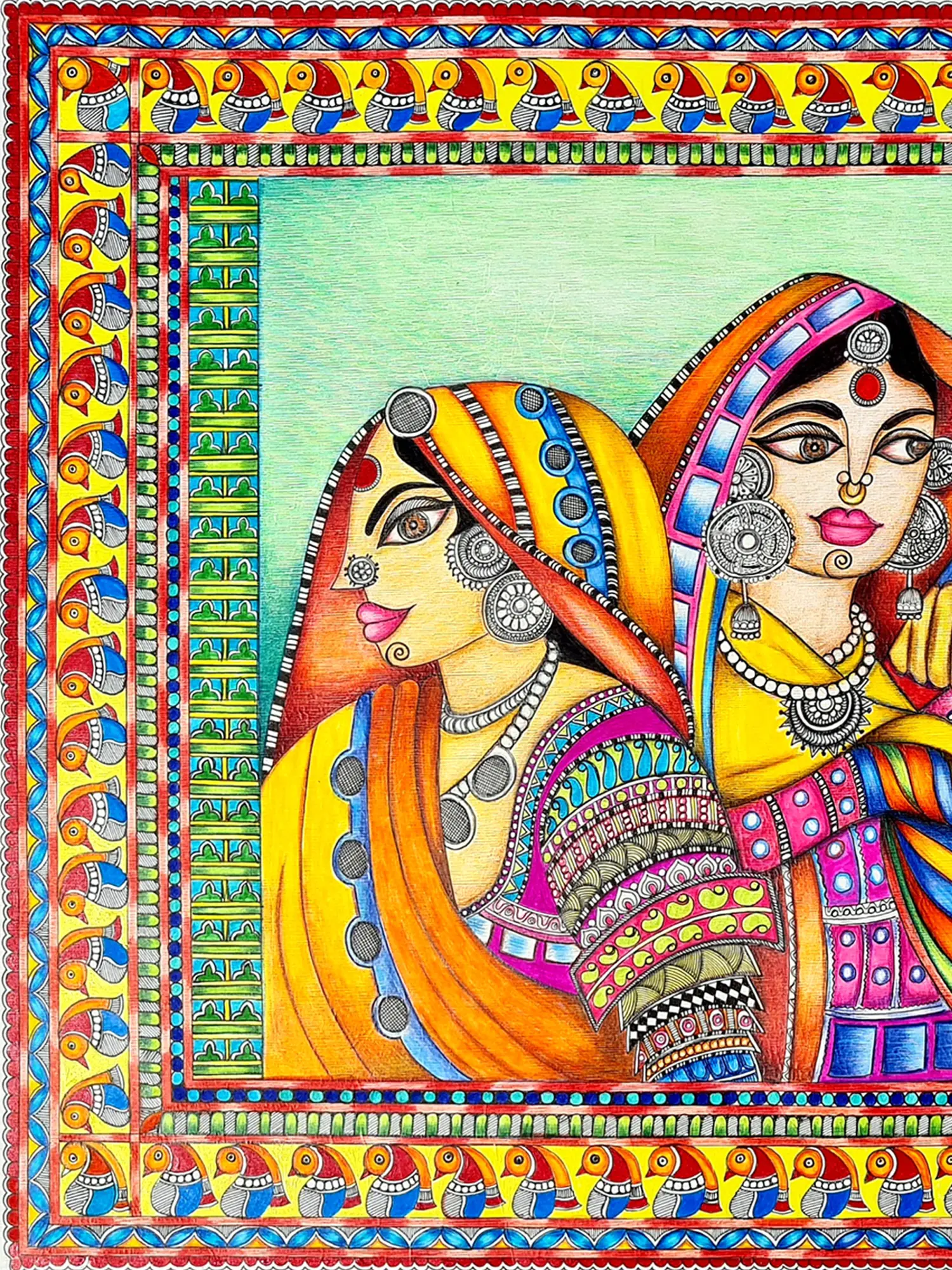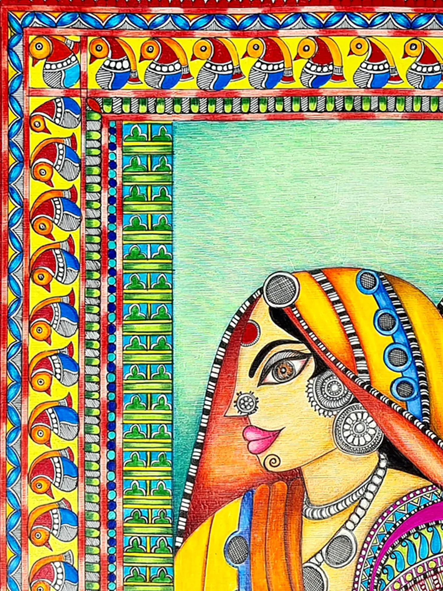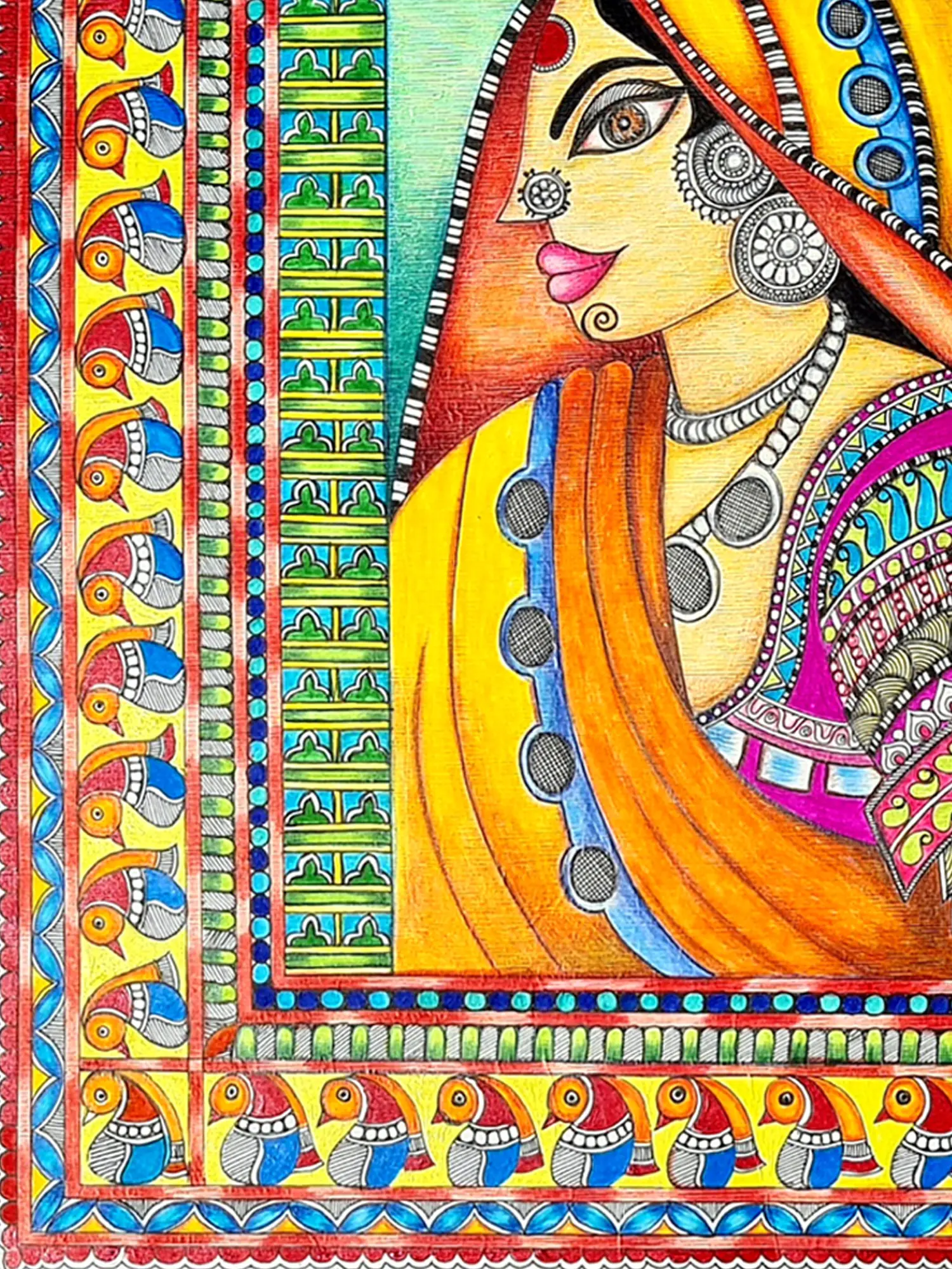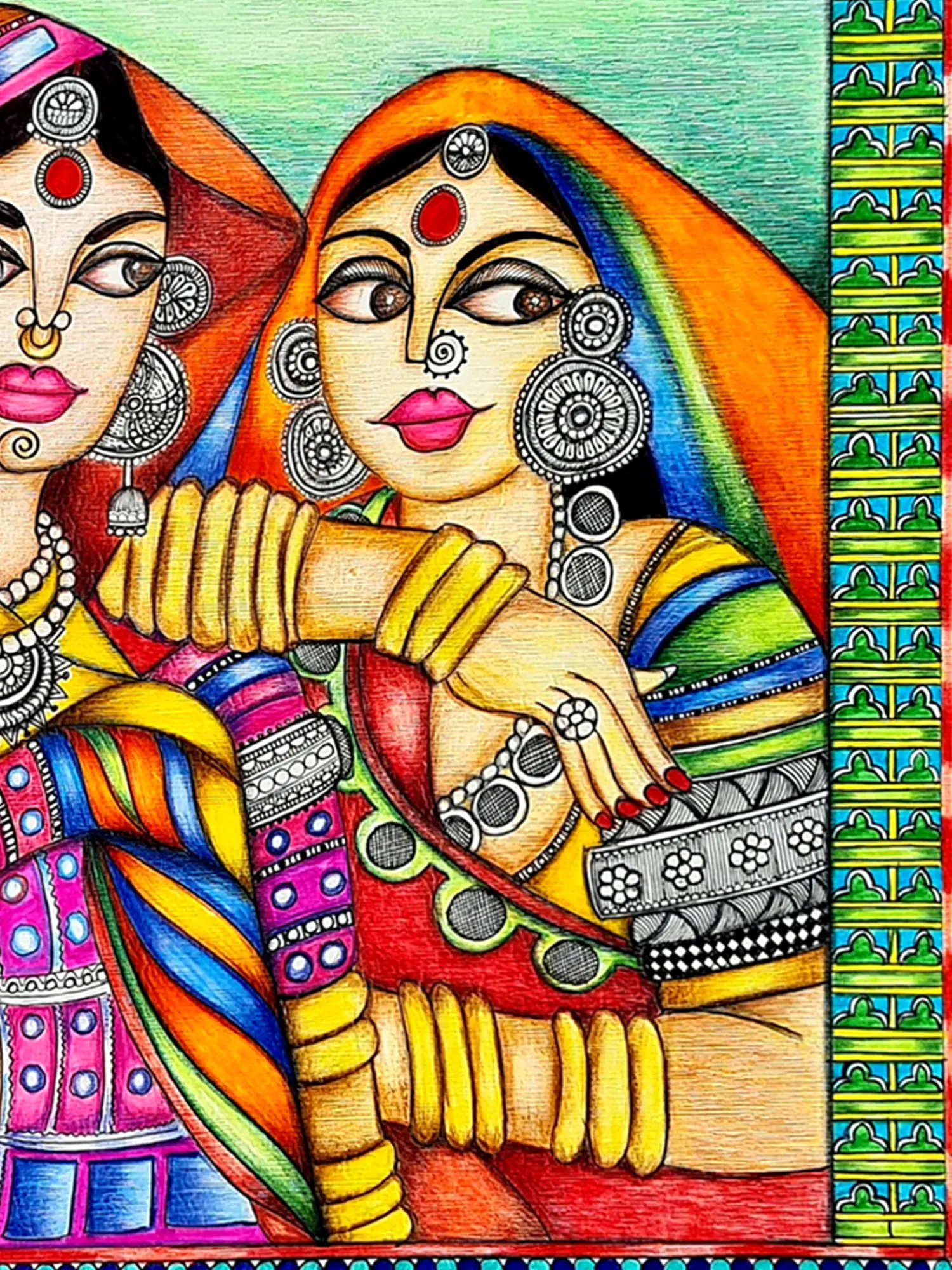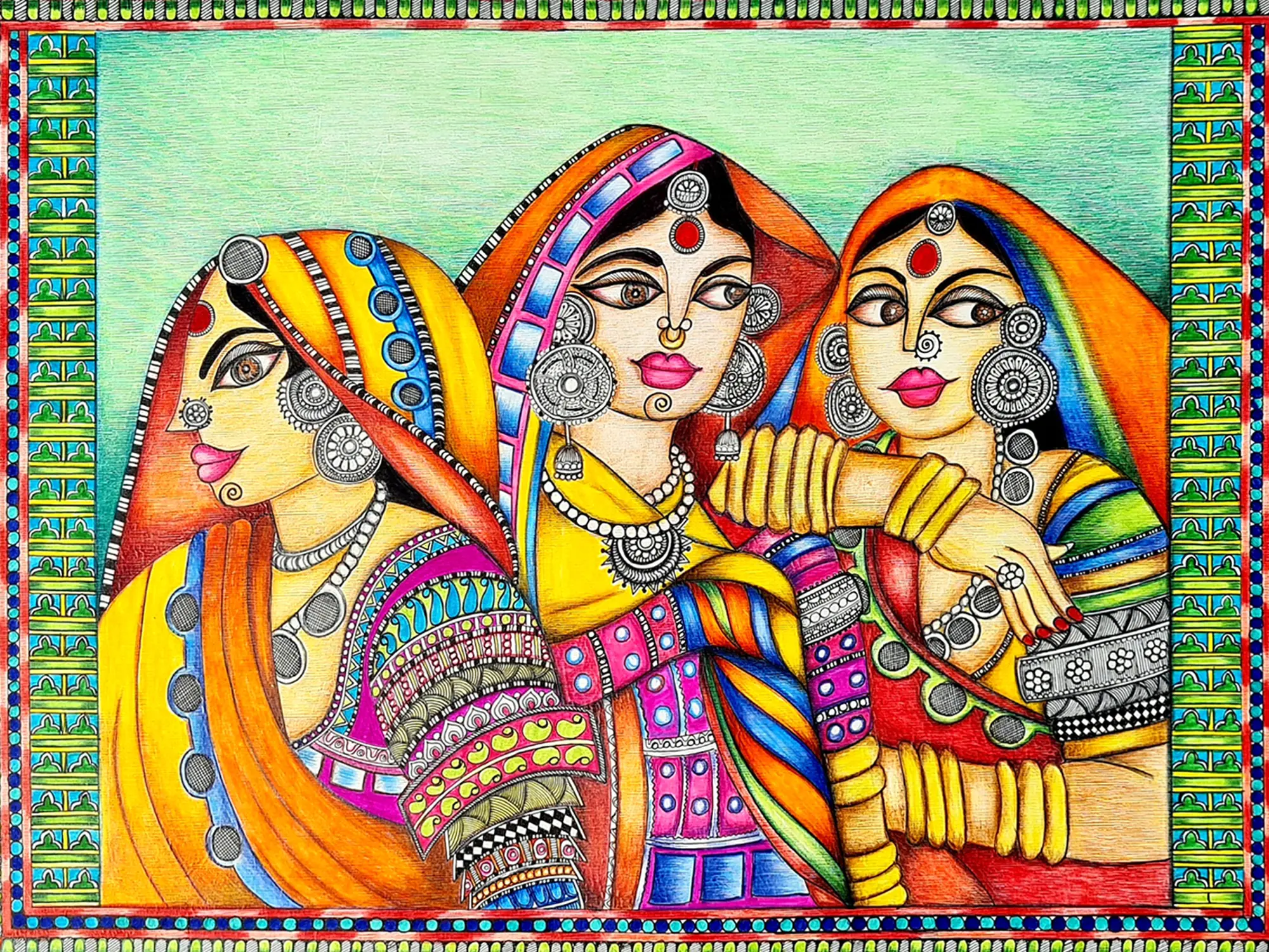 This gorgeous art piece comes to life through mixed media on paper, celebrating the beauty and culture of Kutch women. The artist intricately blends various media to capture the vibrant attire and ornate jewellery worn by these women. The paper becomes a canvas for cultural richness, inviting viewers to appreciate the artistry and adornments that define the essence of Kutchi tradition.