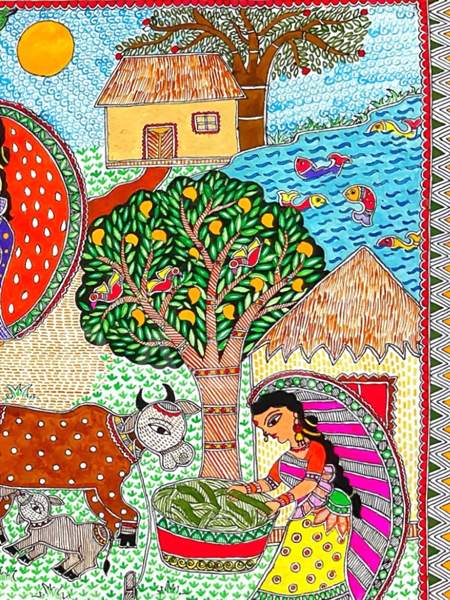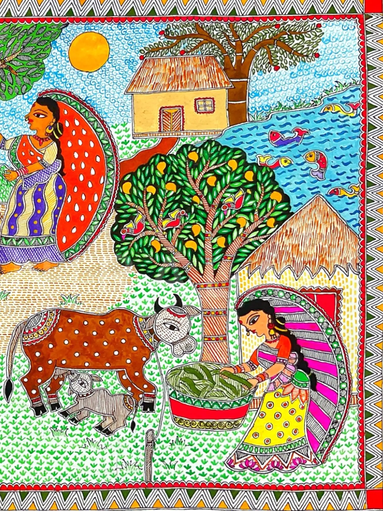 Observe the lively figures adorned in richly patterned attire, their expressions conveying a sense of calm contentment. The scene unfolds with a meticulously rendered landscape, from the lush foliage of fruit-laden trees to the inviting architecture of village homes. The surrounding natural elements, including a serene river teeming with life and a watchful cow with its calf, are depicted with an engaging liveliness. This artwork, measuring 14.50 inches in height and 23.00 inches in width, possesses a balanced composition that draws the eye across its entirety, revealing new nuances with each viewing.