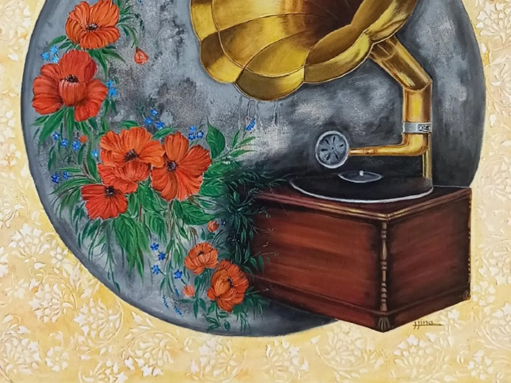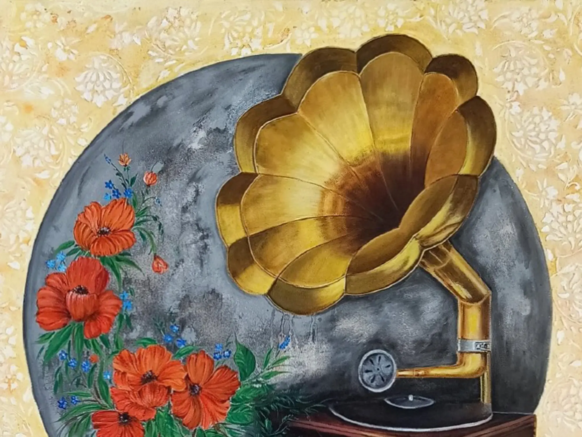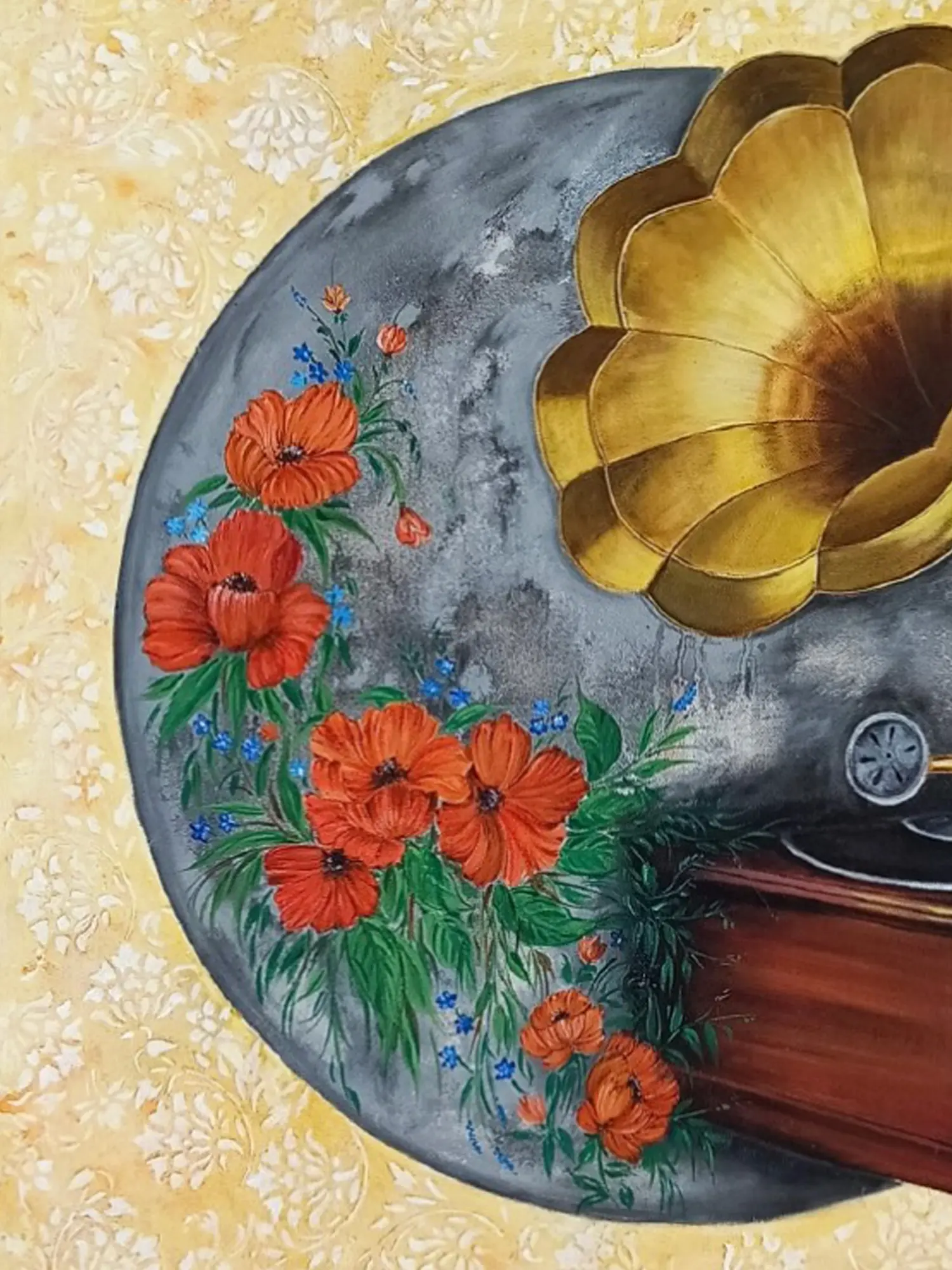 The striking composition draws your eye to the iconic form of the gramophone, its polished brass horn reflecting a warm, golden glow. Vivid crimson poppies, interspersed with delicate blue blossoms and lush green foliage, cascade artfully, creating a beautiful counterpoint to the mechanical precision. The artist's choice of a textured, pale gold background, adorned with subtle floral patterns, enhances the overall sense of refined elegance and depth, making the central motif truly stand out within its 24x24 inch canvas.
