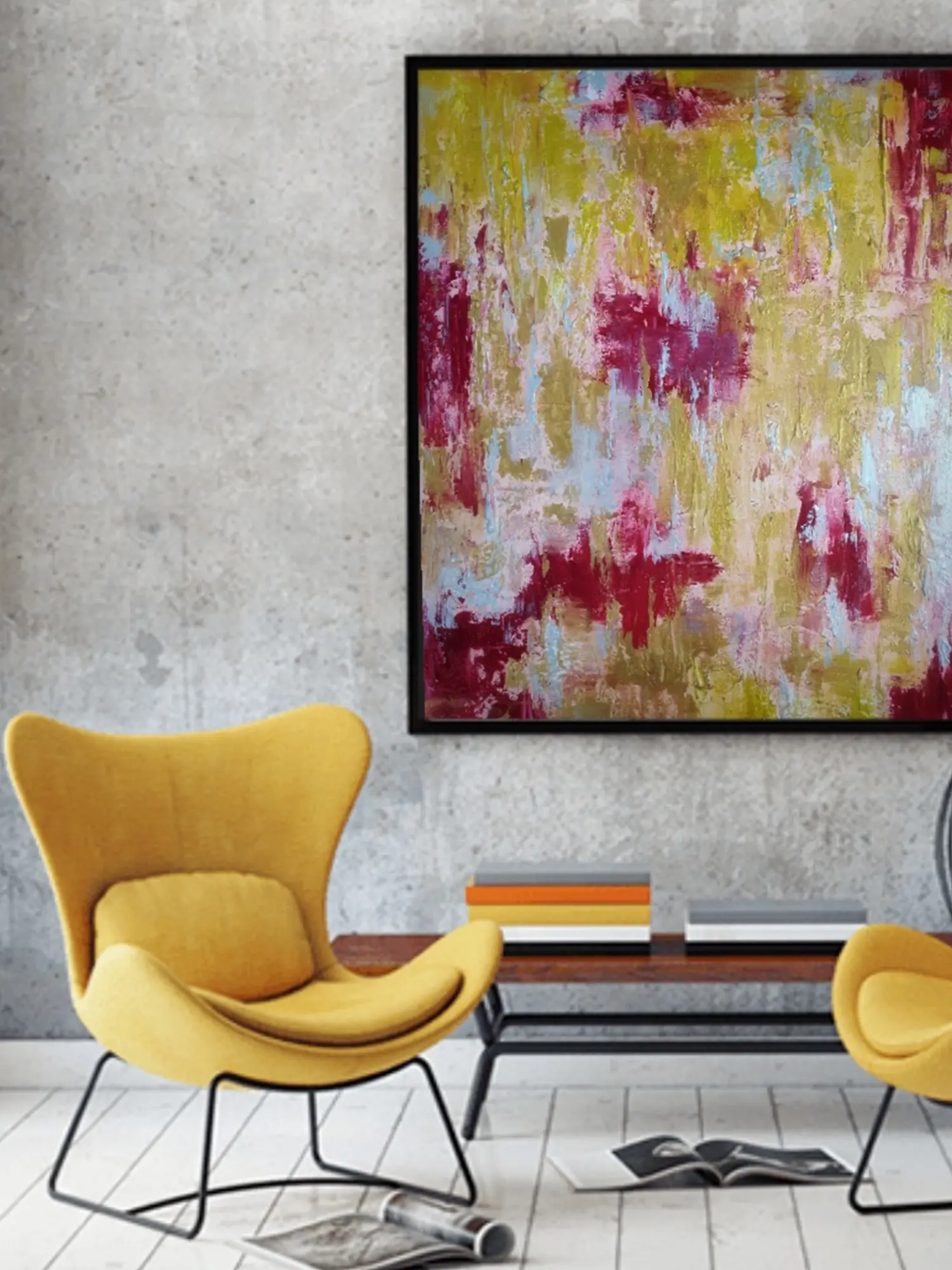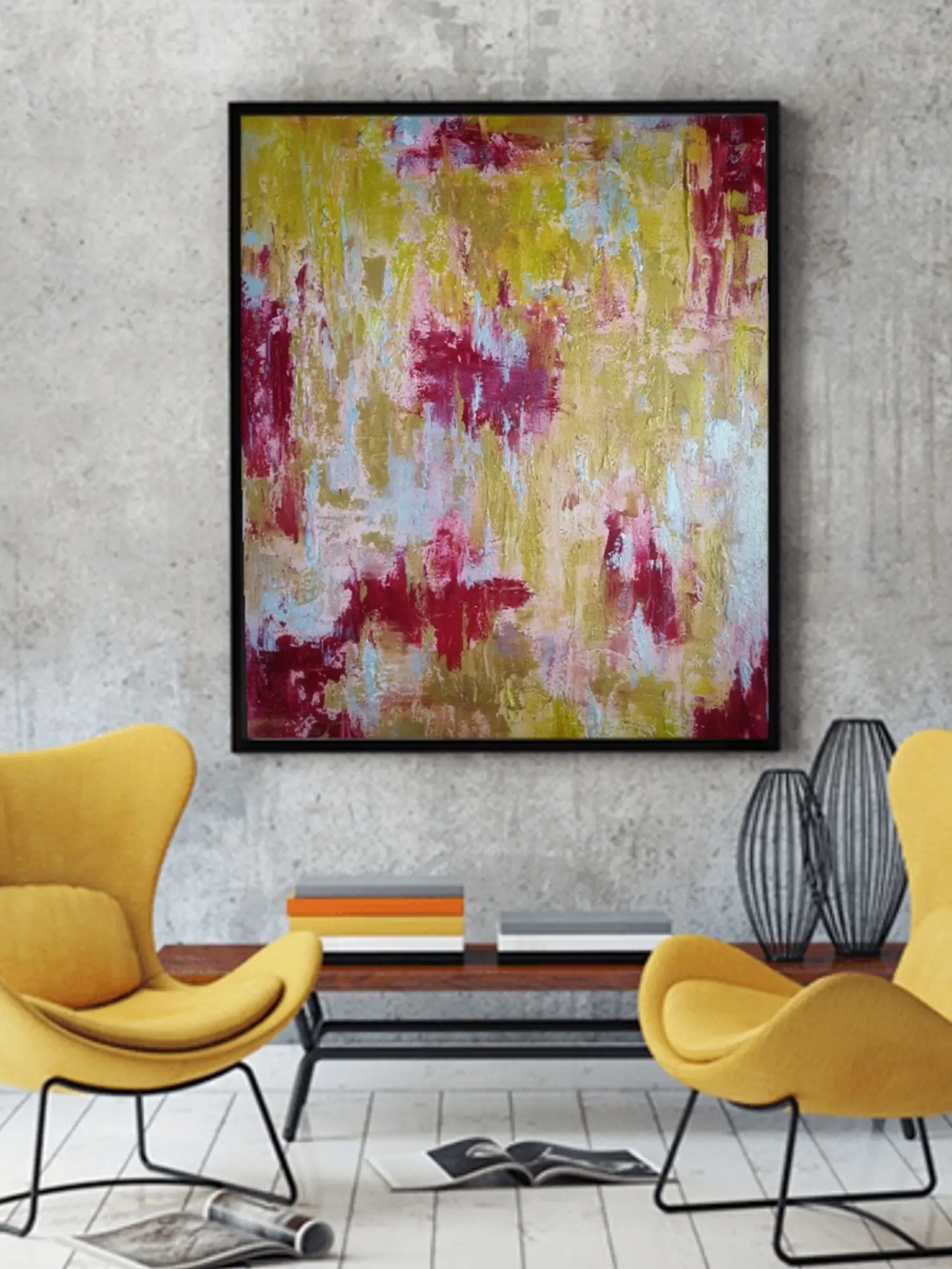 Beyond its symbolic associations, this piece speaks to the universal language of emotion. The abstract nature of the artwork allows for personal interpretation, inviting you to connect with the colors and textures on a deeply intuitive level. Does the vibrant yellow evoke feelings of joy and optimism? Does the deep red stir up passion and energy? The beauty of abstract art lies in its ability to bypass the rational mind and tap into the realm of feeling. Let this painting be a mirror reflecting your own inner landscape, a source of inspiration, and a reminder of the complexity and beauty of the human experience. It is mixed media on canvas.