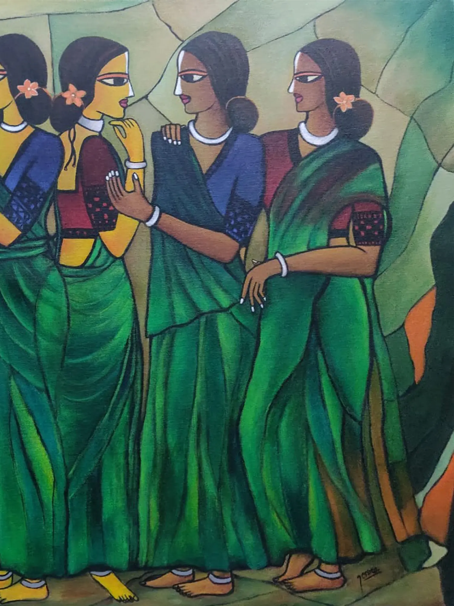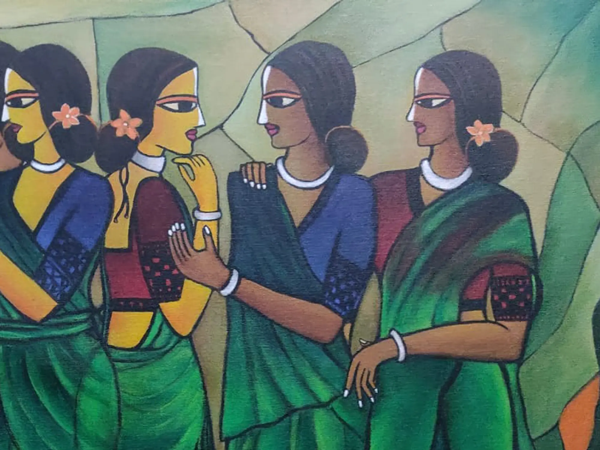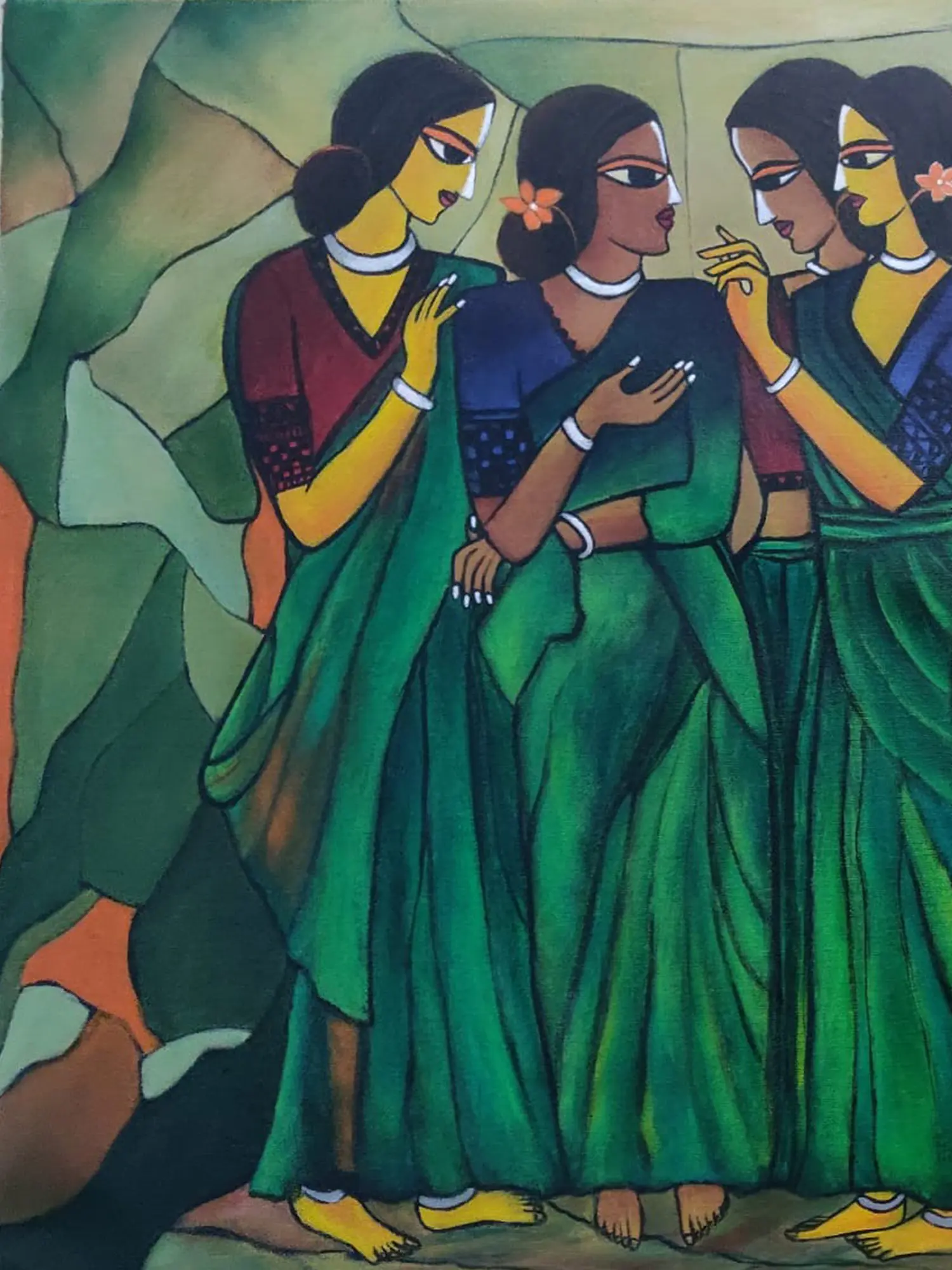 The composition, measuring 34 inches wide by 23 inches high, draws you into the narrative with its carefully arranged figures. Observe the delicate placement of flowers in their hair, the subtle gestures, and the flowing elegance of the saris, rendered in captivating shades of emerald. The artist’s use of simplified yet expressive features, with prominent eyes that seem to hold untold stories, creates an undeniable sense of presence and connection. The contrasting warm tones in the background provide a striking counterpoint to the cool blues and greens of the women's attire, enhancing the overall visual depth.