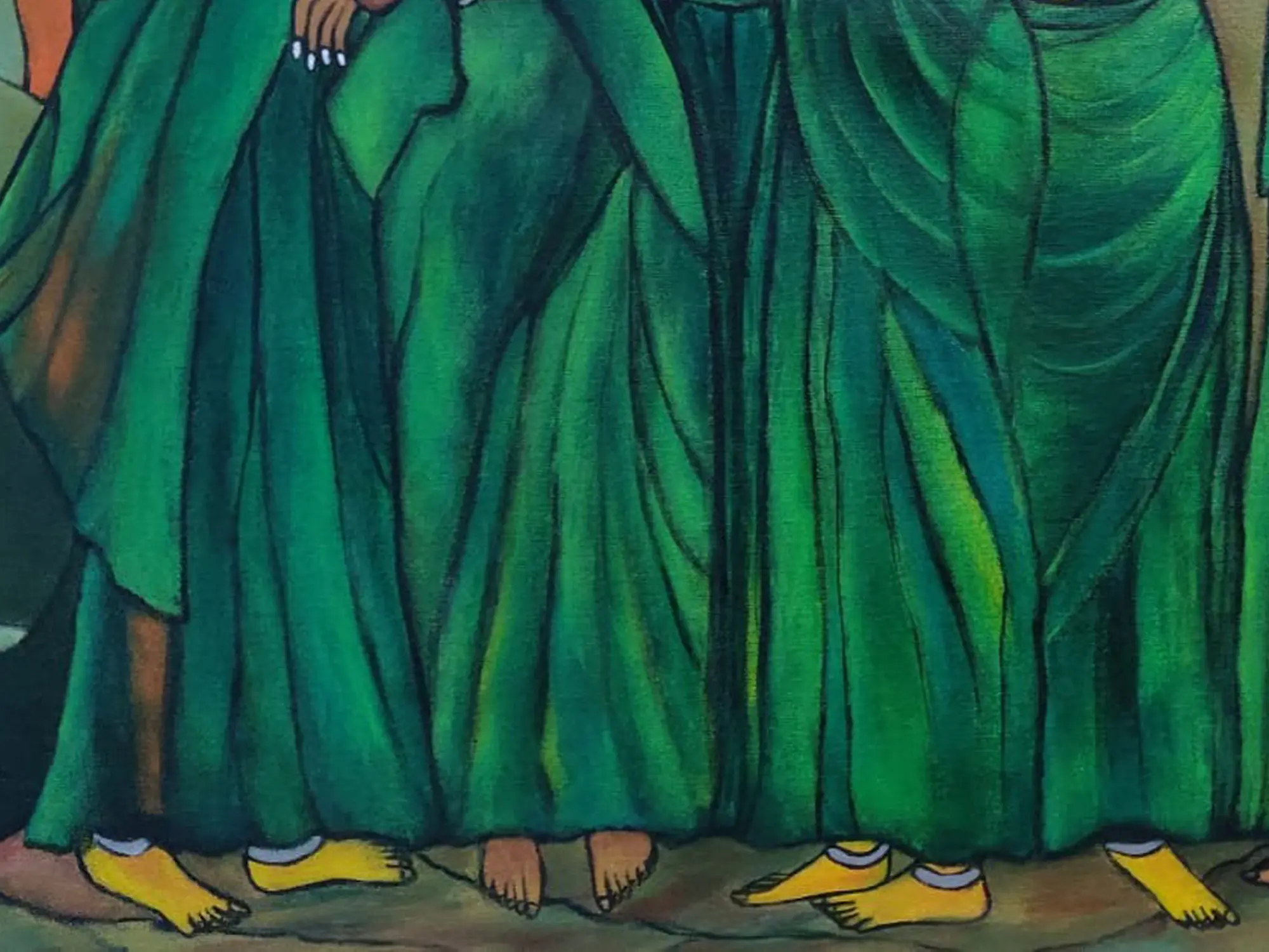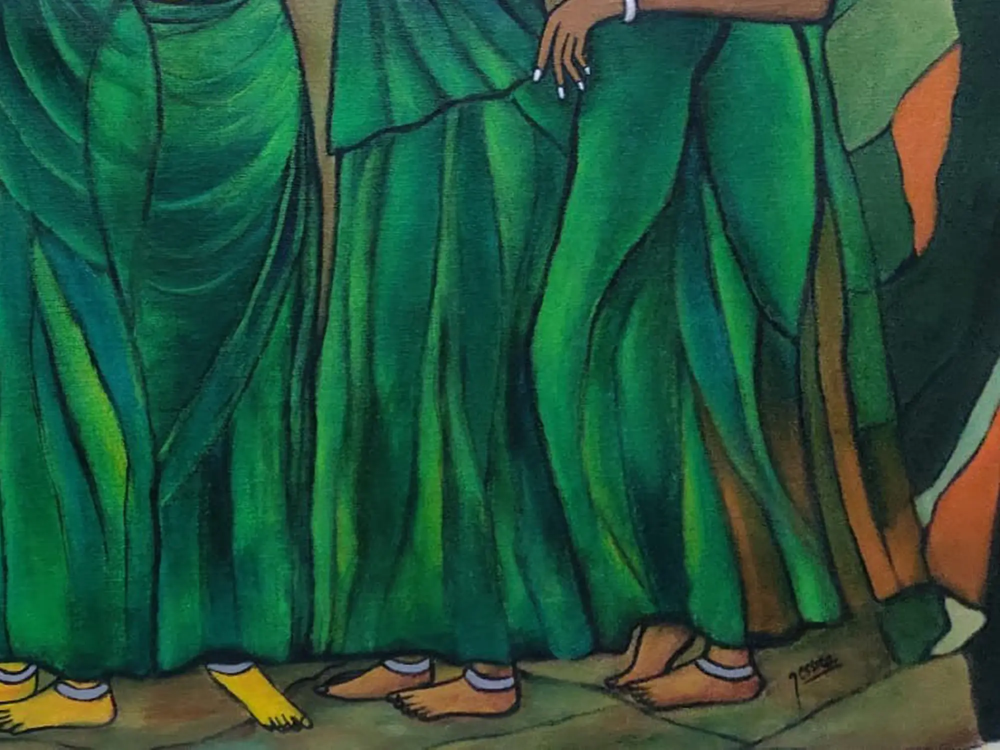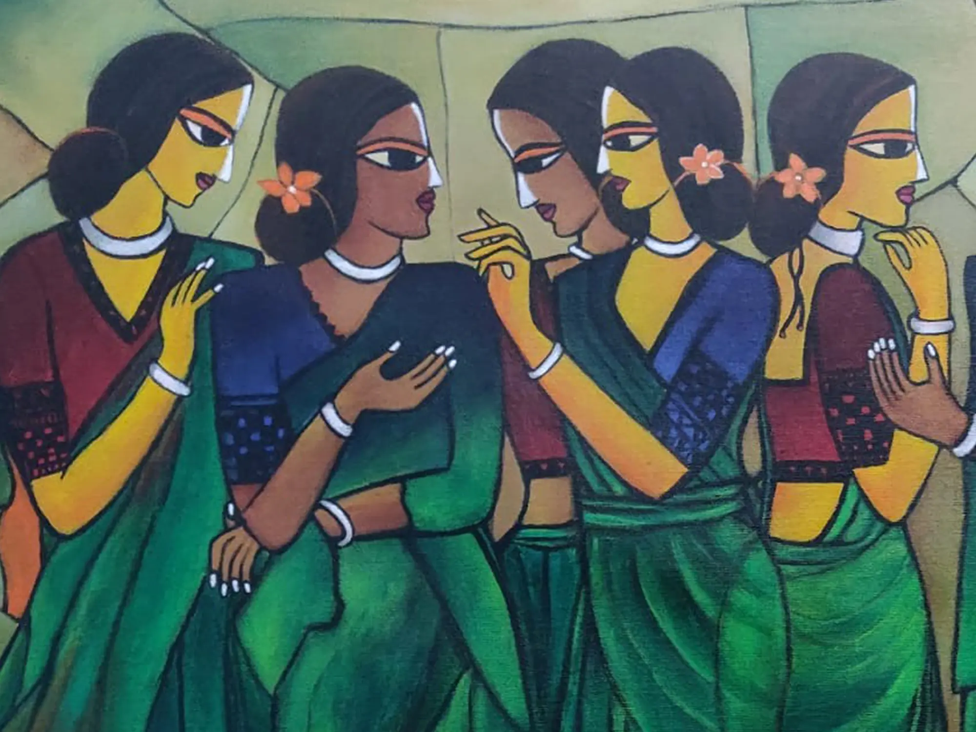 The composition, measuring 34 inches wide by 23 inches high, draws you into the narrative with its carefully arranged figures. Observe the delicate placement of flowers in their hair, the subtle gestures, and the flowing elegance of the saris, rendered in captivating shades of emerald. The artist’s use of simplified yet expressive features, with prominent eyes that seem to hold untold stories, creates an undeniable sense of presence and connection. The contrasting warm tones in the background provide a striking counterpoint to the cool blues and greens of the women's attire, enhancing the overall visual depth.