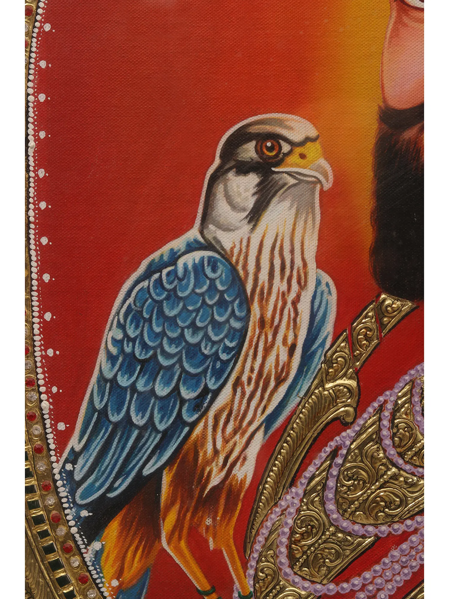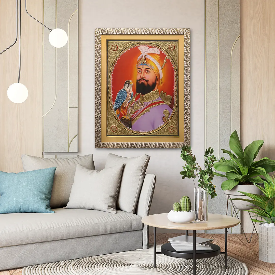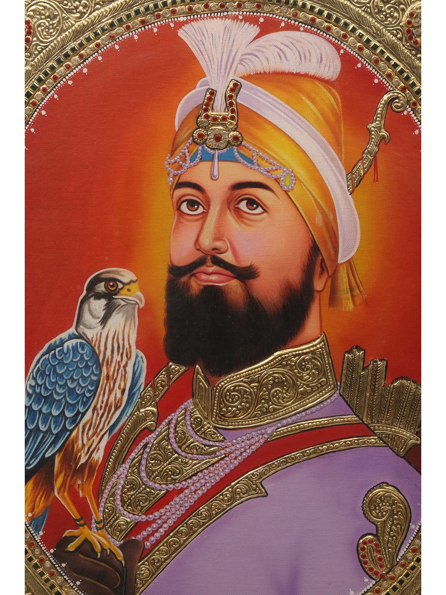 Dressed in vibrant saffron robes and adorned with intricate jewelry, Guru Gobind Singh is depicted with a falcon perched gracefully on his hand, symbolizing his courage and spiritual strength a classic portrait of the Sikh master.