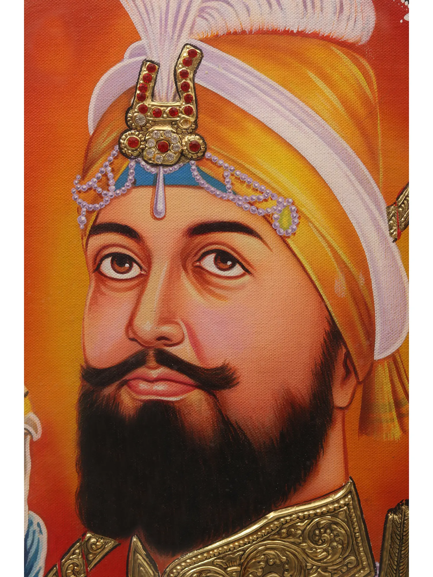 Through fine shading and complementing the use of gold and stone that create a realistic image, the Tanjore is an ode to the valor and wisdom of the Guru.