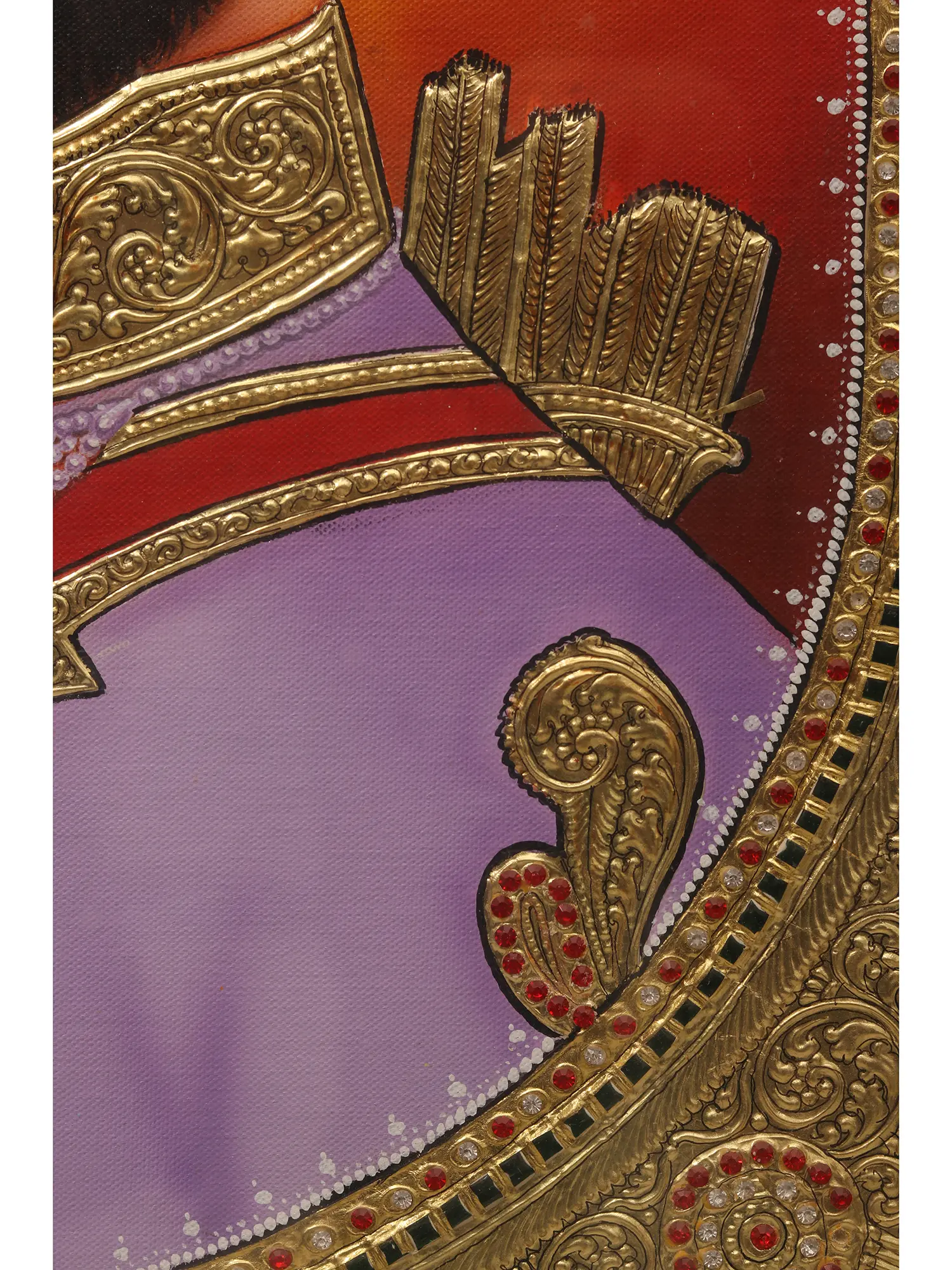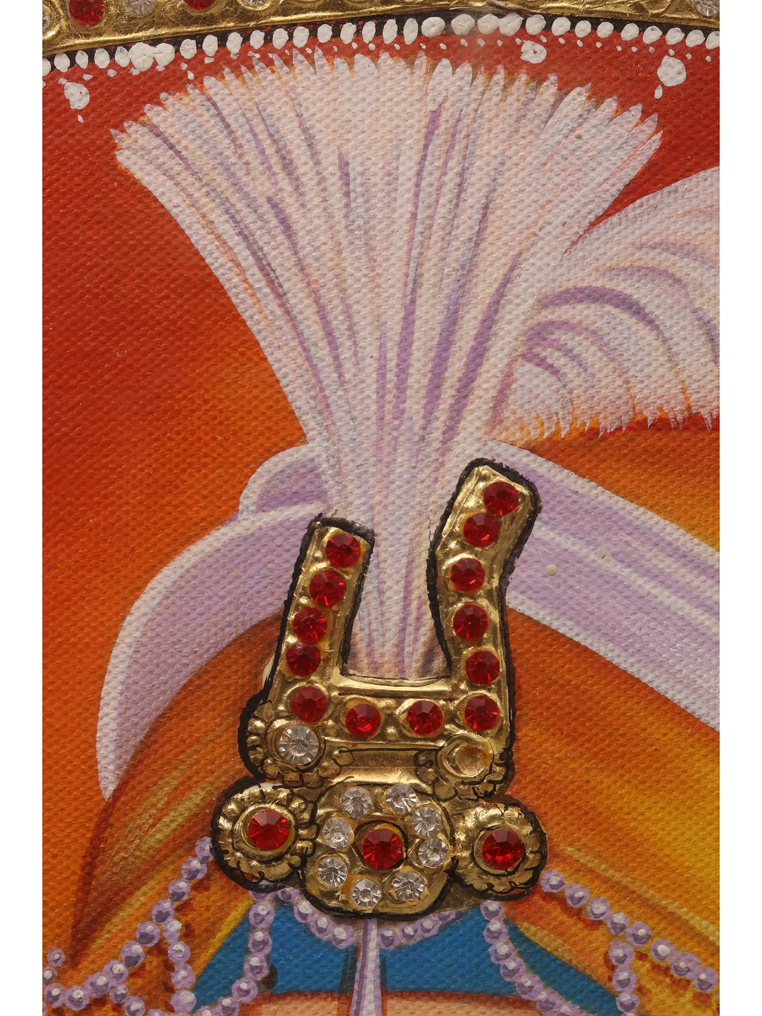 Goldwork embellishes the canvas, adding layers of richness and detail to his crown, jewelry, and attire, all of which reflect his regal yet humble spirit.