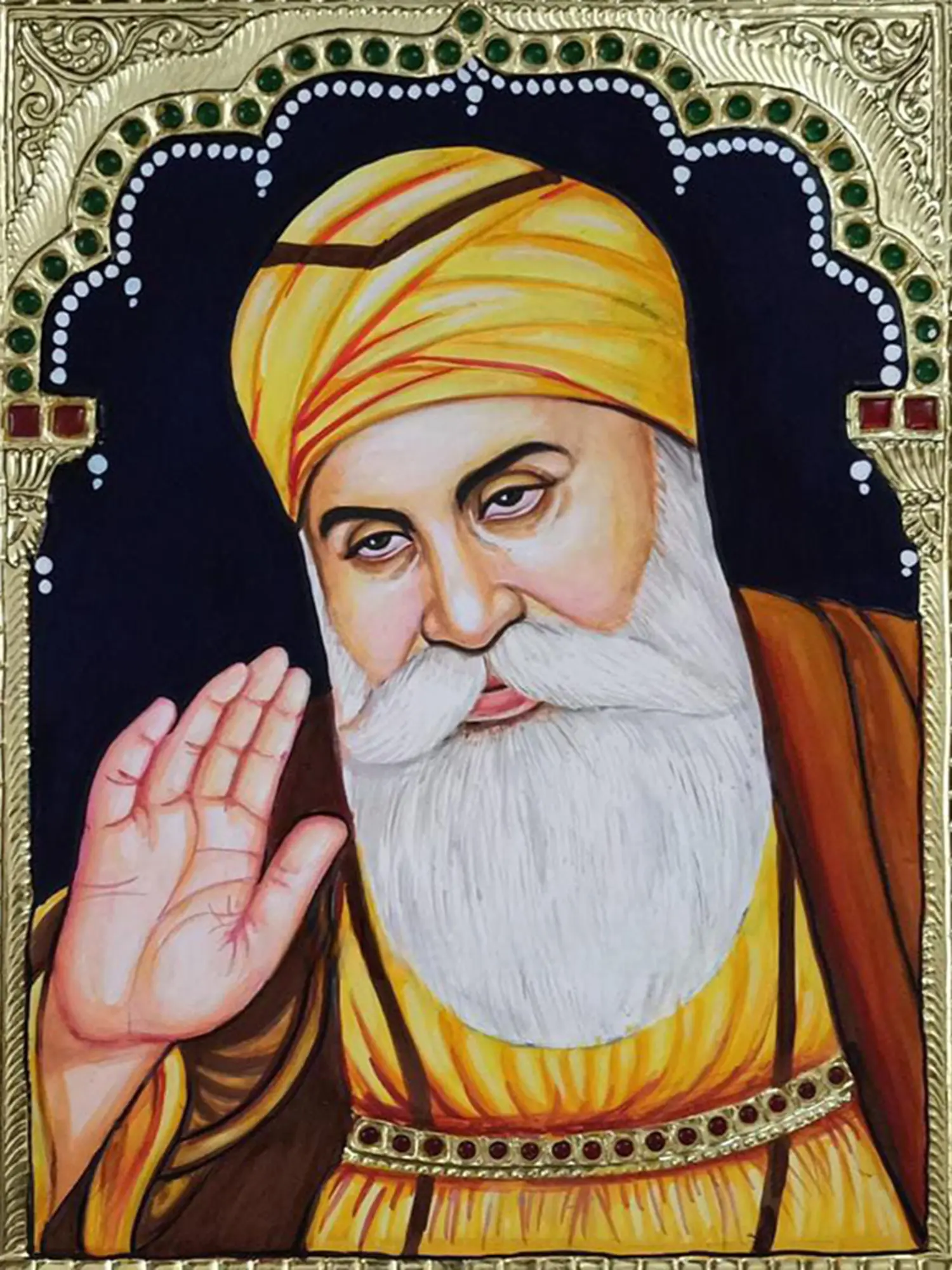 This Tanjore painting of Guru Nanak Dev Ji radiates a sacred aura, capturing the serene and austere presence of the revered Guru.