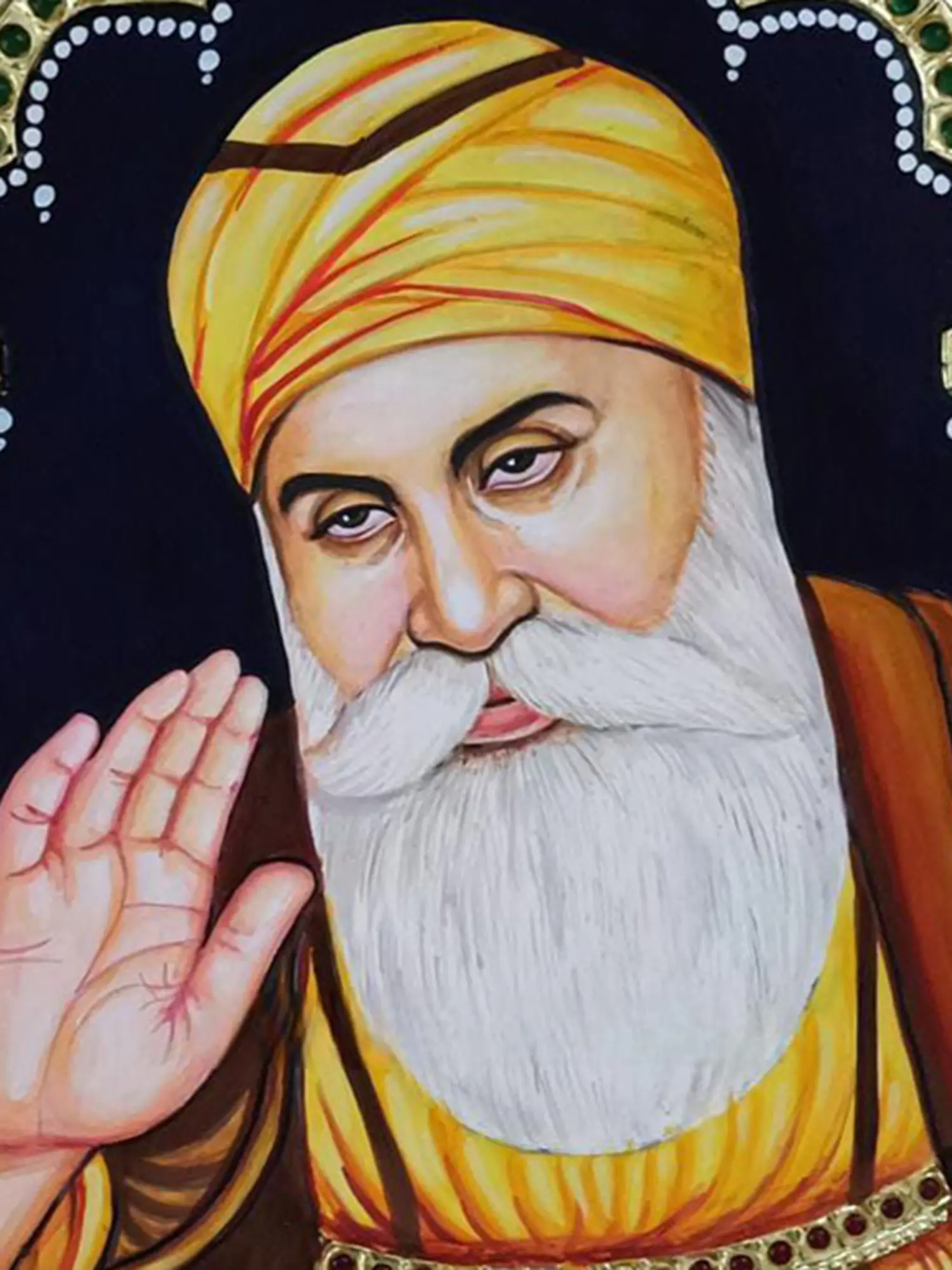 Guru Nanak with his hand raised in the gesture of fearlessness and his kind eyes gazing at the devotee is a blissful vision, highlighted by the dark background against which he glows like the sun.