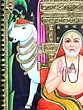 The painting subtly weaves in elements that carry deep cultural and mythological significance. The white cow, often depicted alongside revered saints, symbolizes purity, nourishment, and the sacredness of life, reminiscent of the Nandi bull, Lord Shiva's mount, and the divine bovine Kamadhenu. The presence of a banana bunch and fruits on a plate before the Guru signifies prosperity, abundance, and the offerings made to deities and holy men. These elements are not merely decorative but serve to underscore the Guru's benevolent nature and his role as a bestower of blessings. The intricate archway framing the scene evokes the grandeur of temple architecture, suggesting the divine abode and the sacred space occupied by the Guru.