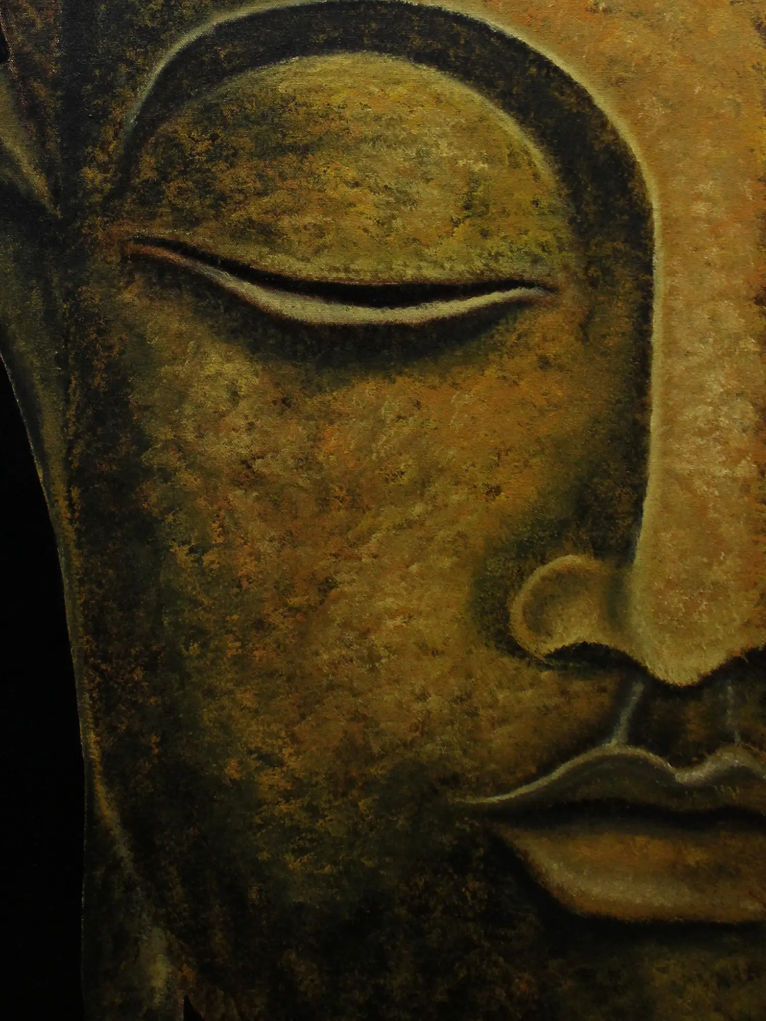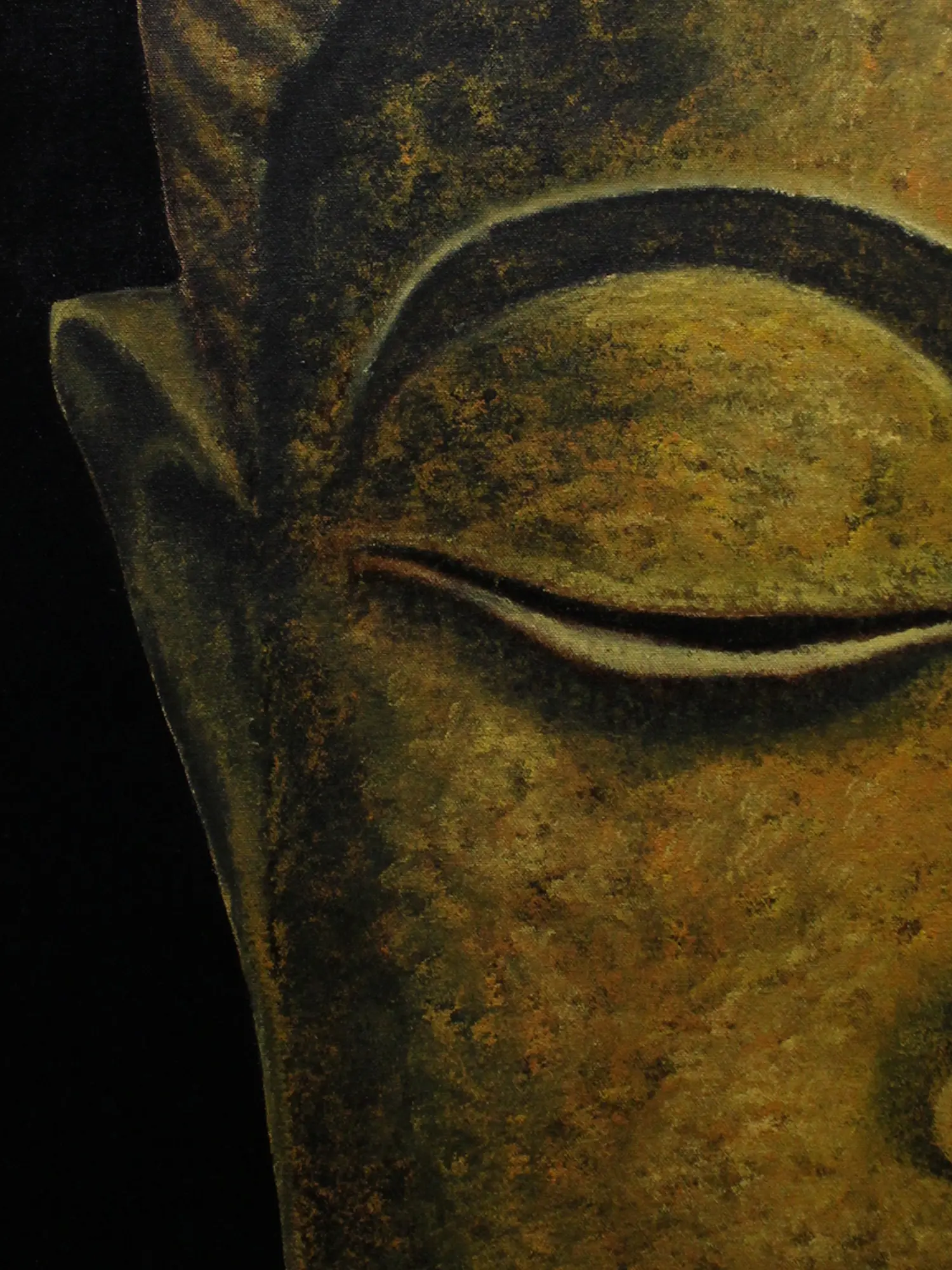Buddha's face with closed eyes and smiling lips has been the subject of many artworks. Artists from various styles have also tried mixing contemporary elements with the depiction of Buddha's face. This painting titled "Half Face Buddha" by Karthik, is one such experiment. This is an oil on canvas marvel, that captures the essence of spiritual depth with Buddha's half face and his typical features. The face of Buddha is painted in a bronze patina hue symbolising an old charm. The figure is placed against a dark background manifesting the idea of finding the light of enlightenment (Buddha's face) in the darkness.