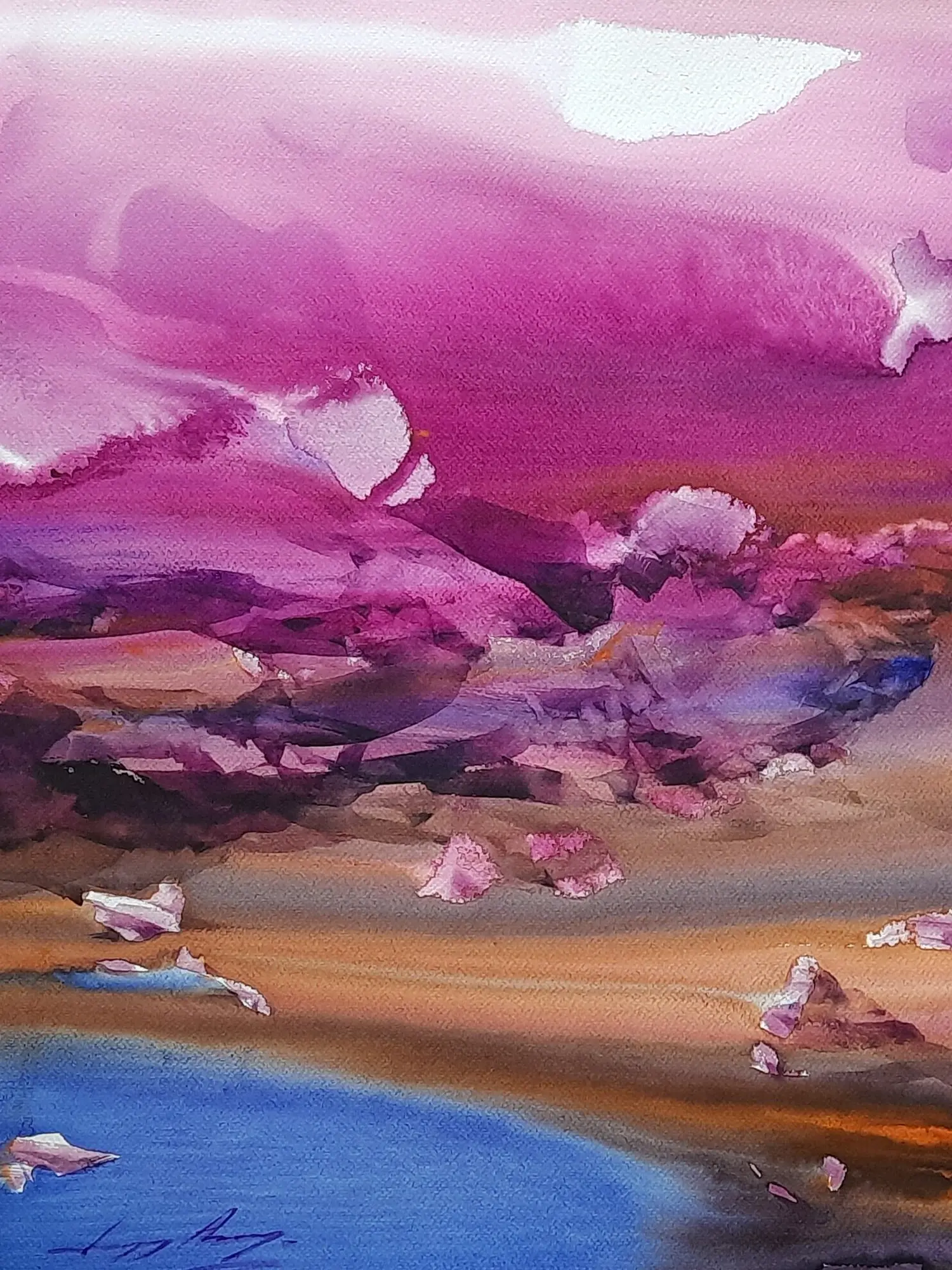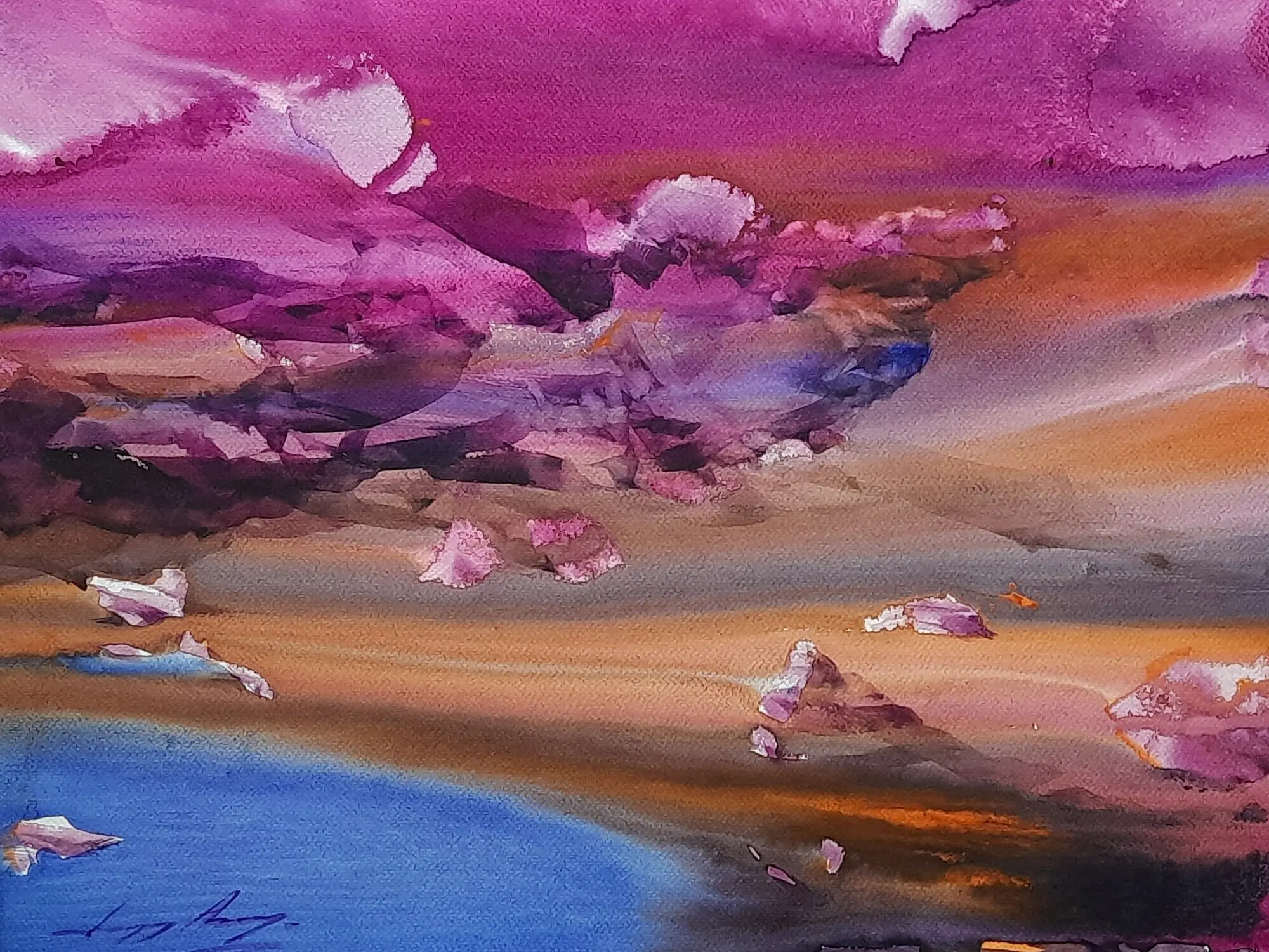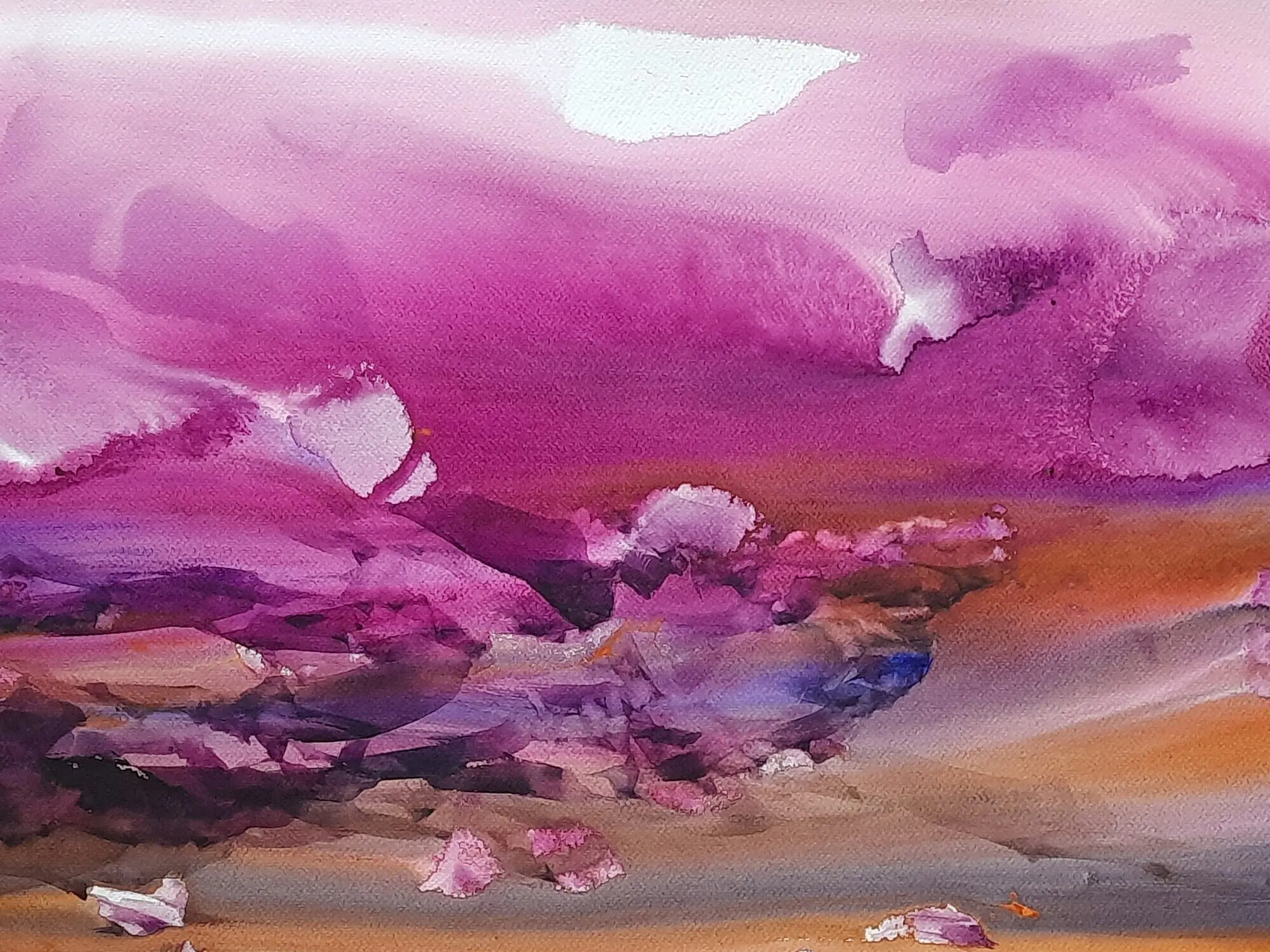 A bouquet of bright colors of purple, orange, blue, and yellow this painting "Happy Valley" by Sanjoy Banerjee, is a watercolor masterpiece, based on the Japanese Rice Paper technique. There are also some instances of paper blotting in this painting. In the Japanese Rice Paper technique diluted PVA glue, Matt acrylic varnish, or a similar neutral pH adhesive is used to adhere torn Japanese rice paper to the surface. This painting unveils a world of joy and tranquility through the extensive use of the purple shade. The tips of the rocks are masterfully painted in white and the shading is also top class. The painting's vibrant hues and idyllic scenery exude a sense of serenity and contentment. It symbolizes the pursuit of happiness, urging viewers to seek fulfillment in the simple joys of life.