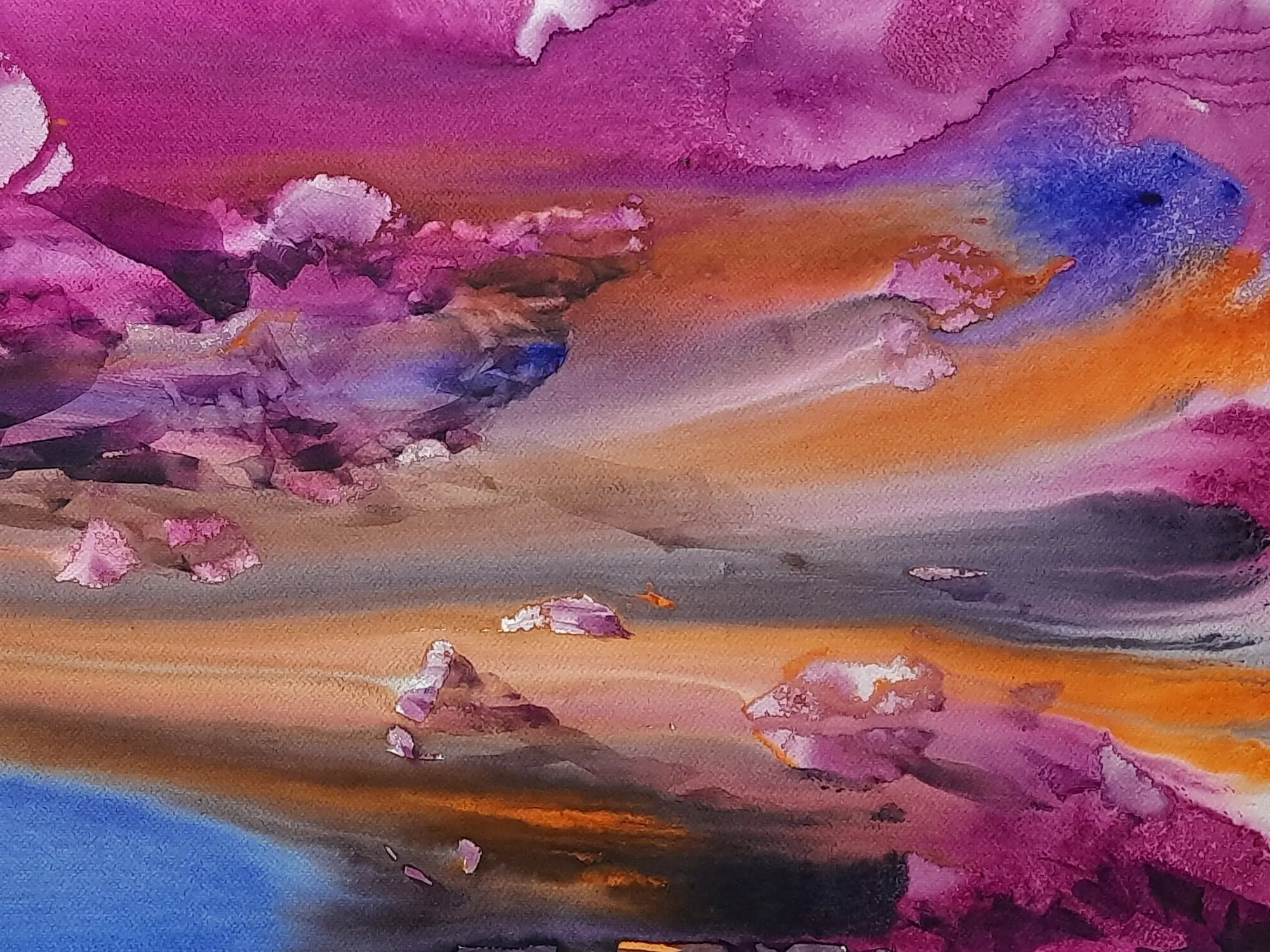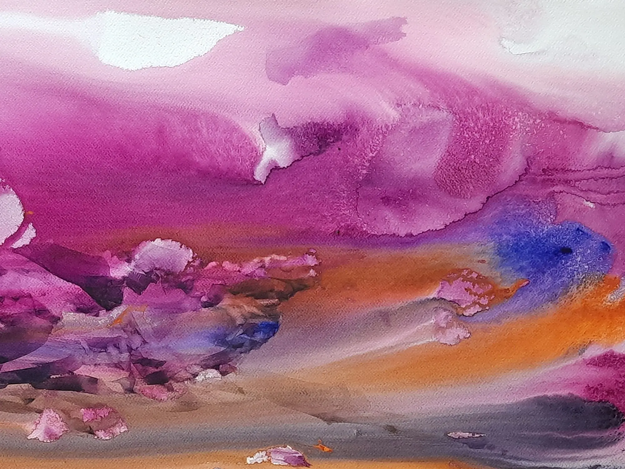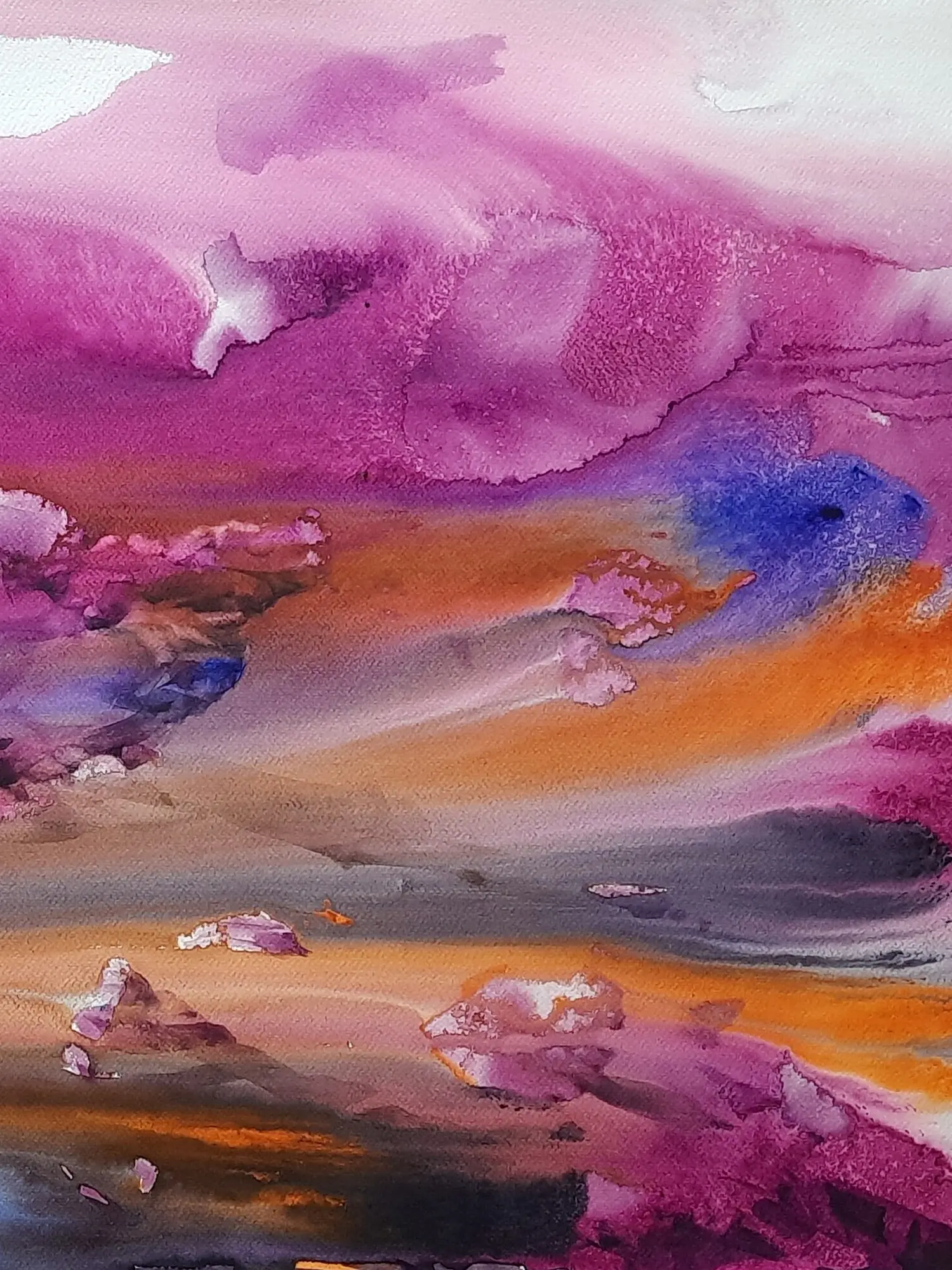 A bouquet of bright colors of purple, orange, blue, and yellow this painting "Happy Valley" by Sanjoy Banerjee, is a watercolor masterpiece, based on the Japanese Rice Paper technique. There are also some instances of paper blotting in this painting. In the Japanese Rice Paper technique diluted PVA glue, Matt acrylic varnish, or a similar neutral pH adhesive is used to adhere torn Japanese rice paper to the surface. This painting unveils a world of joy and tranquility through the extensive use of the purple shade. The tips of the rocks are masterfully painted in white and the shading is also top class. The painting's vibrant hues and idyllic scenery exude a sense of serenity and contentment. It symbolizes the pursuit of happiness, urging viewers to seek fulfillment in the simple joys of life.