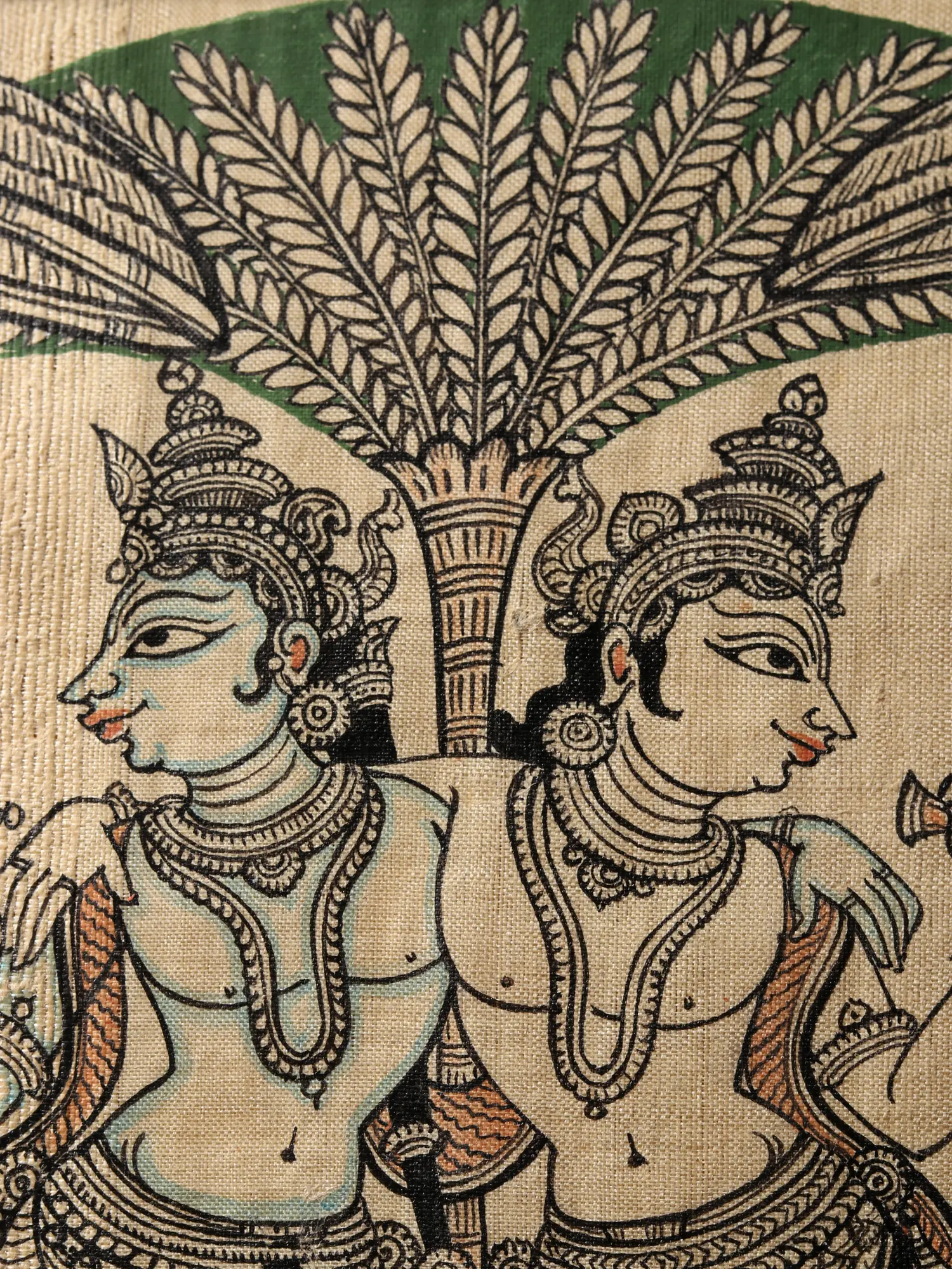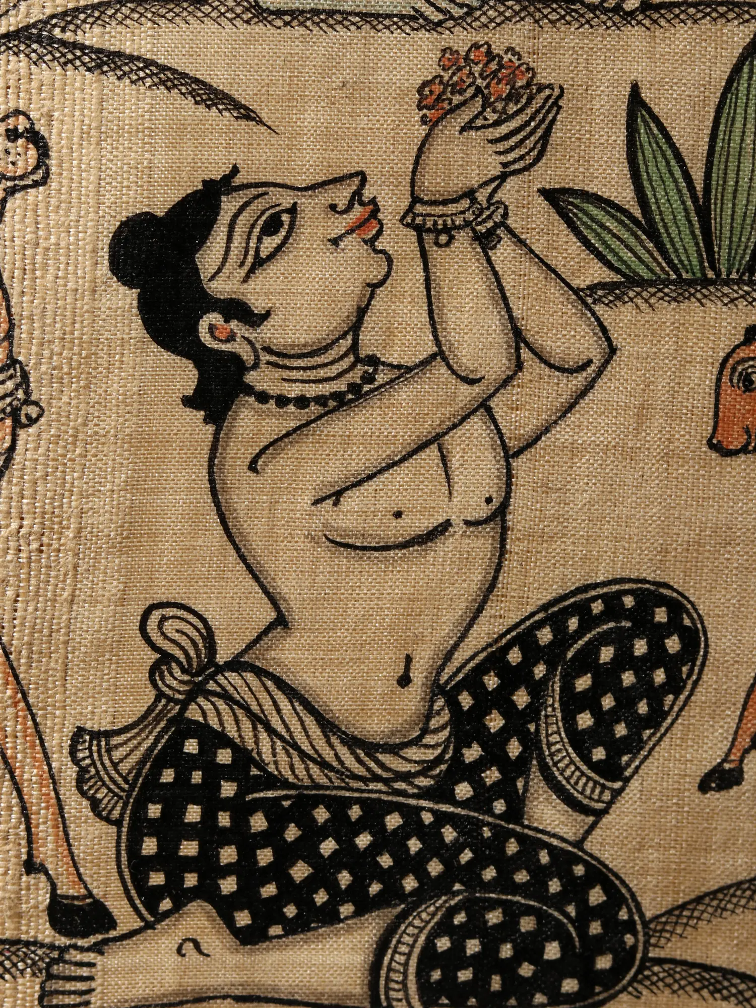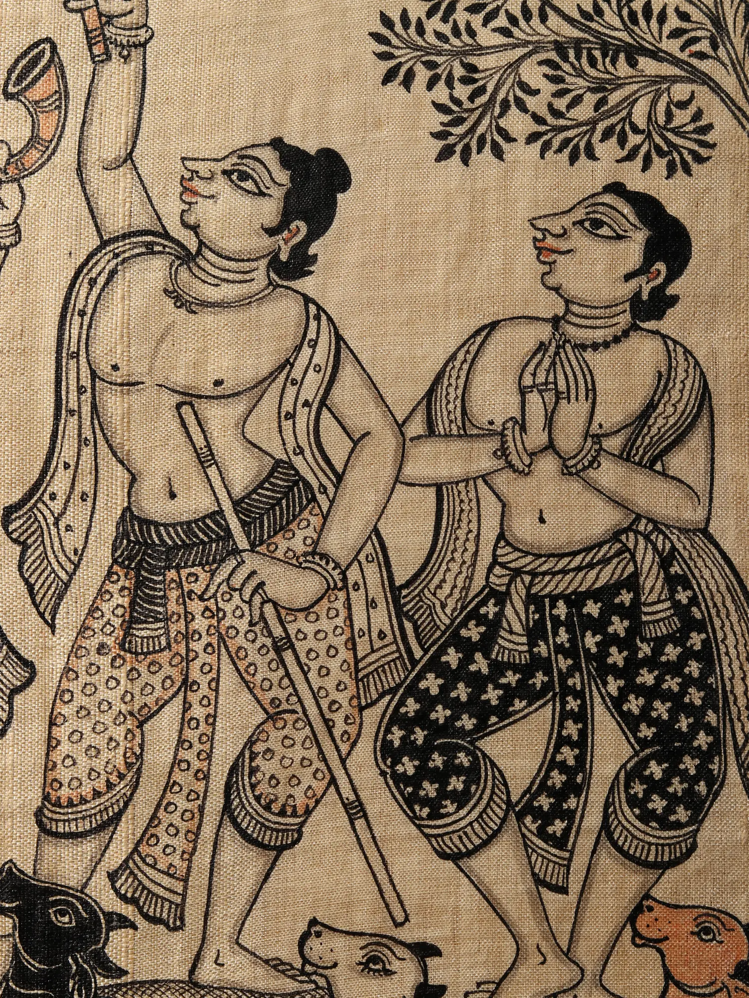 This portrayal is deeply rooted in the Vaishnava tradition, celebrating the divine bond between Lord Krishna and his elder brother, Balarama. Pattachitra, originating from the eastern Indian state of Odisha, is a traditional cloth-based scroll painting renowned for its vibrant depictions of mythology, folklore, and religious themes. You'll appreciate how this piece embodies the spirit of these ancient art forms, carrying stories and devotion across time.