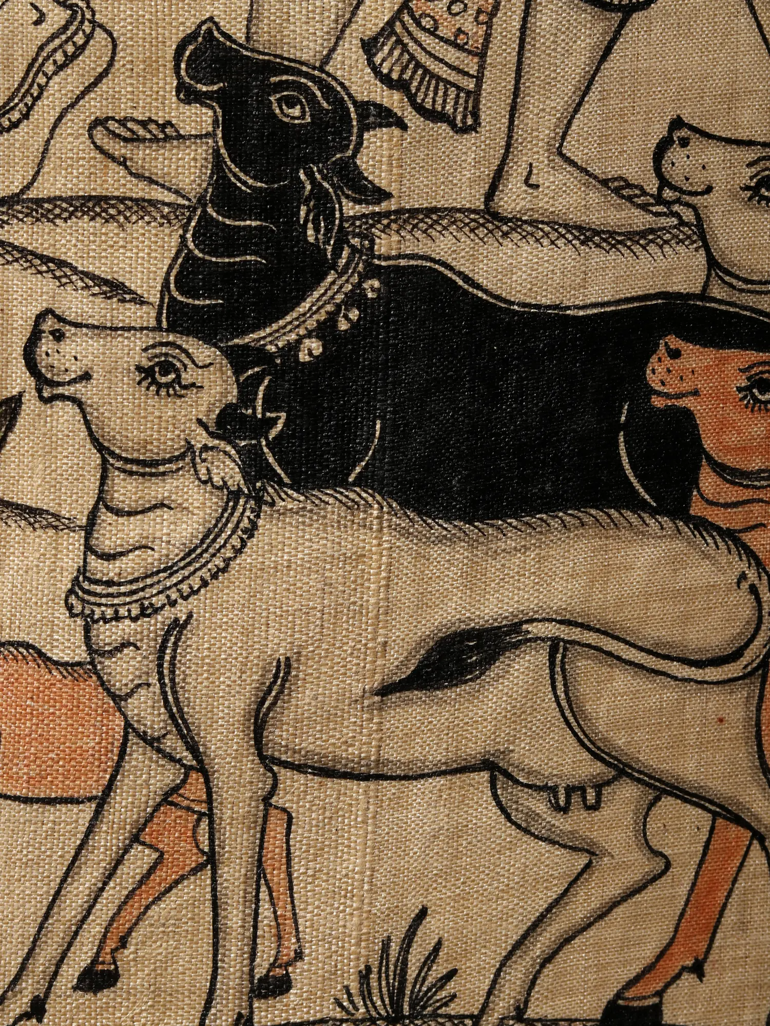 Observe the graceful figures of Krishna and Balarama, central to the composition, radiating an aura of serene divinity. Their elaborate attire and serene expressions are rendered with meticulous detail, drawing your eye to the masterful linework that defines their forms. The surrounding figures, engaged in reverent gestures and joyous celebration, contribute to a rich tapestry of visual narrative. The gentle presence of the cows and the stylized foliage framing the scene add layers of symbolic meaning and aesthetic harmony, creating a balanced and engaging composition. The entire piece measures 11 inches in height and 12 inches in width, a perfect size to command attention without overwhelming your space.