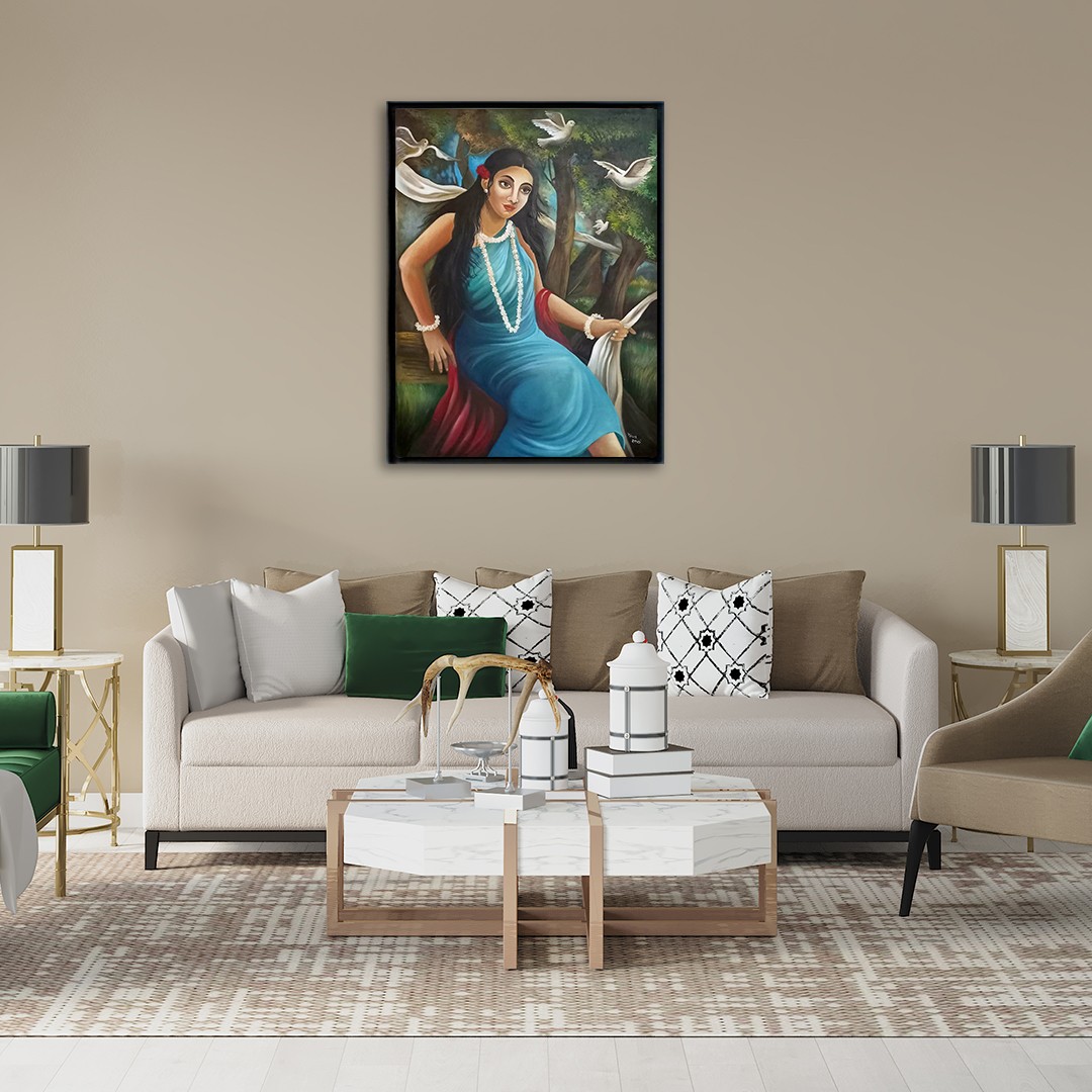 This captivating oil on canvas painting, "Healing Atmosphere," by Niva, is a mesmerizing portrayal of serenity and grace. Measuring 36 inches in height and 40 inches in width, the artwork is a substantial statement piece that commands attention. The painting depicts a young woman, elegantly draped in a flowing teal garment, sitting serenely amidst a tranquil forest setting. Her dark, lustrous hair cascades down her back, framing a face that exudes both tranquility and a hint of enigmatic mystery. Her attire, adorned with delicate white flower garlands, suggests purity and connection to nature. The soft light filtering through the trees casts a gentle glow upon her, enhancing the overall sense of peacefulness. The inclusion of several white doves in flight adds to the ethereal and spiritual atmosphere, their presence symbolizing peace, hope, and the divine messenger.