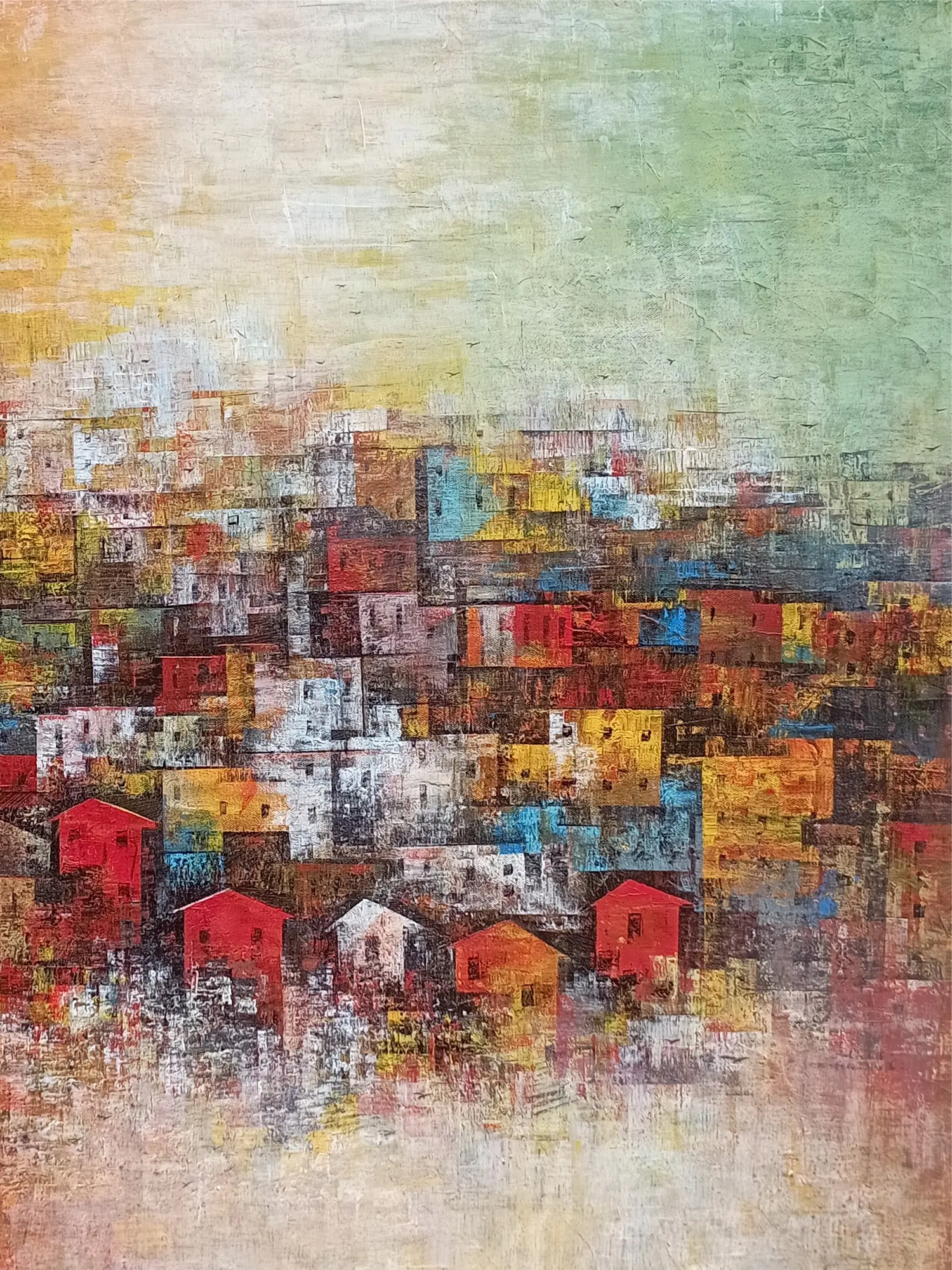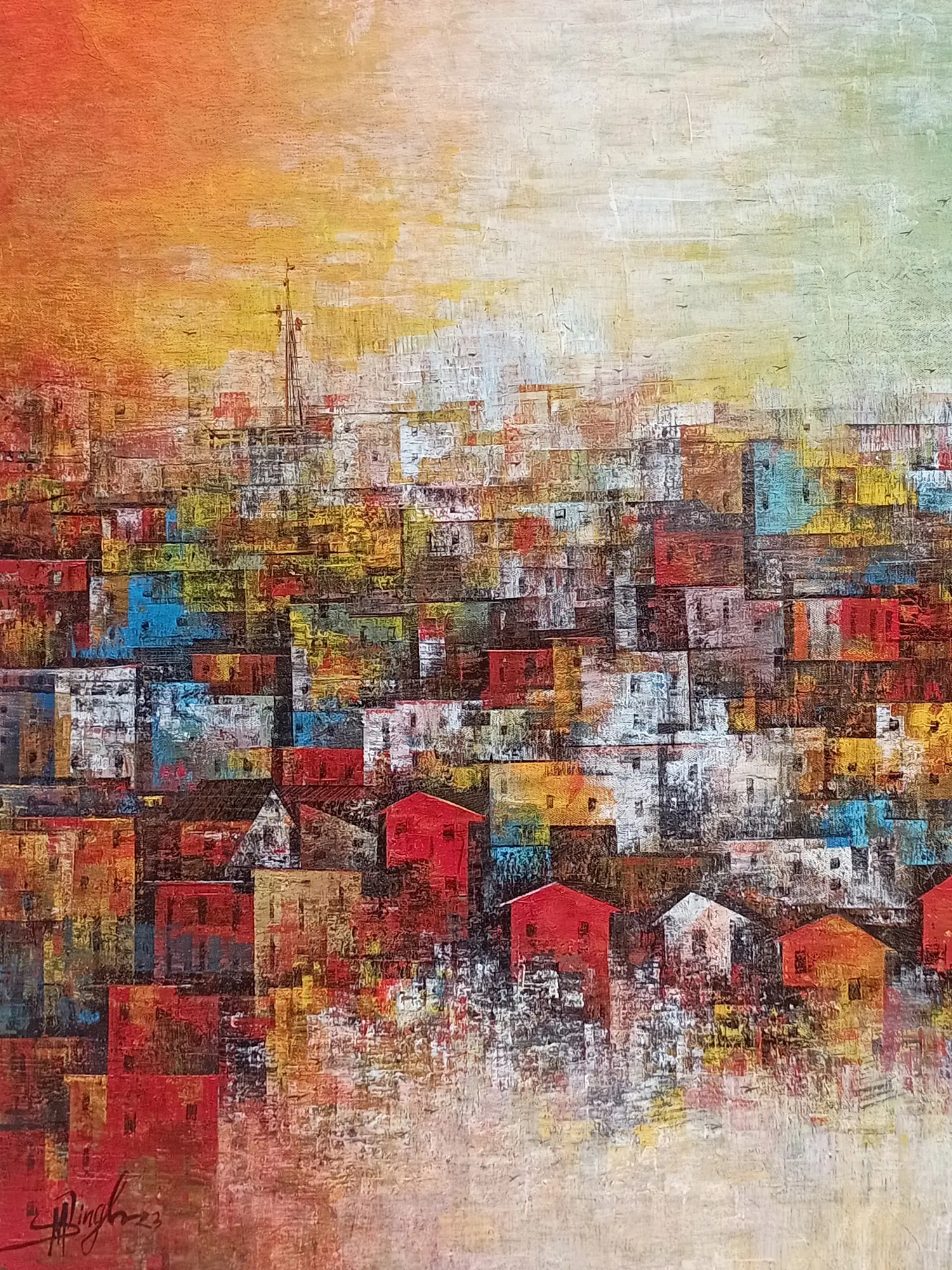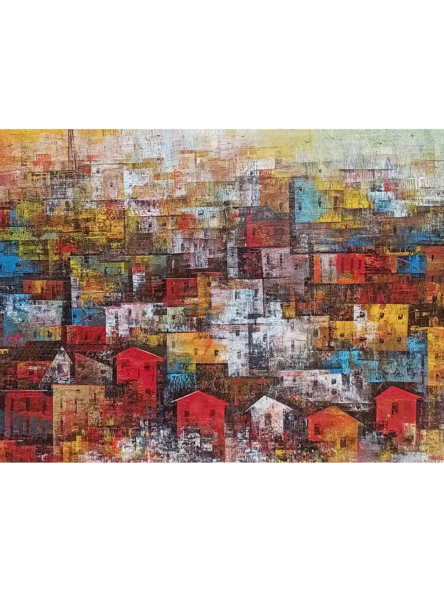 "Home Town" is a nostalgic tribute captured through the expressive strokes of acrylic art. The canvas becomes a memoir, where the artist uses vibrant colours to depict the essence of a cherished hometown. Each brushstroke narrates stories of nostalgia, capturing the landmarks and memories that make a hometown special. Immerse yourself in the acrylic nostalgia, where every detail paints a picture of the artist's emotional connection to their roots.