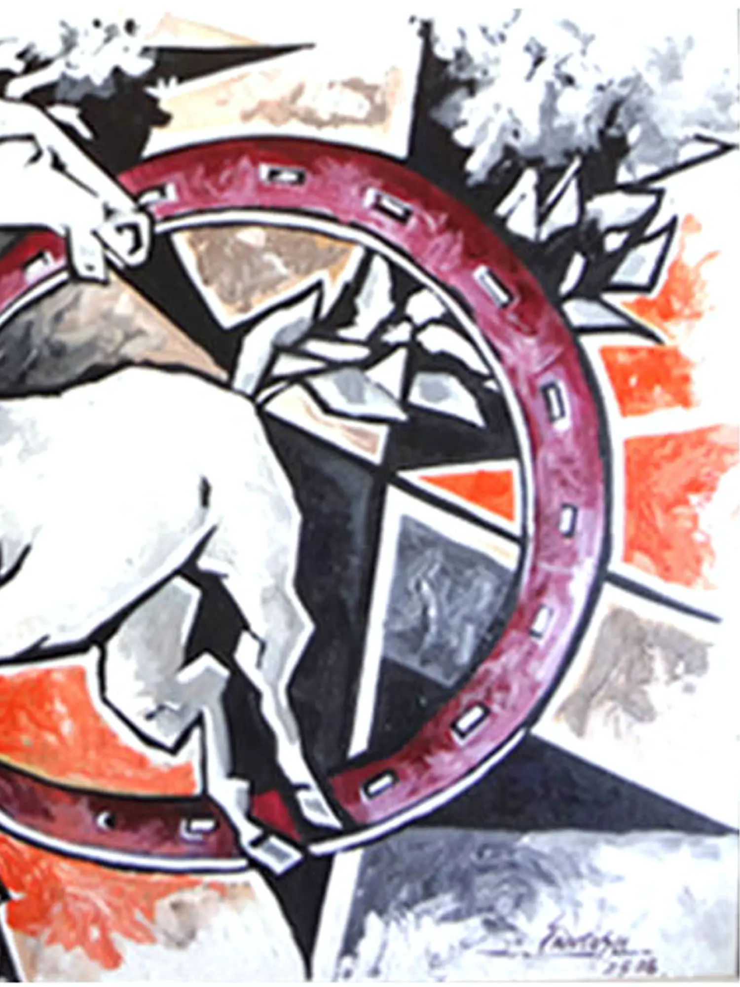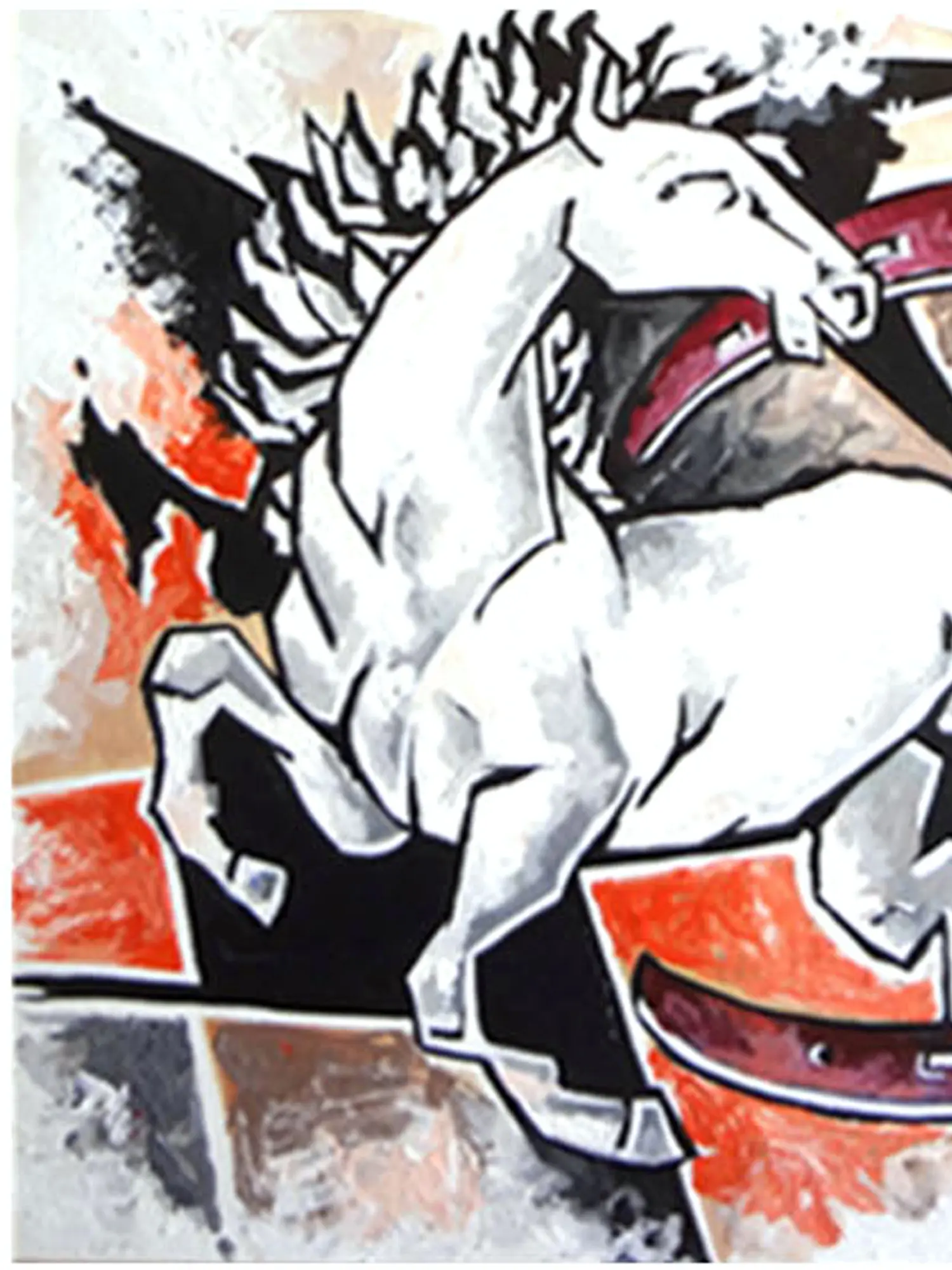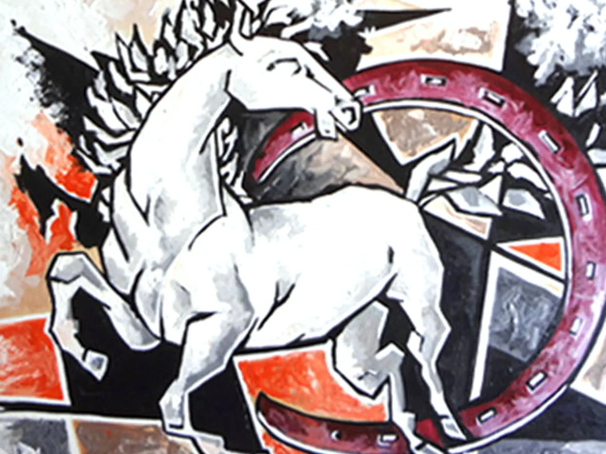 Measuring an impressive 24 by 30 inches, this artwork commands attention. The central figure of the horse is rendered in striking whites and grays, creating a focal point that contrasts beautifully with the bold, abstract background. The deep crimson of the horseshoe element adds a dramatic flourish, symbolizing fortune and power, while sharp geometric shapes and fiery oranges suggest an energetic force. You'll appreciate how the composition balances dynamism with a refined aesthetic, drawing the eye through the canvas with captivating detail.