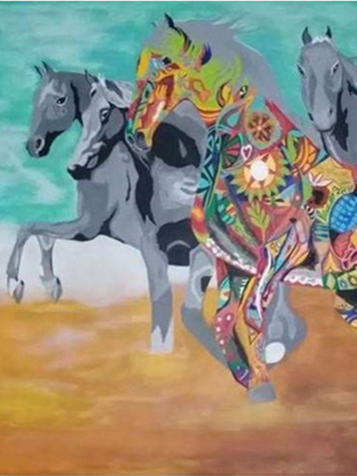 The composition features a powerful ensemble of equines, their forms rendered with a striking blend of realism and abstract expression. Notice how the artist masterfully contrasts the muted, ethereal grayscale of most of the horses with the central figure, which explodes in a riot of vibrant, intricate patterns. This central horse, adorned with a tapestry of swirling motifs and symbolic imagery, stands as a focal point, representing a fusion of natural grace and vibrant cultural expression. The sweeping scale, measuring 35.43 inches in height and 59.1 inches in width, ensures it will be a commanding presence.