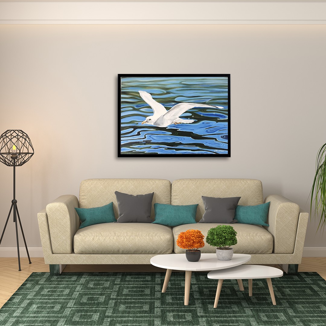 Observing an albatross gracefully soar along the seashore is a pure delight, and Sandeep Singh's Oil on Canvas painting masterfully captures this ethereal beauty. The artwork portrays the majestic flight of a white albatross against a backdrop of the sea, skillfully rendered with shades of blue and black.
