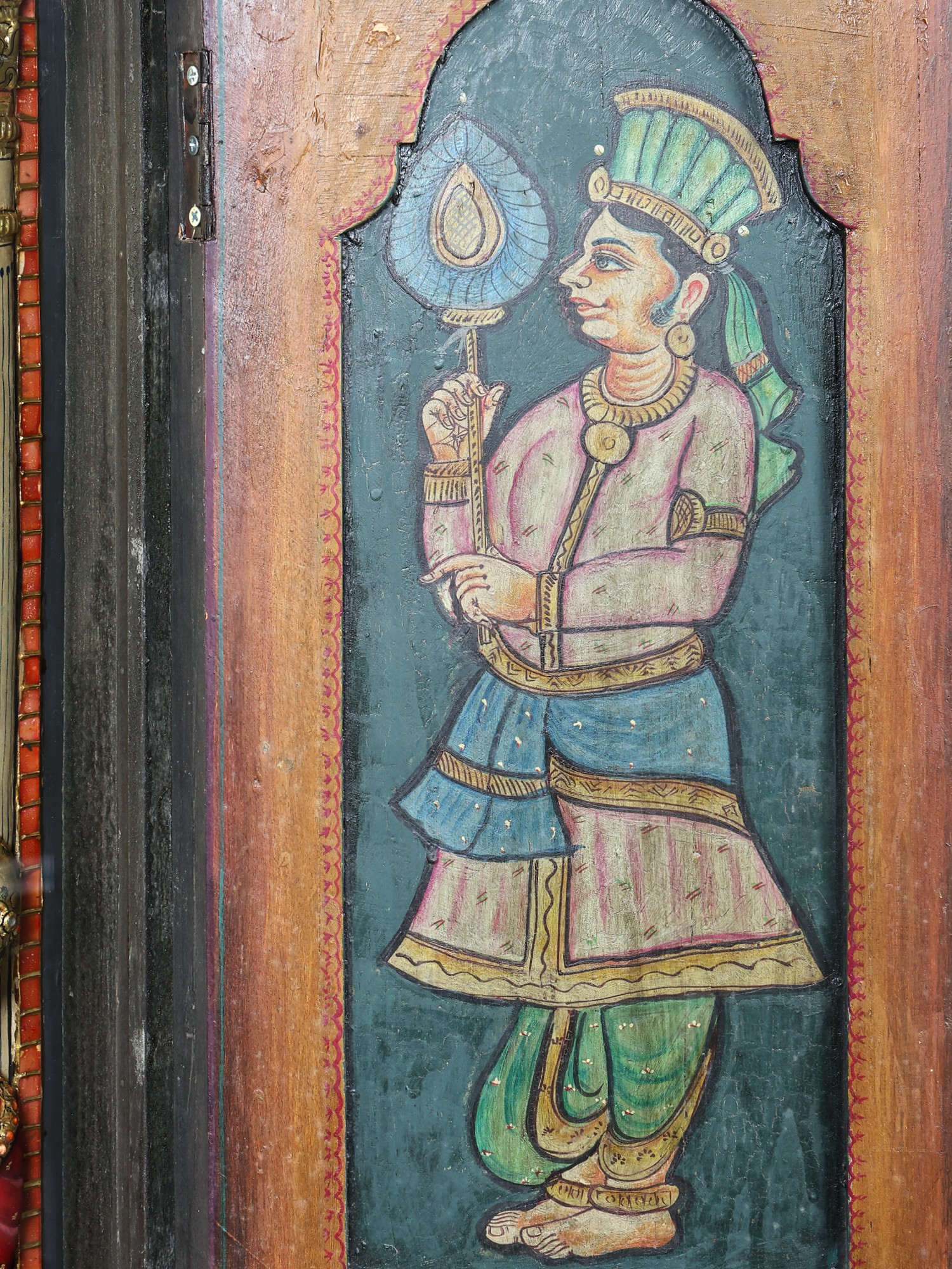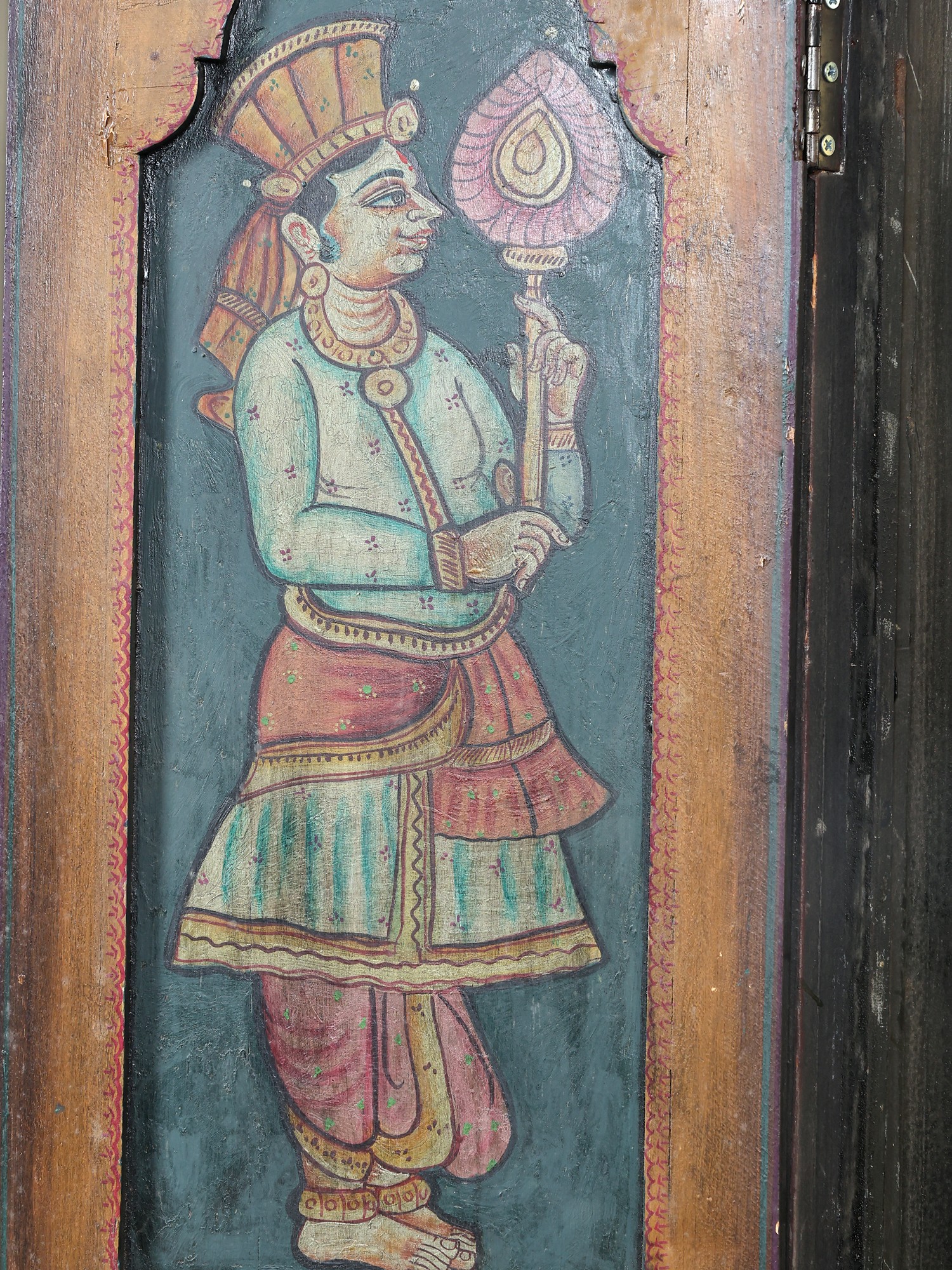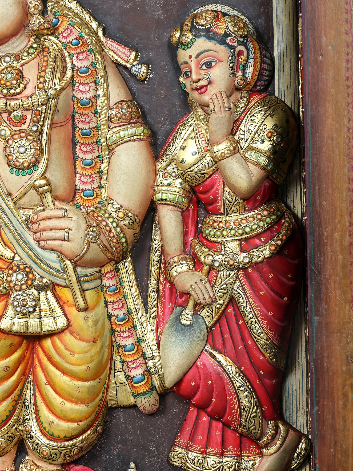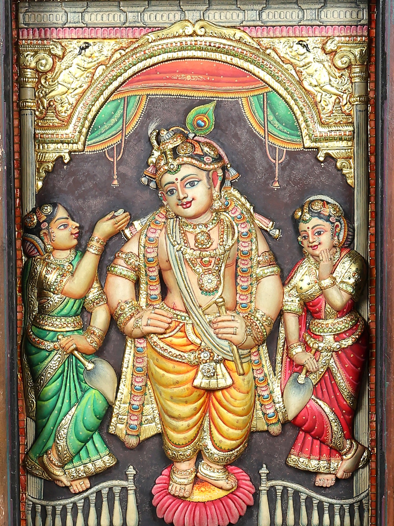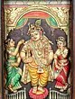 Standing Lord Krishna with Rukmini | 24 Karat Gold Work | Embossed Tanjore Painting with Vintage Frame