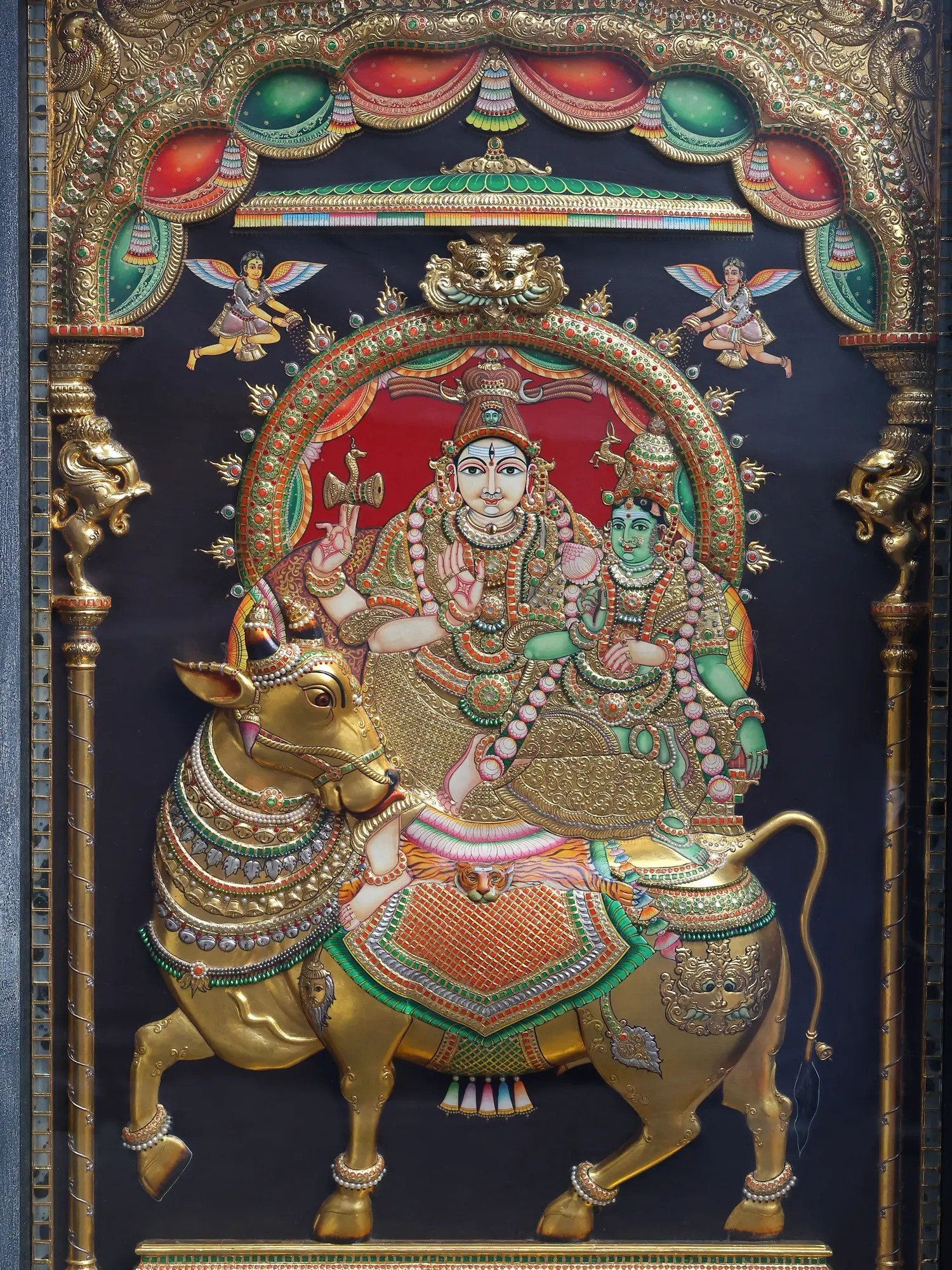 This artwork is a magnificent example of the Tanjore painting style, a classical South Indian art form originating from the town of Thanjavur. Tanjore paintings are renowned for their richness, vibrant colors, and the use of precious materials like gold leaf, diamonds, and other precious gems. Historically, these paintings adorned the walls of temples and palaces, serving as devotional objects and visual aids for storytelling. The embossed nature of the artwork adds a tactile dimension, giving depth and life to the divine figures and Nandi's powerful form. The presence of Lord Shiva and Parvati on Nandi holds profound significance. Nandi, Shiva's vahana (mount), is not merely a vehicle but also a devoted attendant and guardian, symbolizing strength, loyalty, and dharma. The Pradosha period, a sacred time observed by Shiva devotees, is particularly associated with the worship of Shiva and Parvati, and this artwork captures the essence of this auspicious time, inviting divine blessings and spiritual harmony into the viewer's space. The grand scale of this piece ensures it becomes a captivating focal point, exuding an aura of sanctity and timeless beauty.