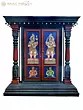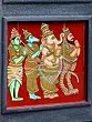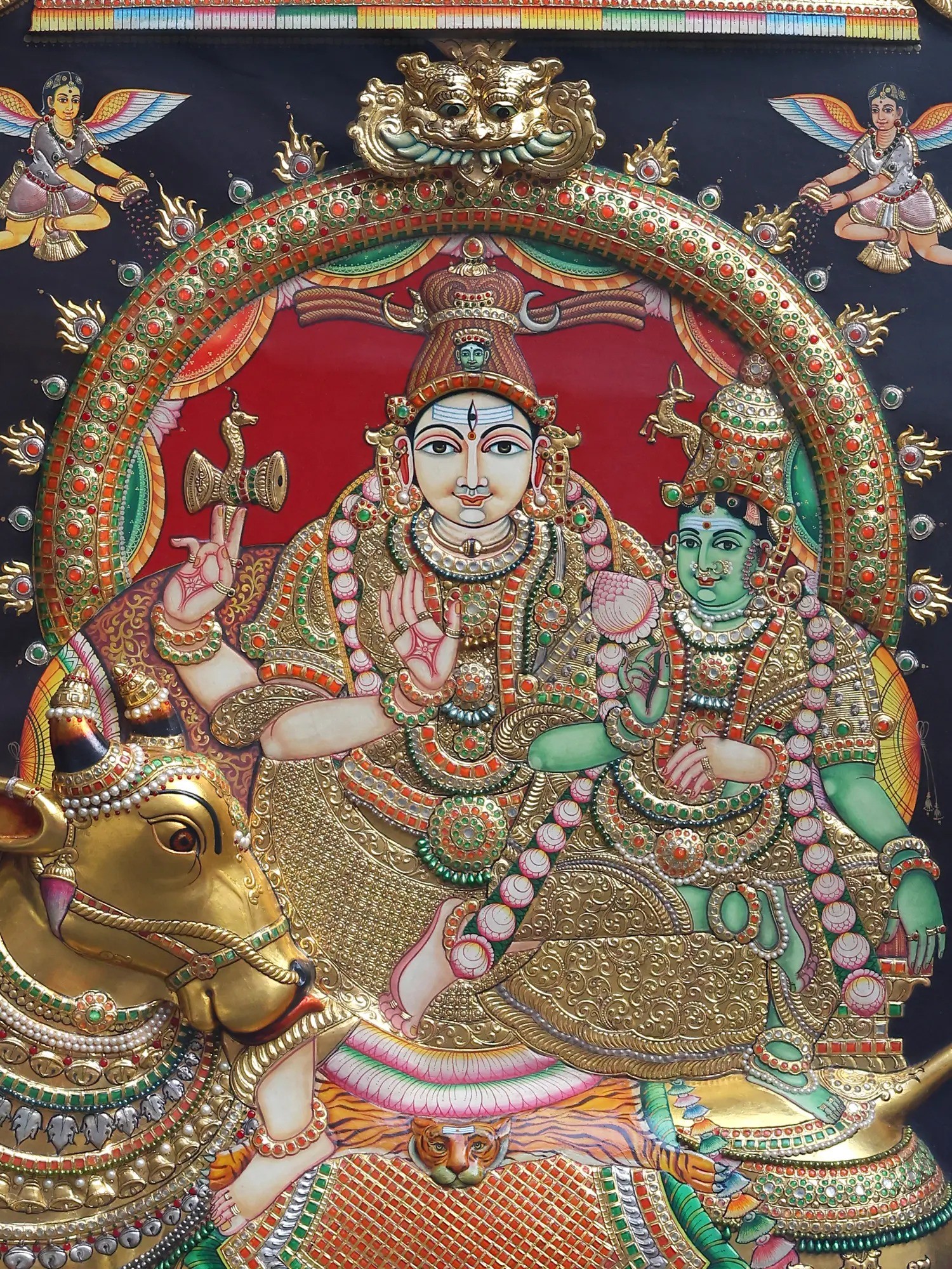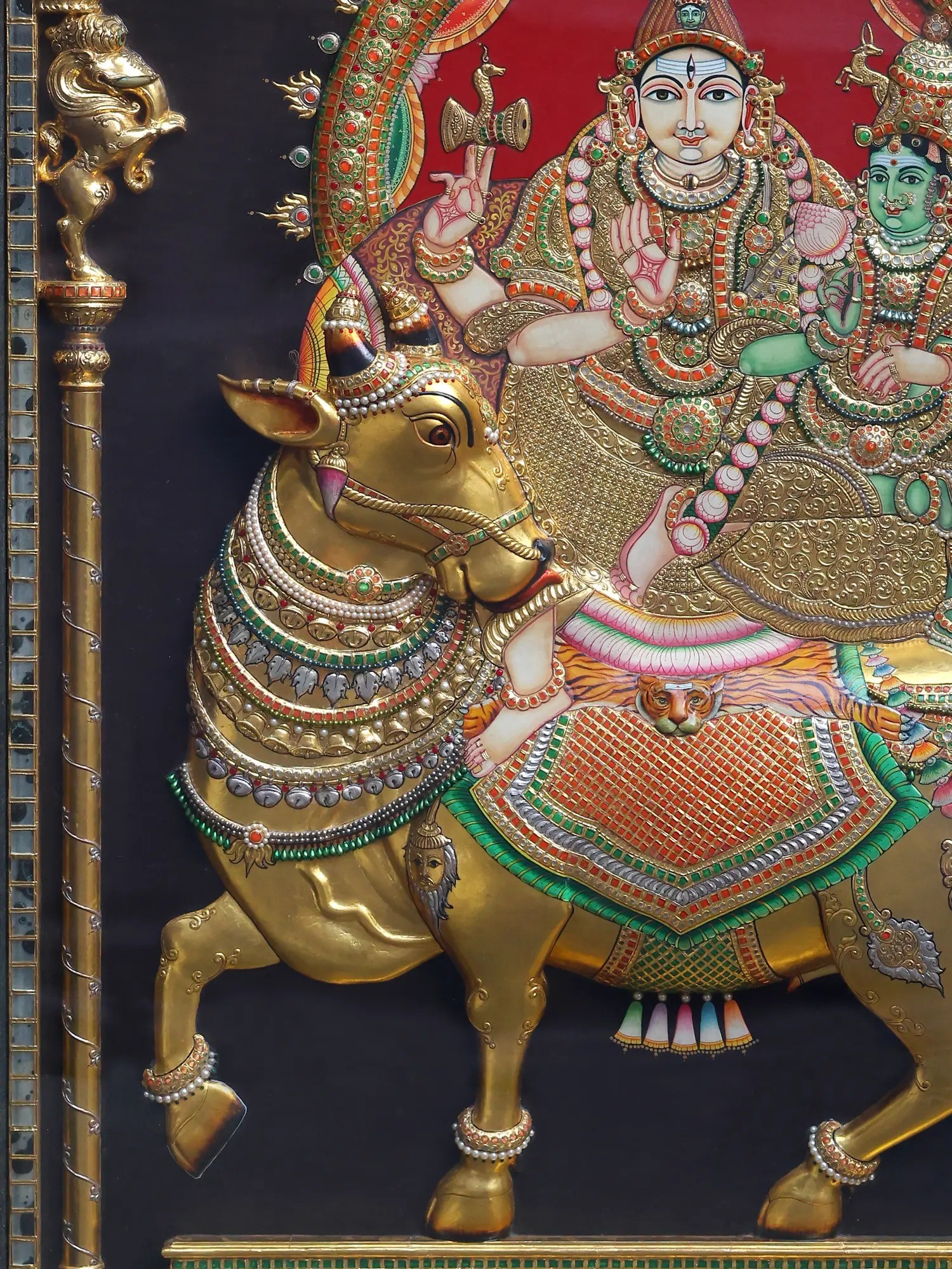 This grand artwork presents a magnificent depiction of Lord Shiva and Goddess Parvati, gracing the celestial bull, Nandi. The central panel, a testament to exquisite craftsmanship, showcases the divine couple seated regally on Nandi's humped back. Lord Shiva, the destroyer and transformer, is adorned with traditional iconography, while Goddess Parvati, his consort and the embodiment of cosmic energy, radiates serene beauty. The artwork is rendered with traditional colors, rich and vibrant, enhancing the divine aura of the deities. Adding to its opulence and sacredness, intricate patterns and details are highlighted with 24-karat gold work, catching the light and bestowing a divine radiance upon the entire composition.