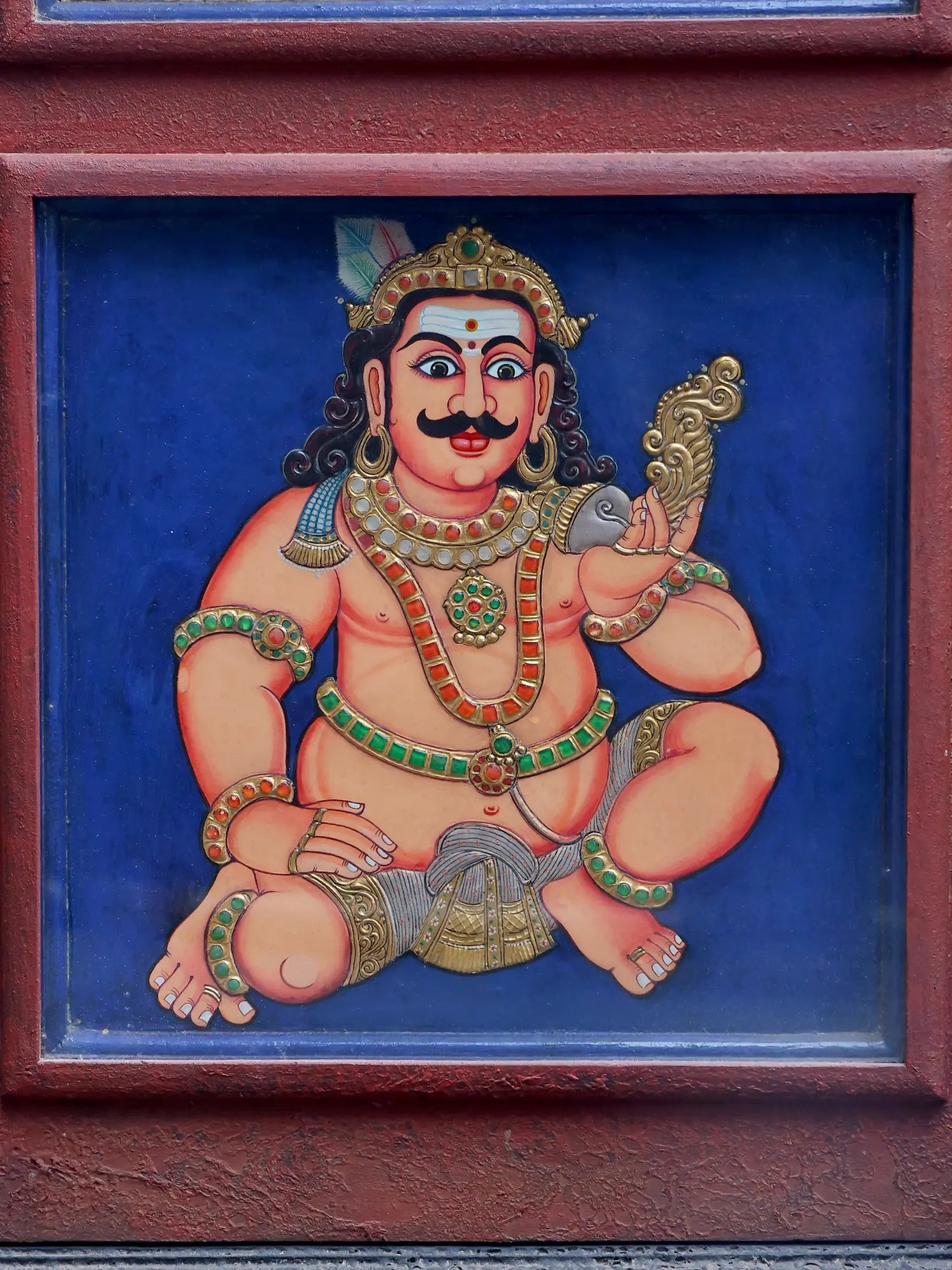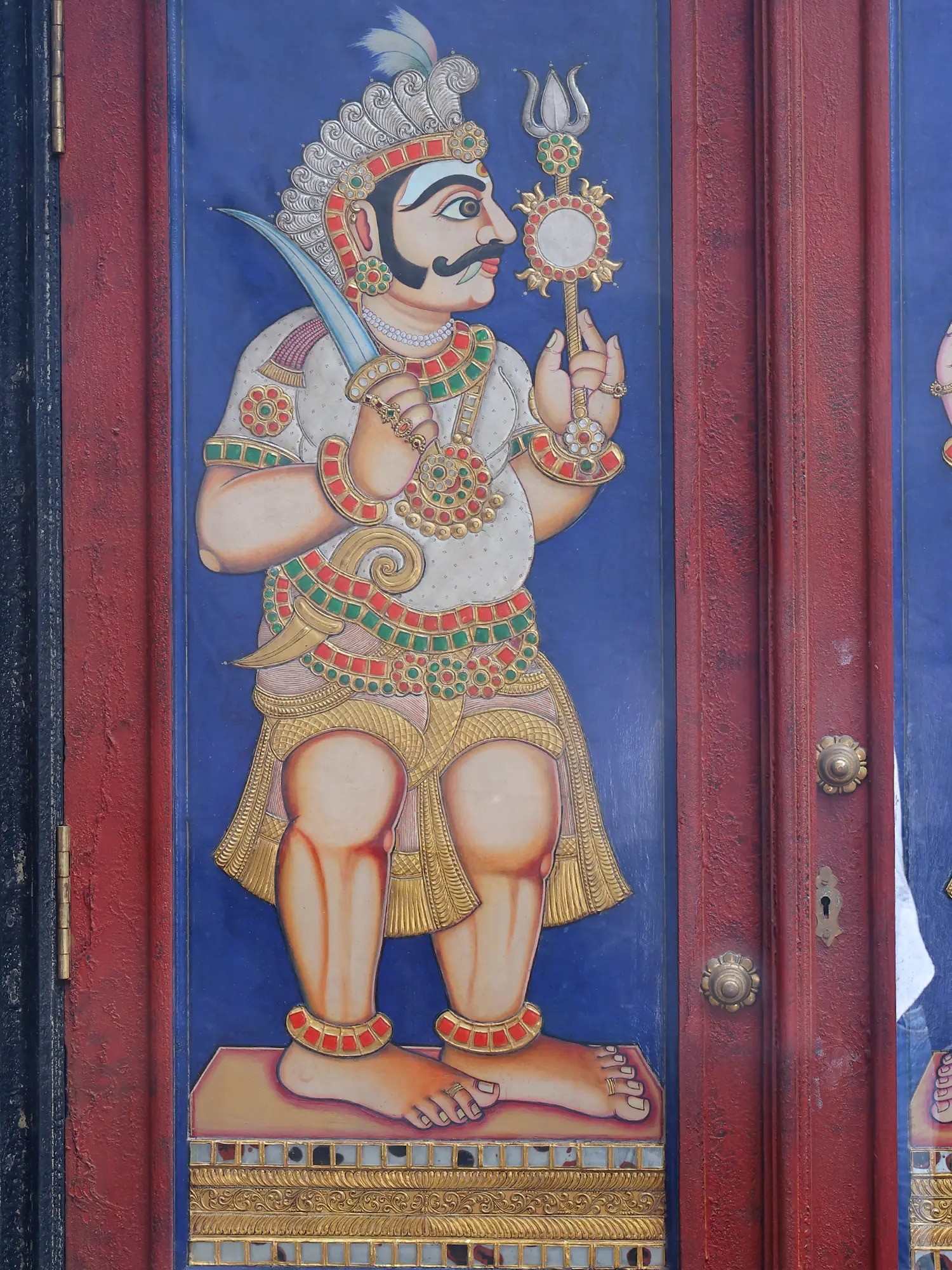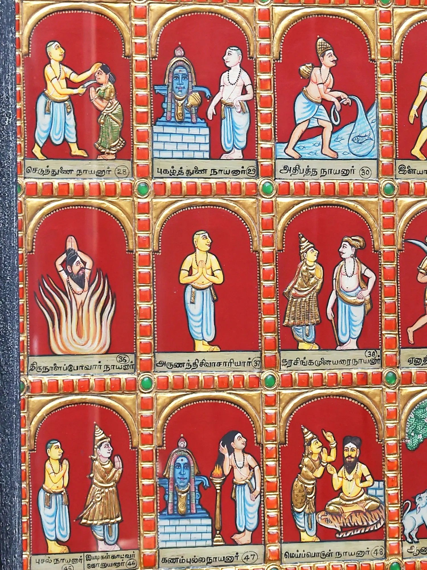 This monumental eight-foot Tanjore painting, with its scale and sacred theme, blends art with architecture. Standing in front of it, you become a part of its universe; the experience of Darshana engulfs and invites you, and with that, momentarily, the boundary between viewer and viewed disappears.