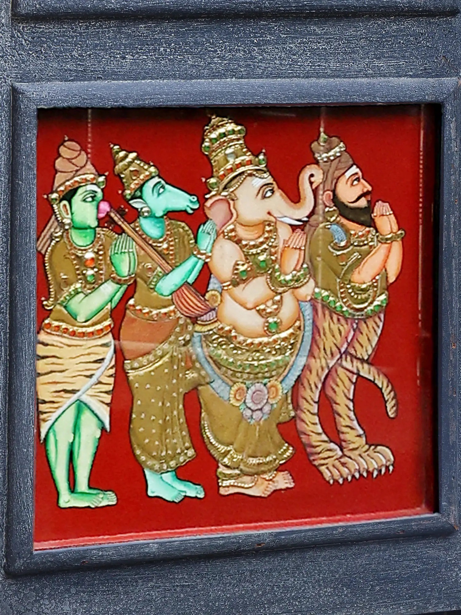 At the centre stands the Pradosha Murti, Shiva seated with goddess Parvati upon a resplendent Nandi. The bull’s lifted foreleg and turn of the head introduce a rare moment of dynamism, animating the divine tableau. The pair is enshrined within a glittering kirtimukha arch and further framed by a larger architectural arch resting on yali pillars, its opulence heightened by the radiant use of 24-karat gold, creating layered visual depth in the Tanjore panel.