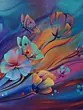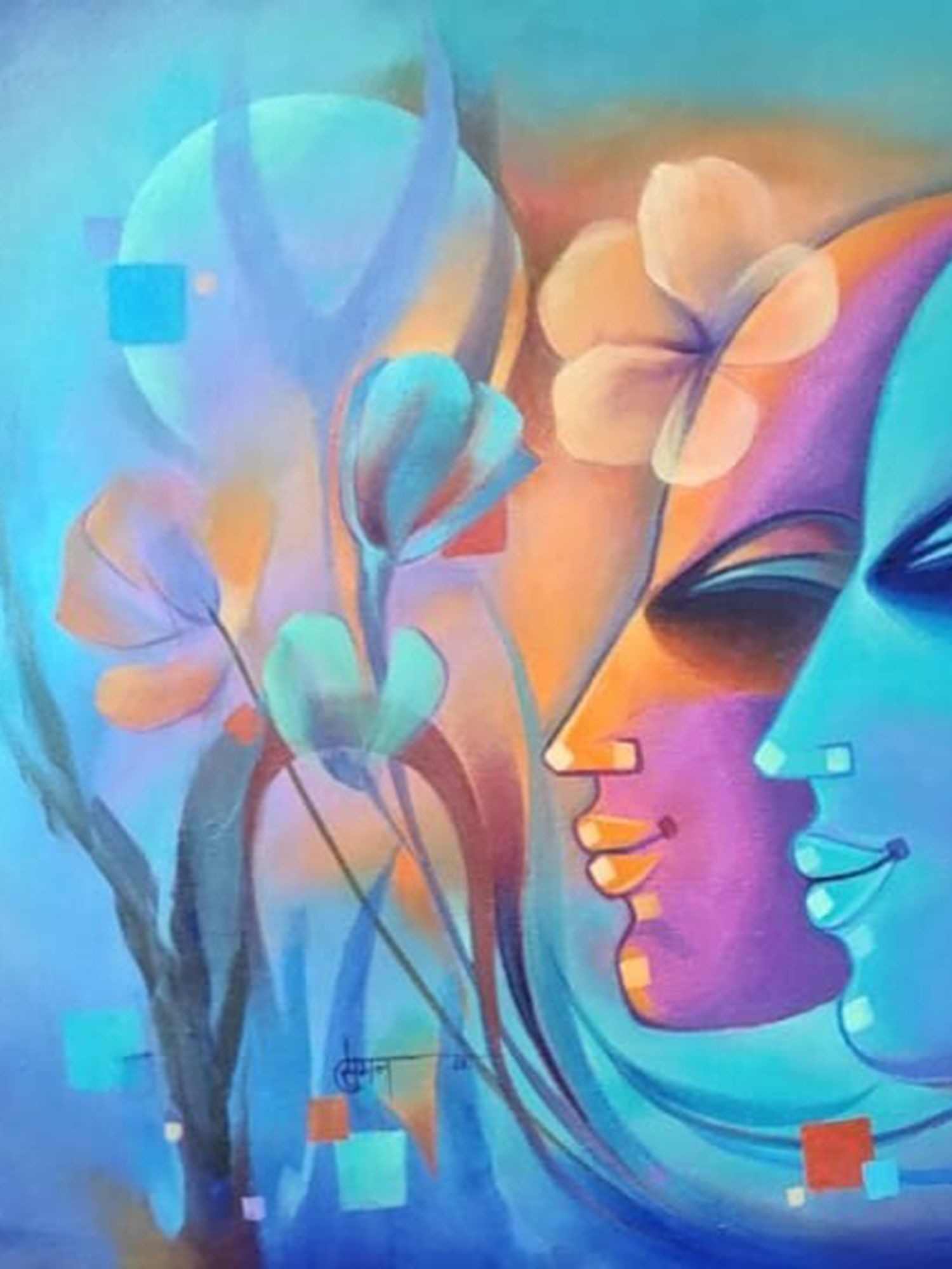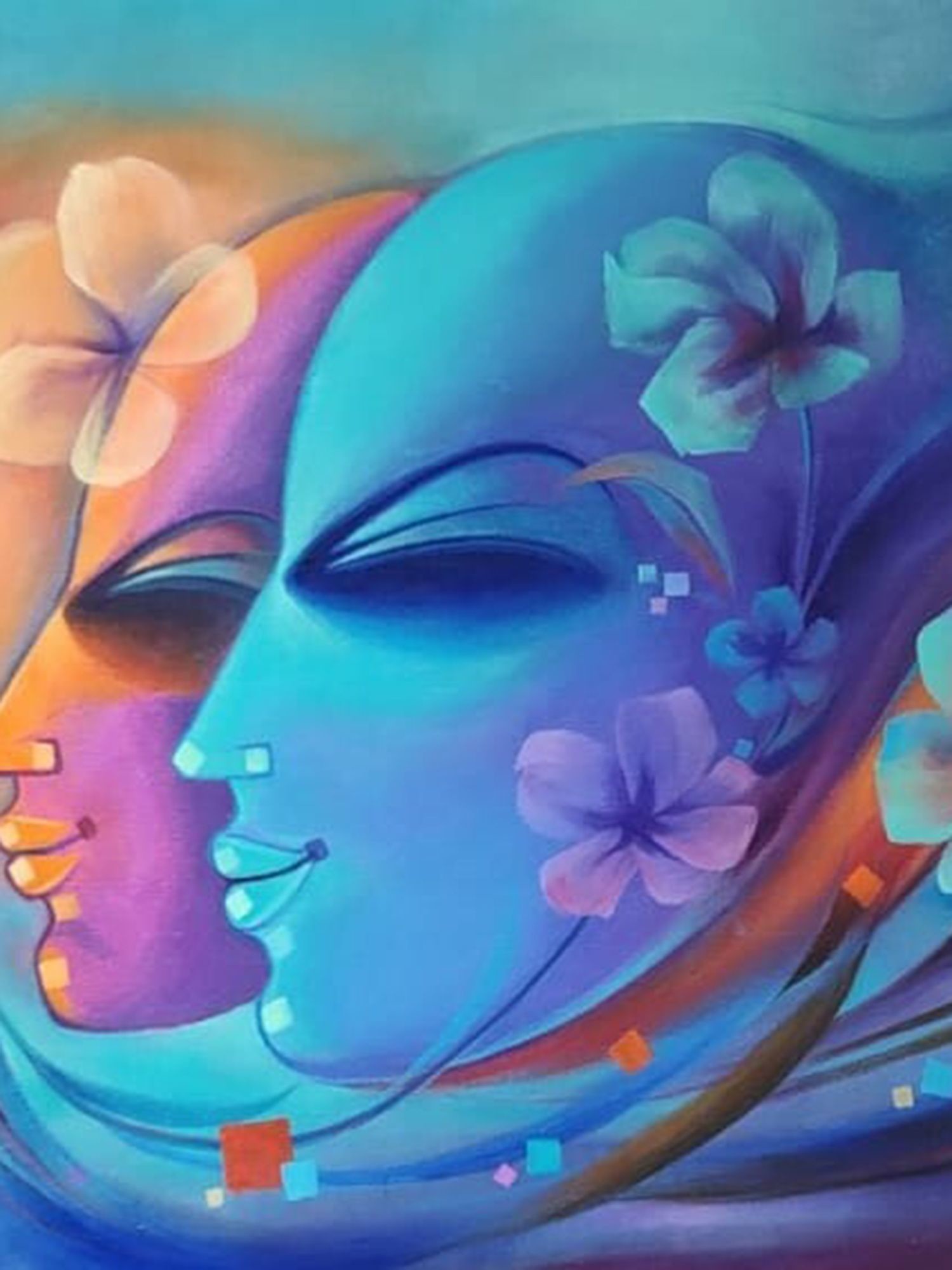 Features abstract depictions of human faces intertwined with floral elements, rendered in vibrant acrylics.