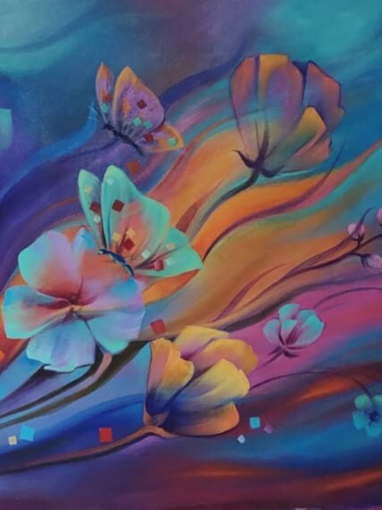 A striking piece of figurative and abstract art, suitable for adding a touch of color to any space.