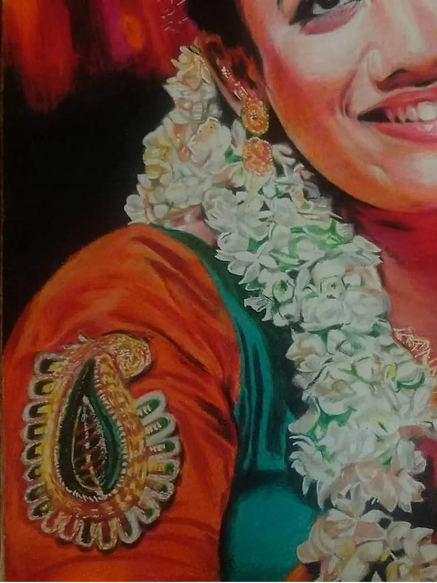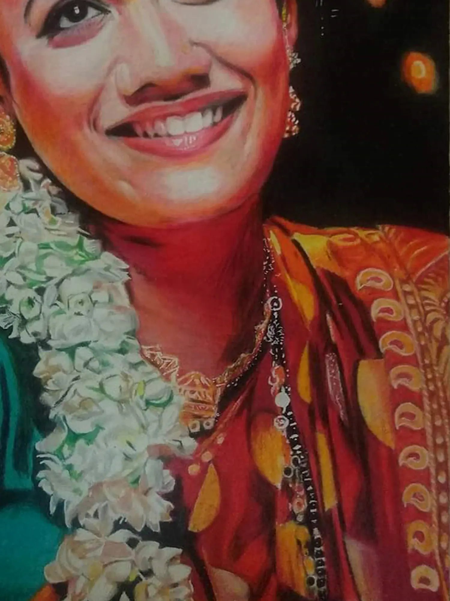 This artwork invites the viewer into a moment of serene beauty, captured through the intricate strokes of pencil. The subject, adorned in traditional Indian attire, exudes a warmth and joy that is both captivating and comforting. Her radiant smile and the gentle curve of her eyes convey a sense of inner peace and contentment. The artist has skillfully employed color pencils to bring out the texture of the fabric, the delicate details of her jewelry, and the soft glow of her skin. The subject's clothing hints at a celebration, perhaps a wedding or festive occasion. The vibrant orange and reds of her sari, embellished with a traditional paisley design, contrast beautifully with the cool teal of her blouse. A garland of white flowers drapes gracefully around her neck, adding to the overall aura of purity and auspiciousness. These elements are not merely decorative; they are deeply symbolic, representing prosperity, good fortune, and the celebration of life's important milestones.