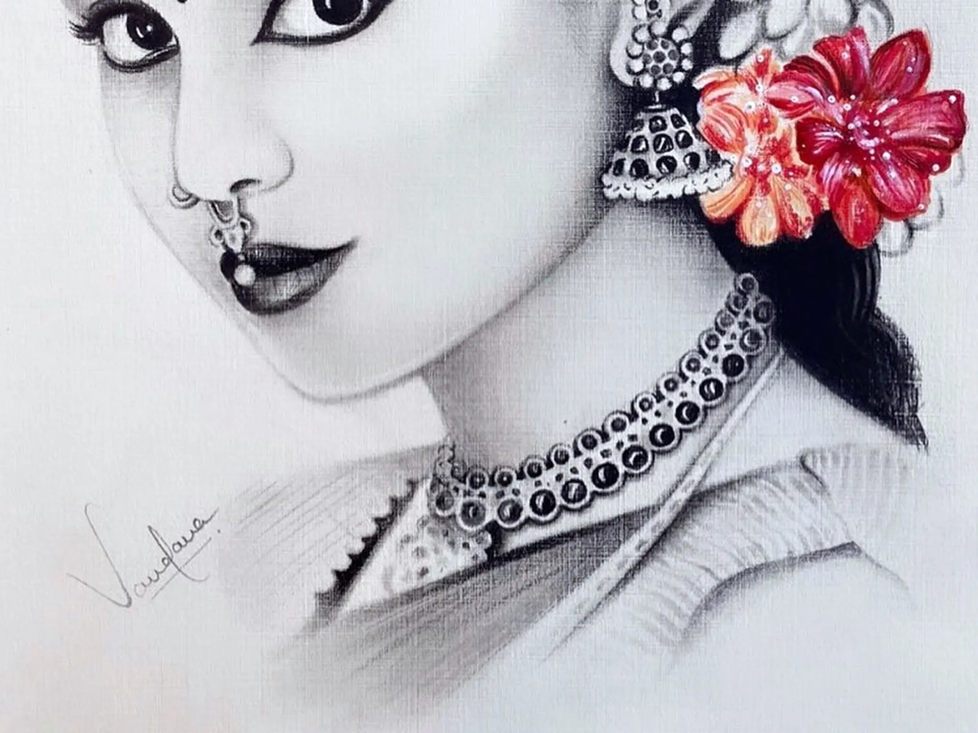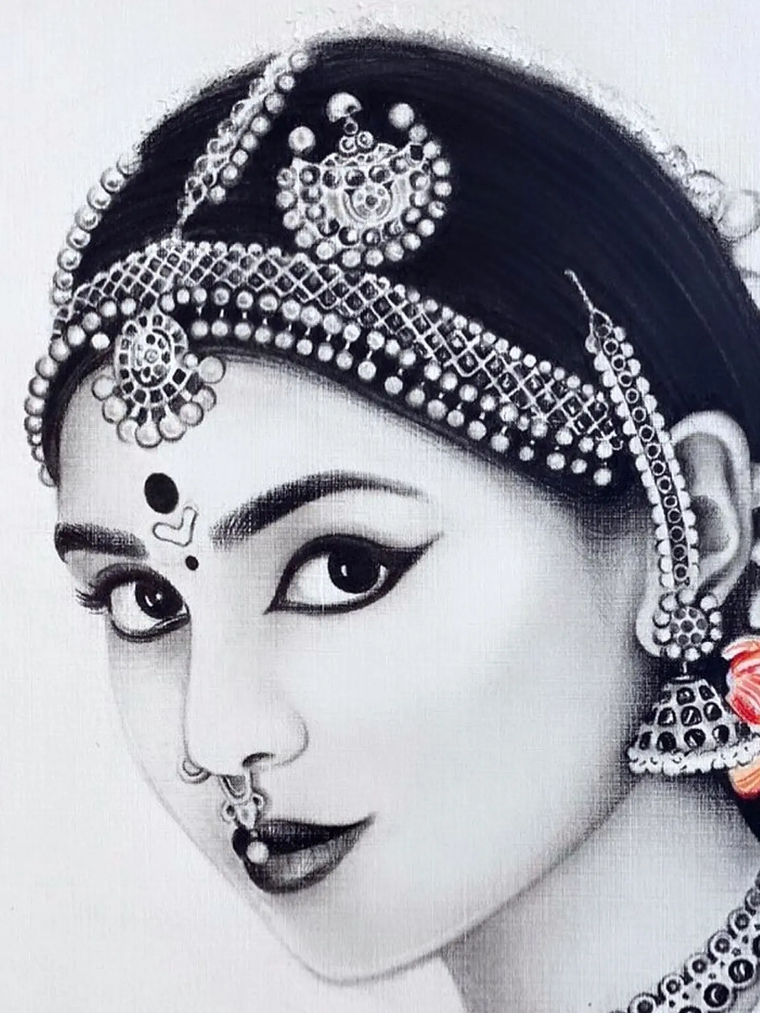 The pencil sketch of a South Indian bride exudes timeless elegance and cultural richness, capturing the details of traditional attire and bridal adornments with exquisite precision. From ornate jewellery to her gorgeous features, the sketch celebrates the timeless allure and cultural significance of South Indian bridal aesthetics. Through bridal finery, the bride's radiant presence radiates with joy and anticipation, inviting viewers to witness the sacred union of love and tradition.
