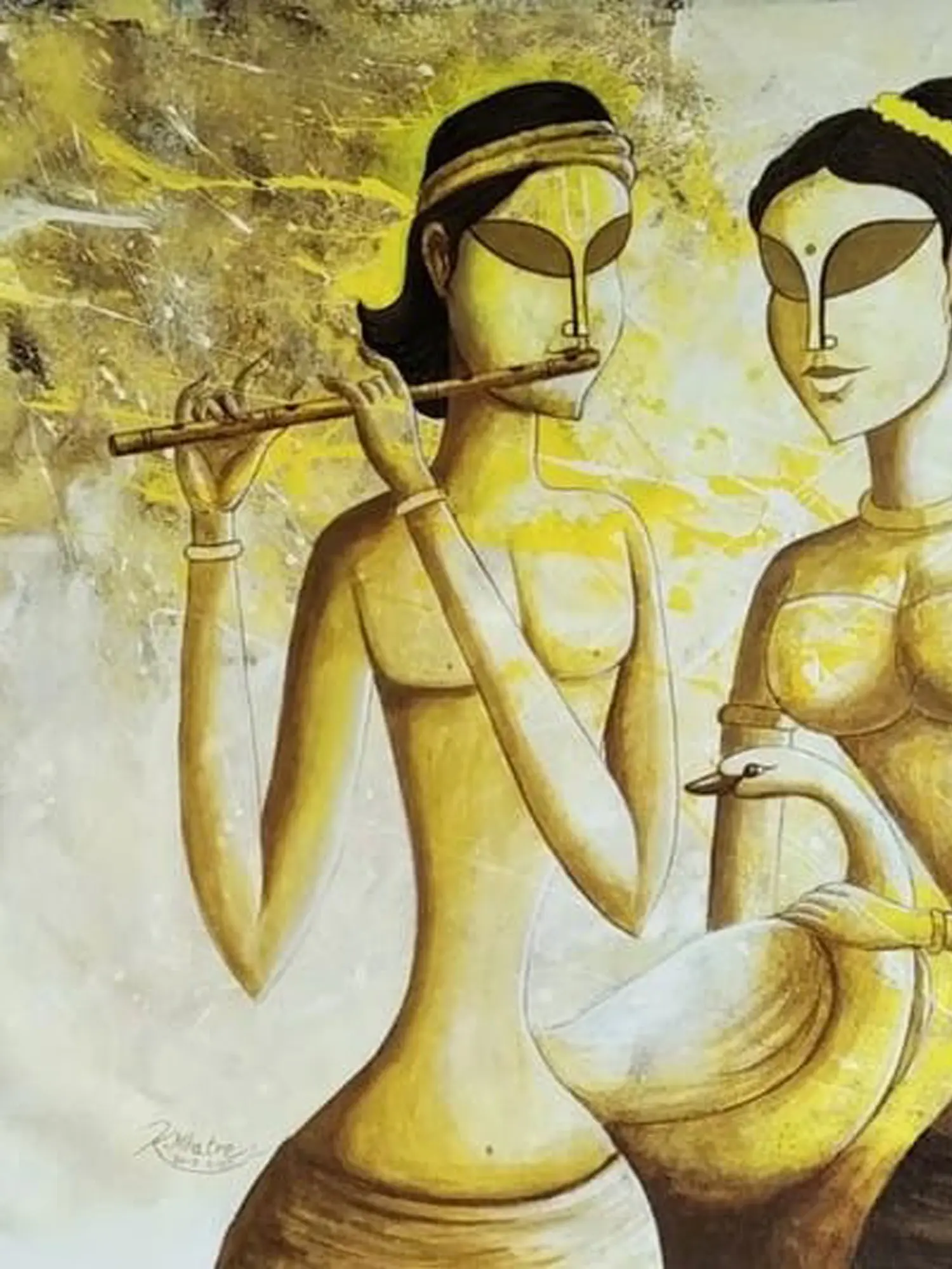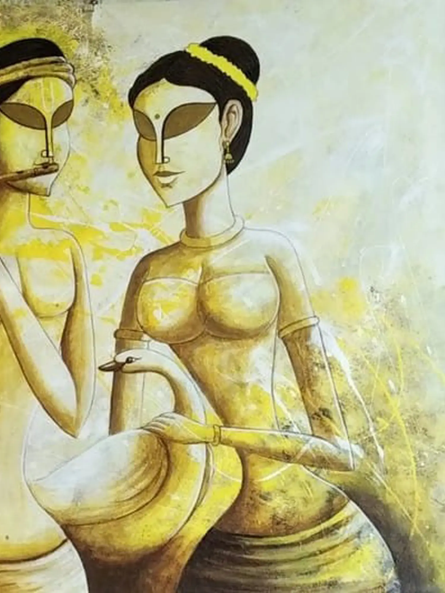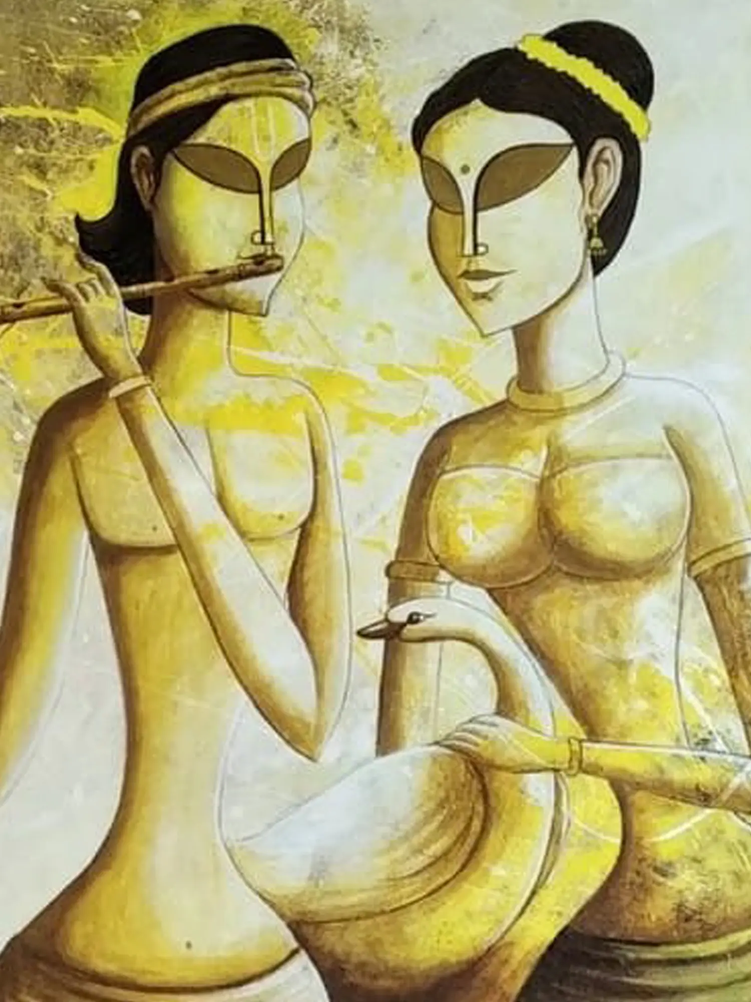 The composition presents the divine couple in a moment of serene harmony, their forms gracefully rendered with stylized features that convey a sense of spiritual elegance. The harmonious palette of earthy yellows and subtle creams creates an aura of warmth and tranquility, drawing your eye across the 26-inch by 32-inch canvas. You’ll find yourself captivated by the expressive simplicity and the delicate balance of light and shadow.