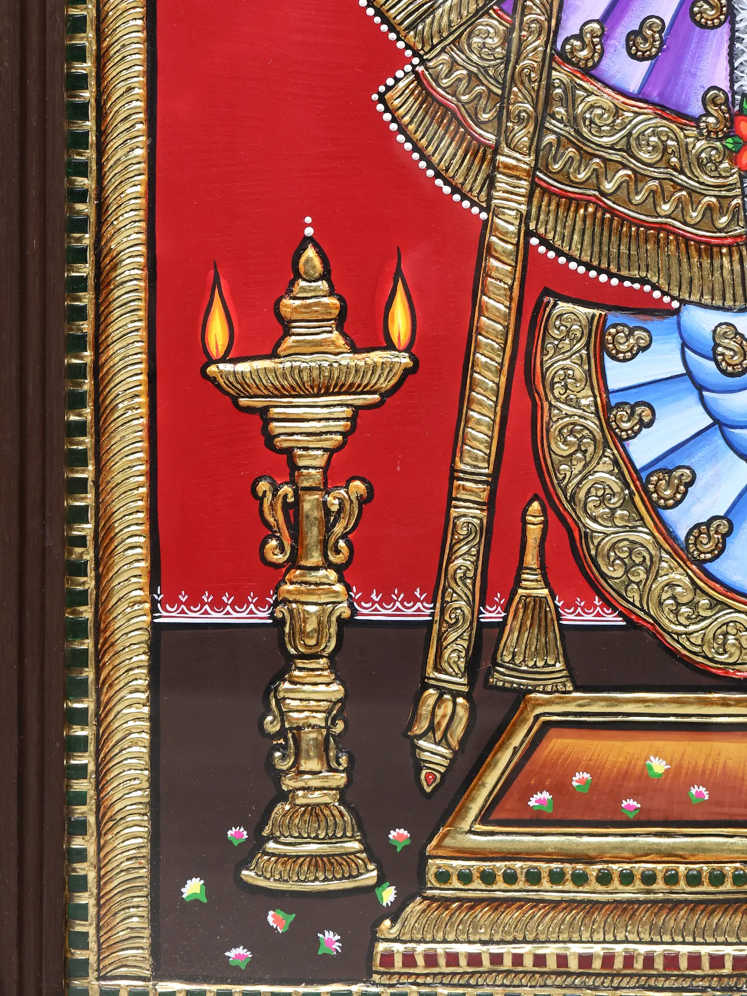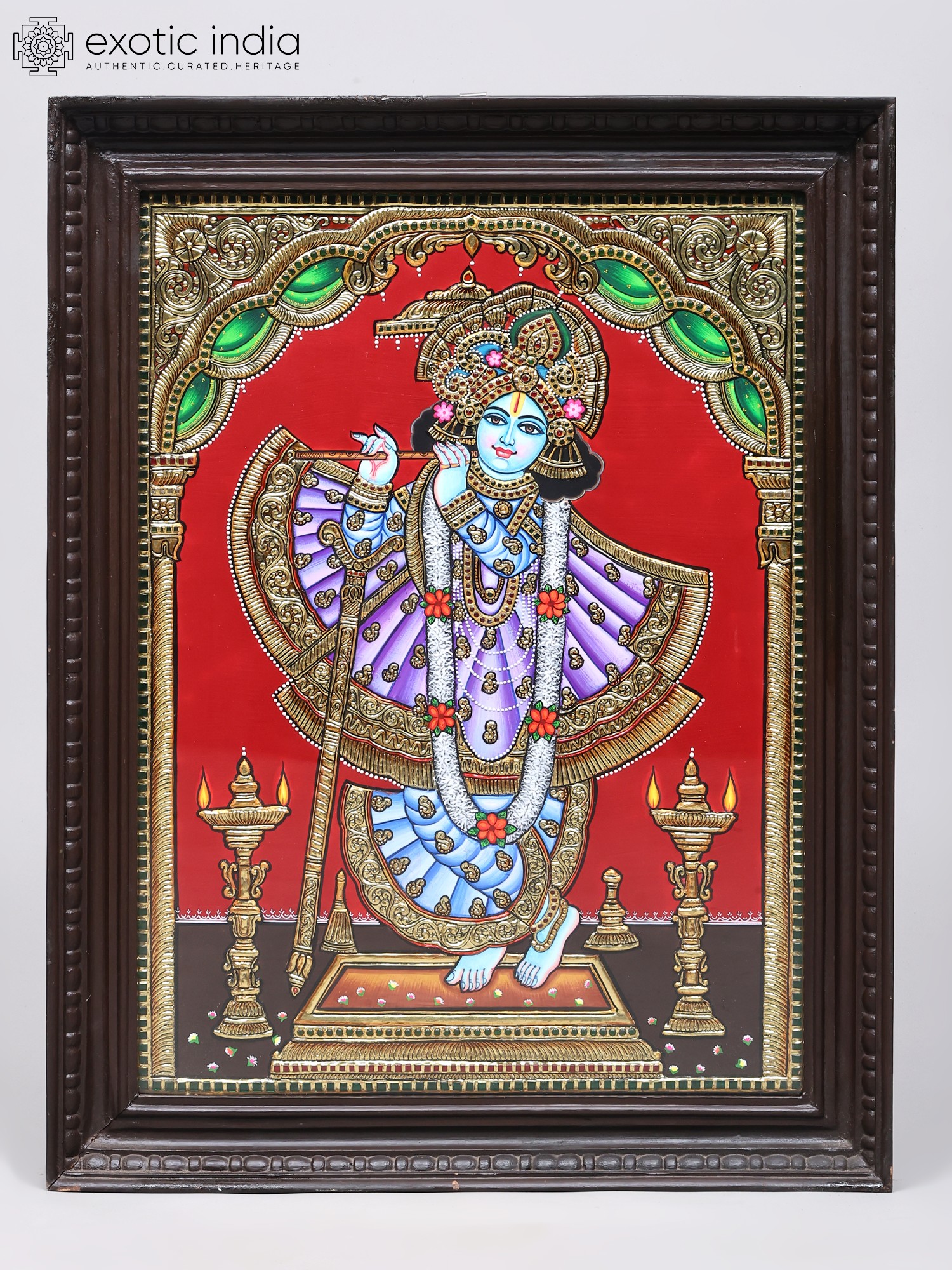Lord Krishna, the eighth avatar of Vishnu, is a central figure in Hindu mythology, celebrated for his wisdom, charm, and divine interventions. Tales of his childhood exploits, his teachings in the Bhagavad Gita, and his role in the Mahabharata epic have captivated hearts and minds for millennia. This painting evokes the rasa of *madhurya*, the sweetness of divine love, often associated with Krishna's interactions with the Gopis. The presence of traditional oil lamps flanking the deity further enhances the devotional atmosphere, reminiscent of temple rituals and the illumination of inner wisdom. The distinctive style of Tanjore painting, with its raised gesso work and inlaid gemstones (though not explicitly present in this rendition, the technique is implied by the raised gold contours), aims to create a tactile and visually rich experience, mirroring the divine richness of the subject matter. The very act of creating a Tanjore painting is a form of meditation and devotion for the artist. Each detail, from the delicate rendering of Krishna's hand holding the flute to the elaborate ornamentation of his crown, is executed with utmost precision and reverence. The result is an artwork that transcends mere aesthetics, serving as a conduit for spiritual connection and a reminder of the divine presence in our lives. This framed Tanjore painting is not just a decorative piece; it is a sacred artifact, imbued with the spirit of devotion and the timeless beauty of Indian art.