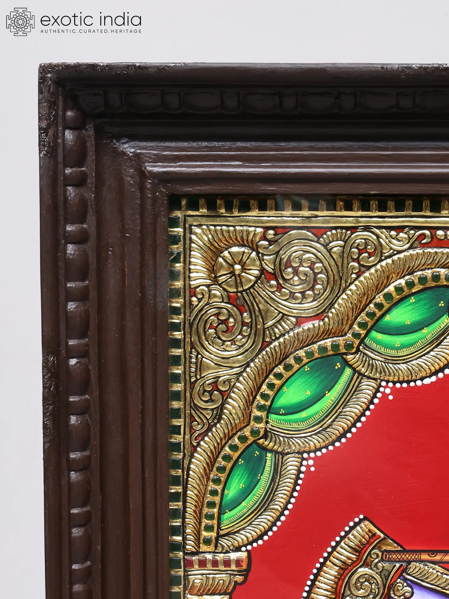 This exquisite Tanjore painting captures the divine essence of Lord Krishna, the beloved deity of love, compassion, and divine play. Rendered with the traditional techniques of Thanjavur art, the painting is a testament to centuries of artistic heritage, where every stroke and embellishment carries deep spiritual significance. The central figure of Krishna is depicted in his iconic form, poised with his divine flute, ready to enchant the world with his celestial music. His gentle smile and serene expression invite contemplation and devotion, making this artwork a focal point for any sacred space or art collection. The artistry of Tanjore paintings is renowned for its opulence and intricate detail. This piece is no exception, featuring a lavish application of 24-karat gold work, which lends a radiant aura to the divine subject. The gold is not merely decorative; it symbolizes purity, divinity, and eternal light. The vibrant traditional colors, meticulously applied, bring the scene to life, from the rich crimson backdrop that signifies auspiciousness and passion, to the soft hues of Krishna's attire, adorned with floral motifs. The intricate borders and architectural elements framing Krishna are also highlighted with gold, adding depth and grandeur to the composition.