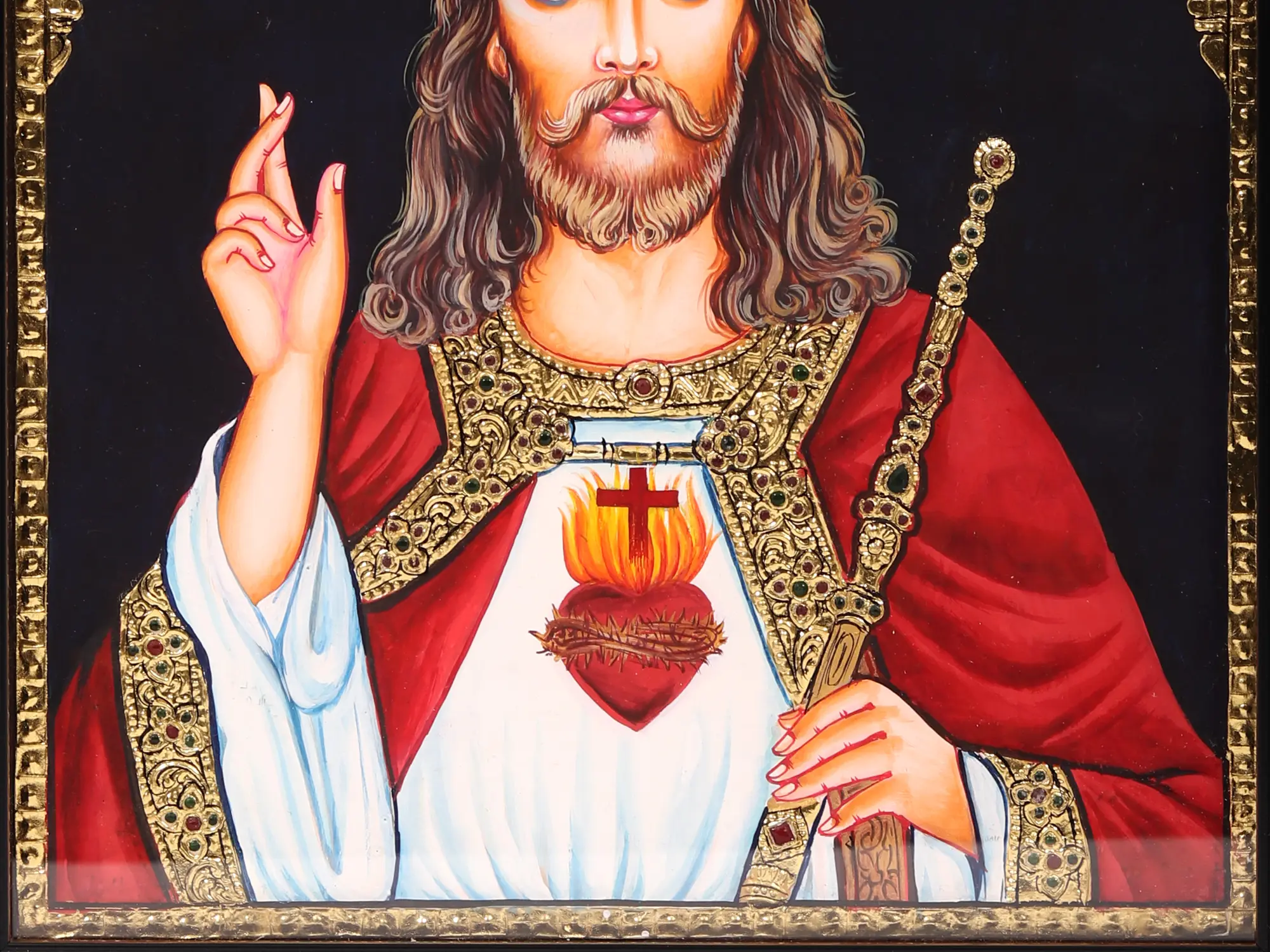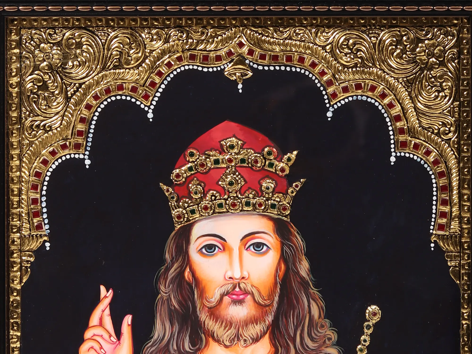 This Tanjore painting holds within the profound symbolism of Jesus Christ, a portrayal of divine love and sacrifice that resonates through the ages. It challenges us to explore the depths of our faith, compassion, and understanding of the human journey. With the divine staff in his hand, Jesus symbolizes guidance and protection for his followers. His sacred crown signifies his eternal sovereignty and divinity. This powerful image invites reflection on the profound symbolism of Christ as both shepherd and king.
