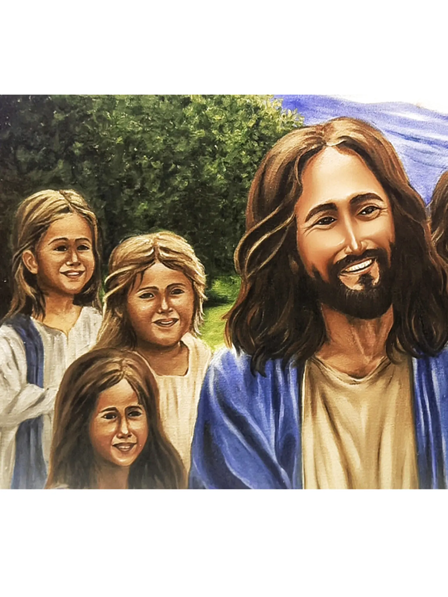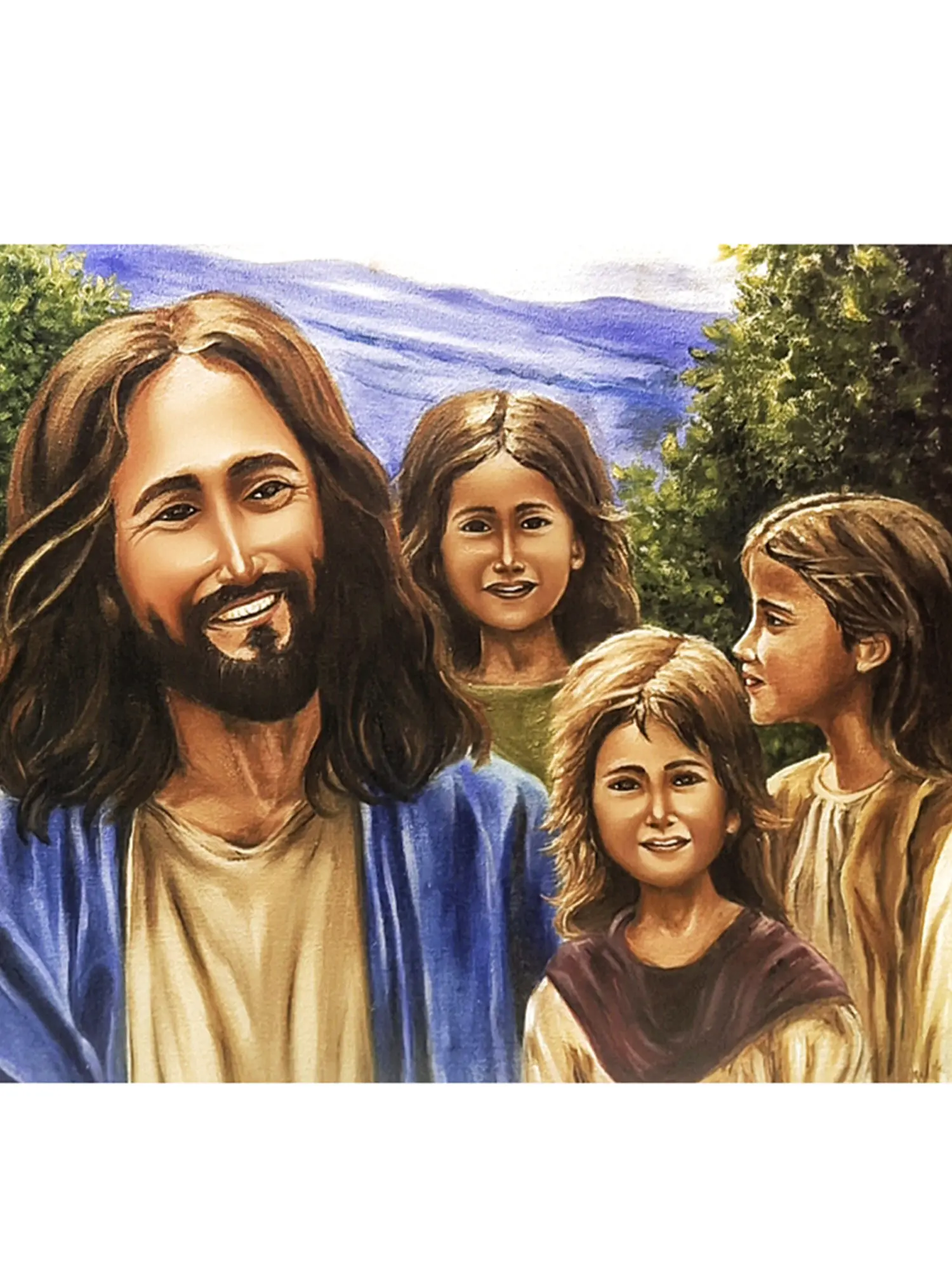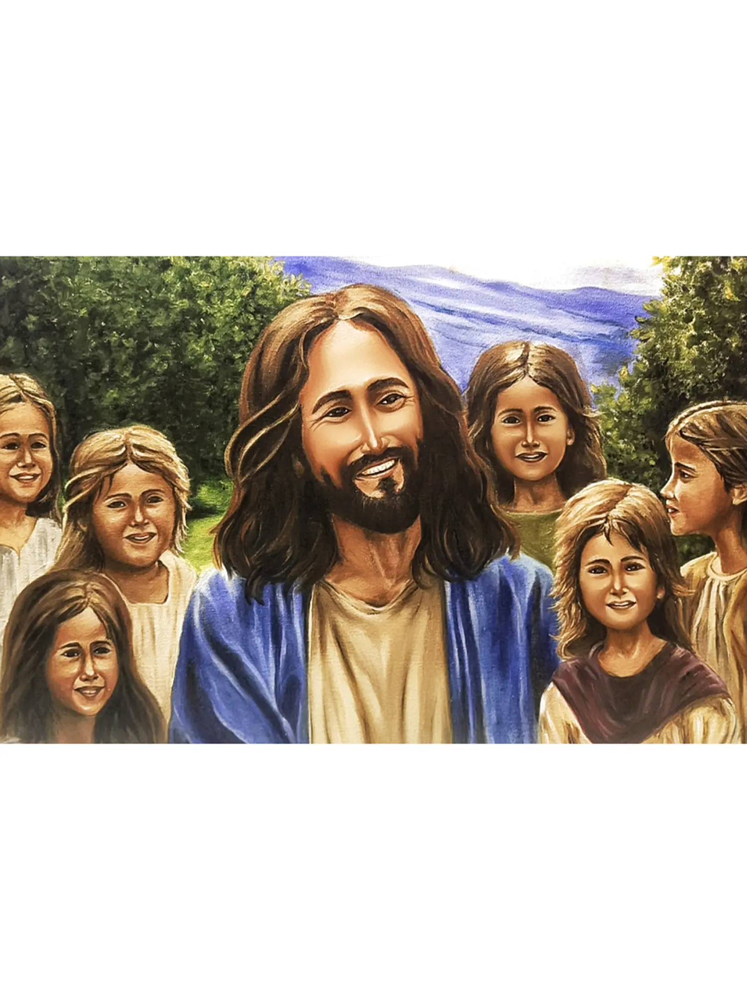 In Souvik Hazra's oil-on-canvas portrayal, Jesus radiates joy as he shares a blessed moment with children. The artist captures the divine connection through meticulous details, emphasizing Jesus's warm smile and the contagious happiness of the children. Wrinkles near the eyes signify genuine expressions of joy, creating a lifelike atmosphere.