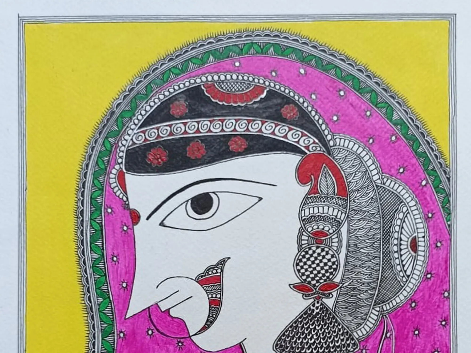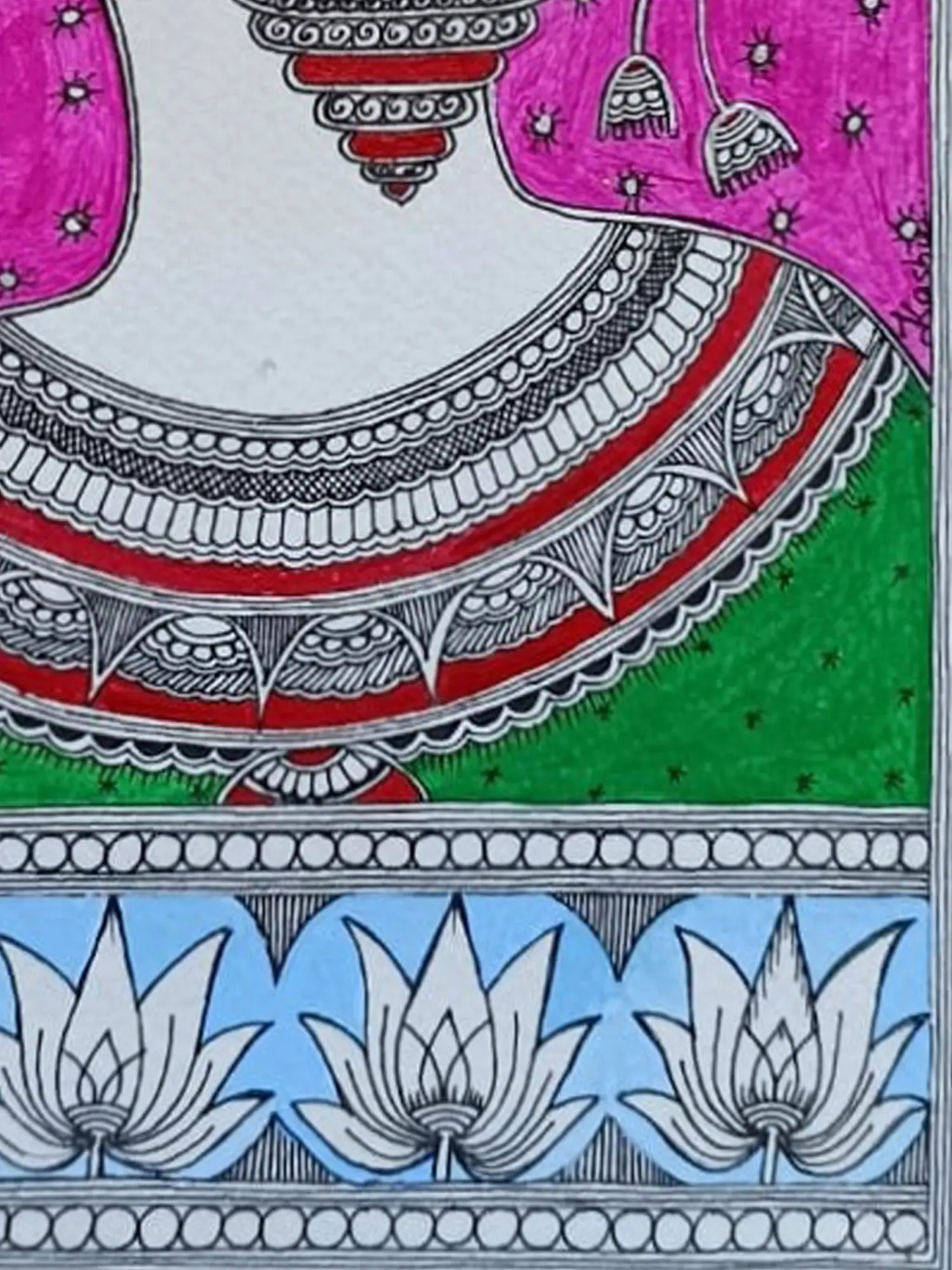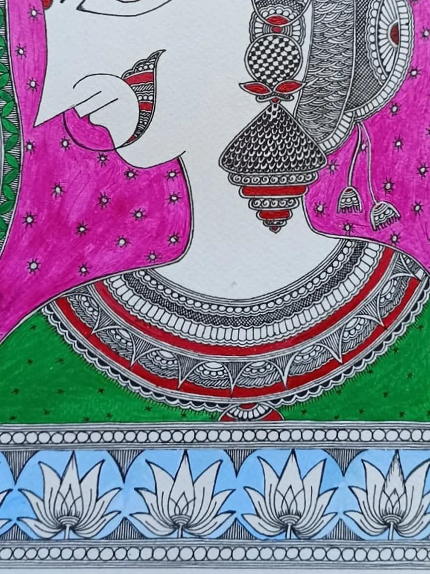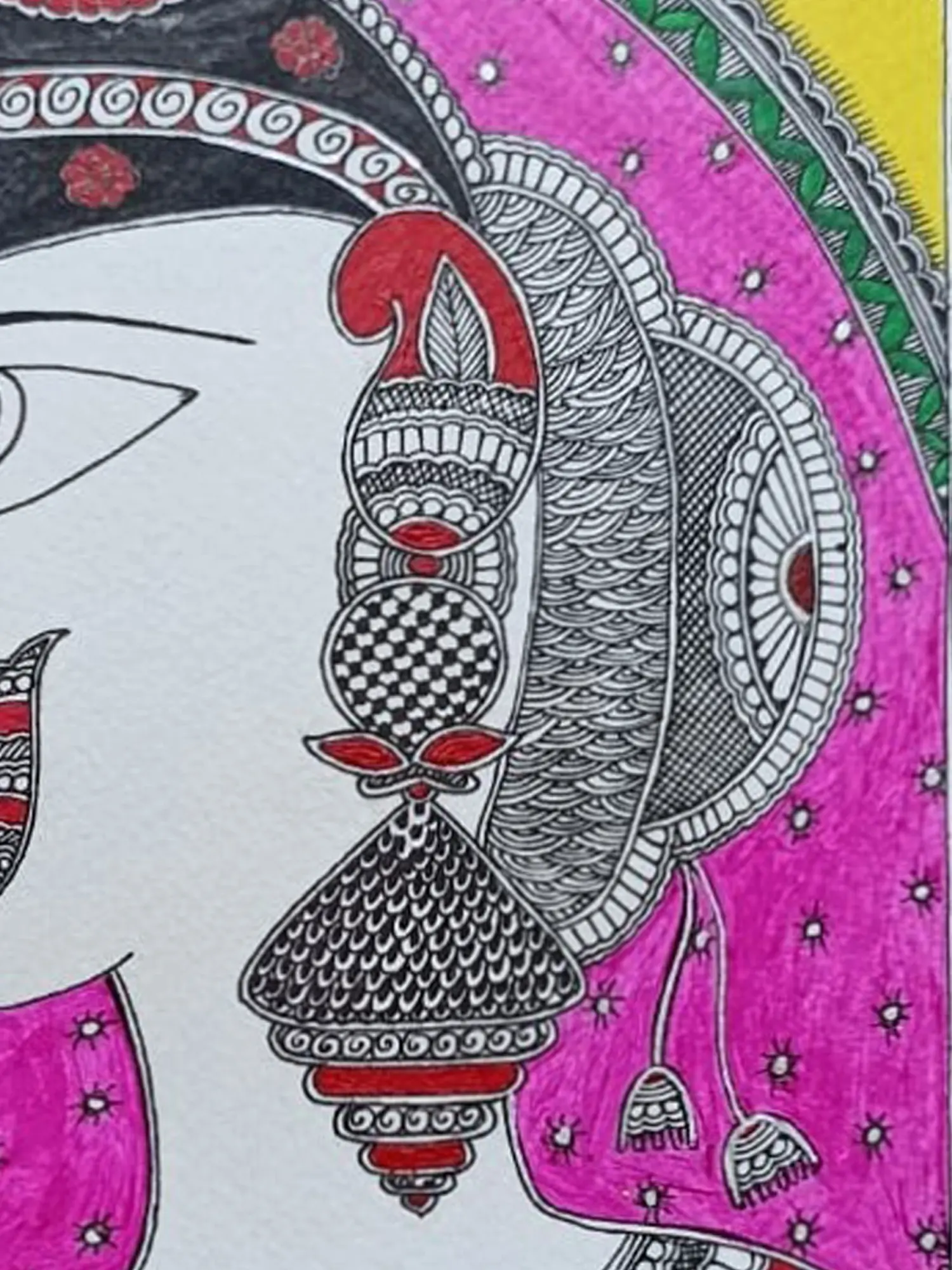 Madhubani is a regional art form that originated in Bihar's Mithila area. The paintings are spiritually significant and hold a distinct place in India's folk art scene. The best feature of this art style is that it can be utilized to express both classic and modern themes or issues. This Madhubani-style painting is an Acrylic on Paper by Abhilasha Raut and is titled "Jhumka Girl."Here in this painting Raut skillfully captures the essence of tradition and femininity. She uses the traditional pattern of Madhubani style to create an attractive image of a girl with big jhumkas.